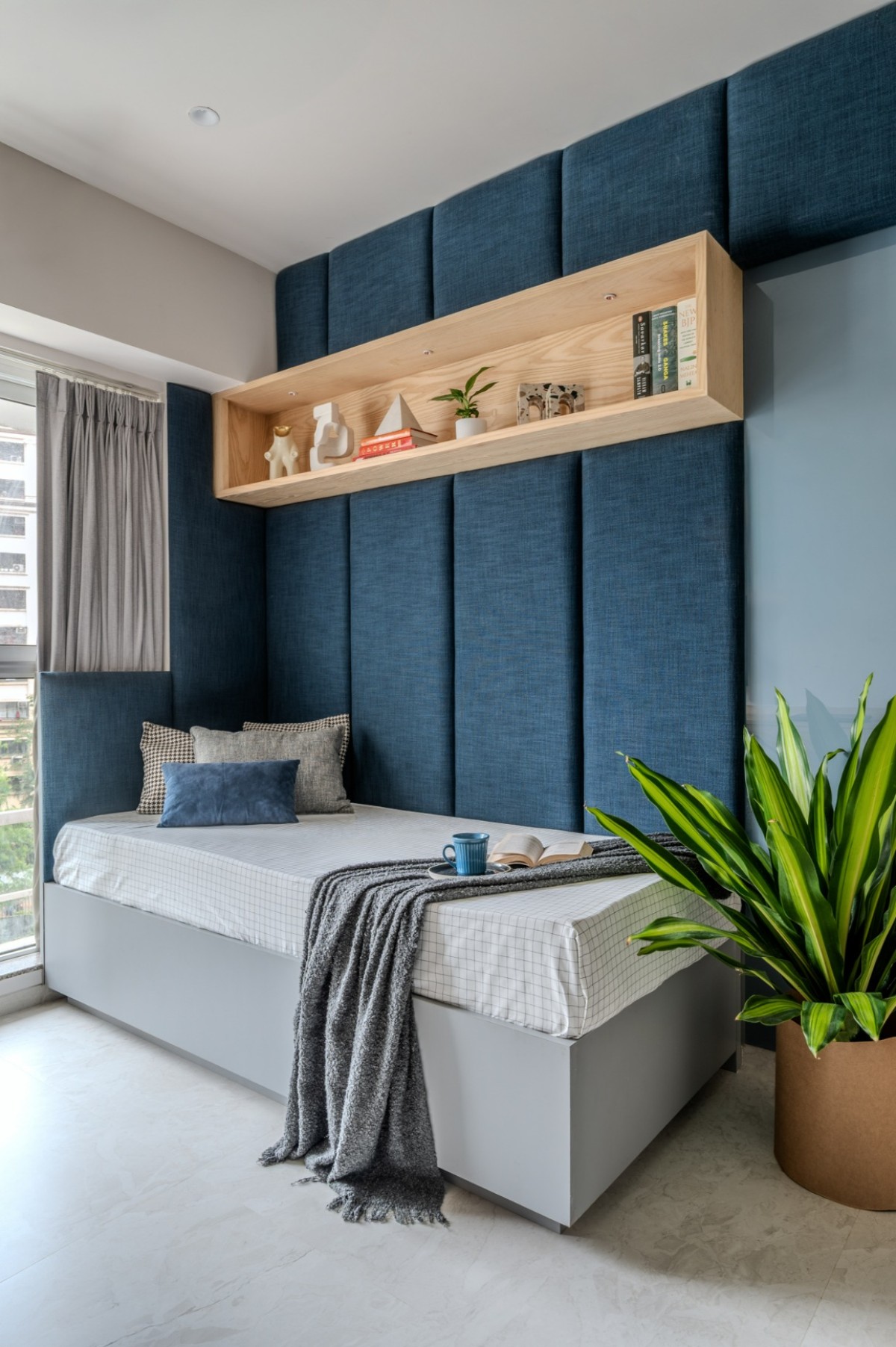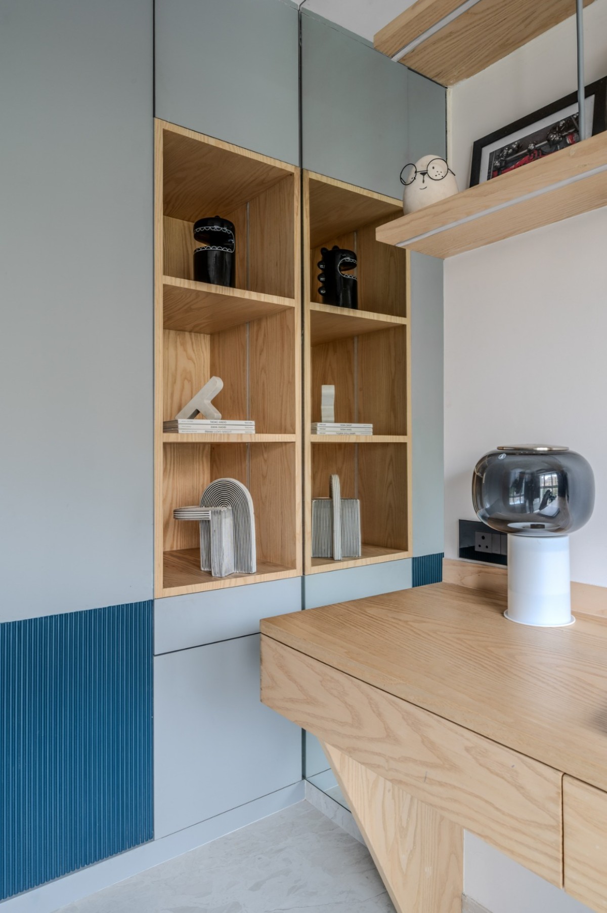 A dynamic mix of birch veneer, denim fabric, core laminates, and MDF flutes. The bed and study were custom-designed to maximize functionality while retaining openness. A denim-blue palette accented with yellow fiddled veneer creates vibrancy with timeless elegance.