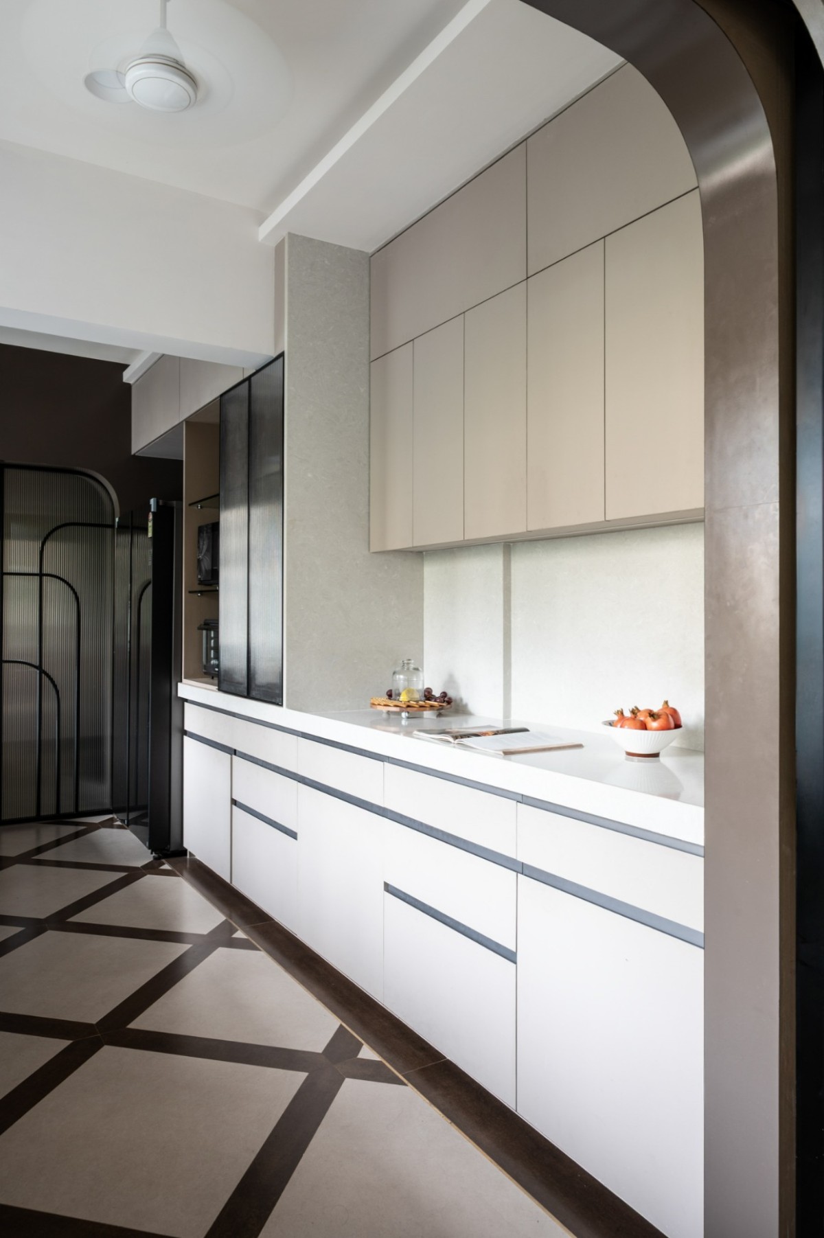 Finished in laminates and fluted glass, the kitchen is anchored by custom-patterned tiles developed as a highlight spine. Cove lighting at the base and platform edges provides ambient glow and acts as a guiding pathway. Sliding shutters at both ends make it adaptable, turning a service zone into a design highlight.