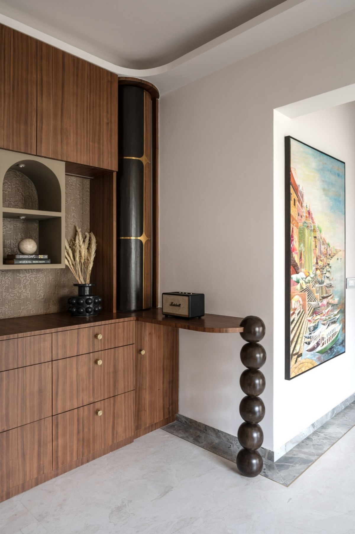 The bar unit is a sculptural centerpiece that embodies the project’s ethos of functional artistry. The kitchen corridor — once a constraint — now acts as a passage of discovery.