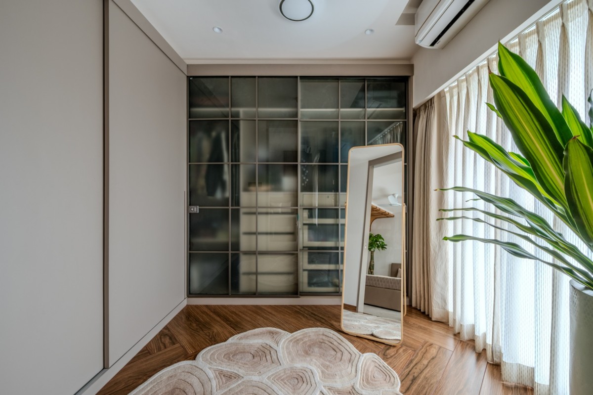 Walls finished in matte PU veneer are paired with an adjacent textured paint wall featuring grooves and curves. Herringbone wooden tile flooring marks the wardrobe, distinguishing it from the sleeping area. Wardrobe shutters combine PU finishes with frosted glass and MS hollow profiles, creating both privacy and pattern. A statement mirror and rug act as highlights, while coves wash soft light over 3D artworks and bonsai plants, evoking the feeling of a forest glade indoors.