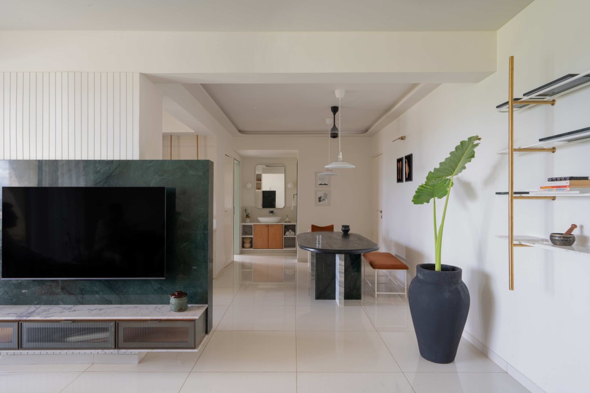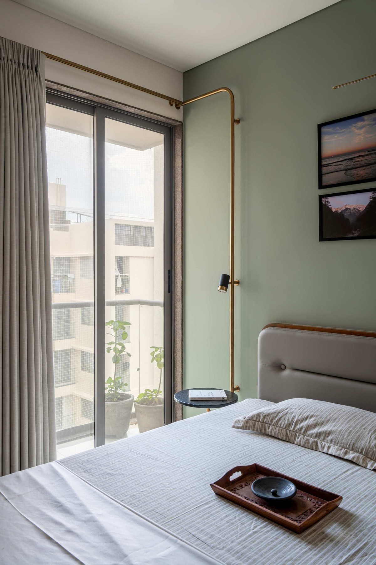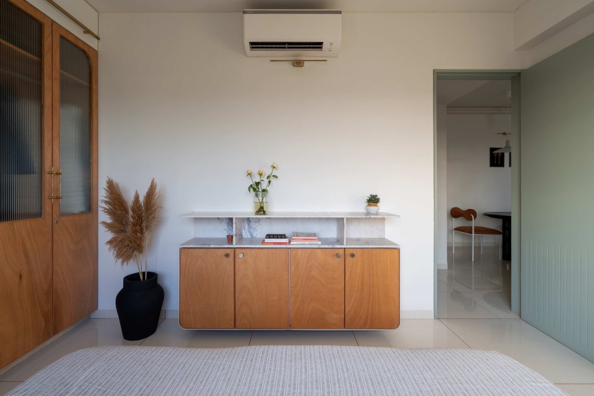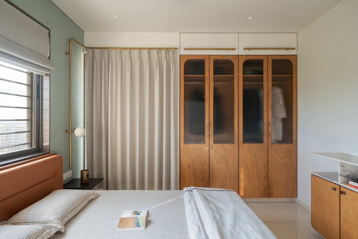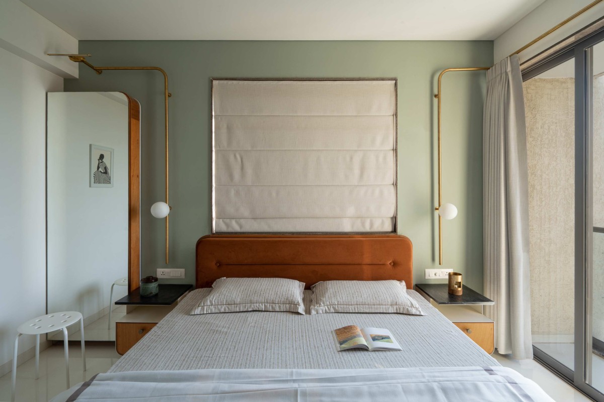 The design incorporates elegant elements in form of brass pipes, steel bed, rich marble accents, and polished plywood, creating a harmonious blend of form and function. The plain white ceilings and walls serve as a backdrop, allowing the furniture, fabrics, and decor to take centre stage. This design embraces modern minimalism with mid-century influences.