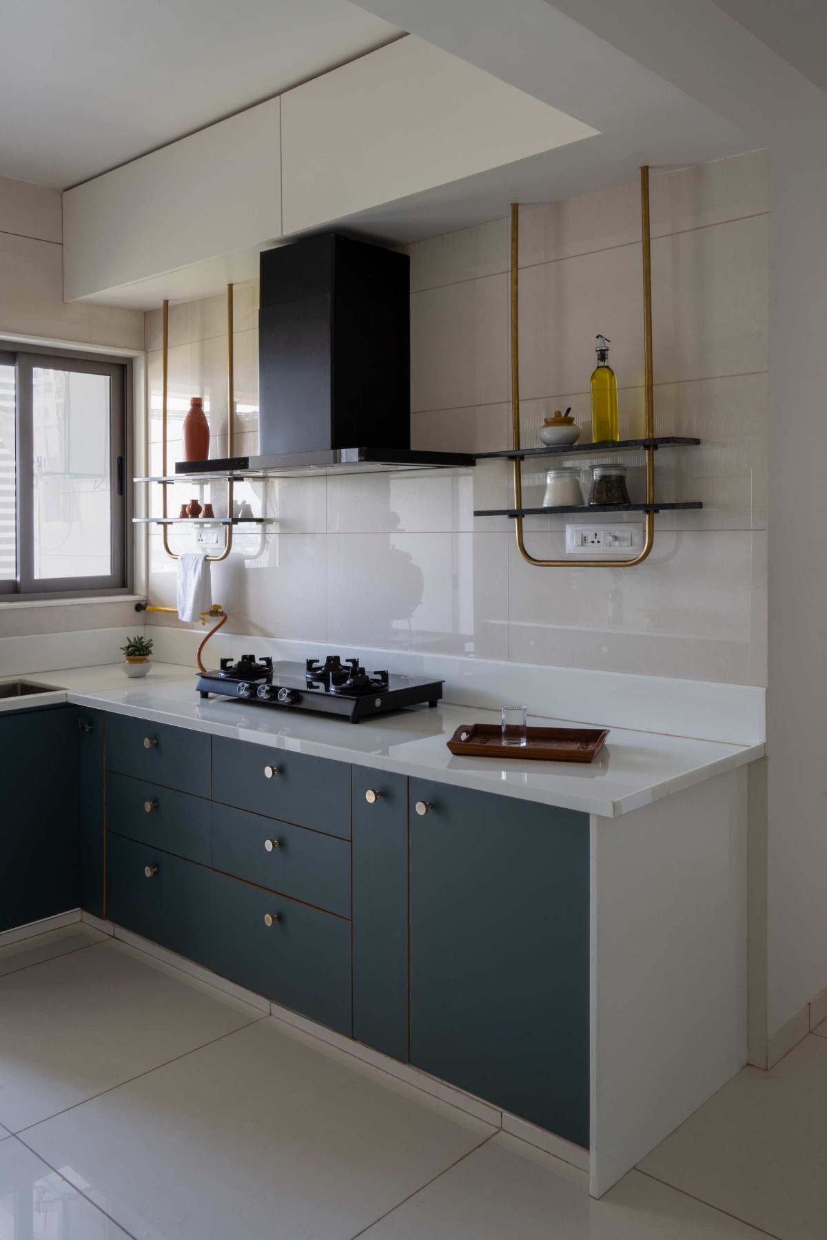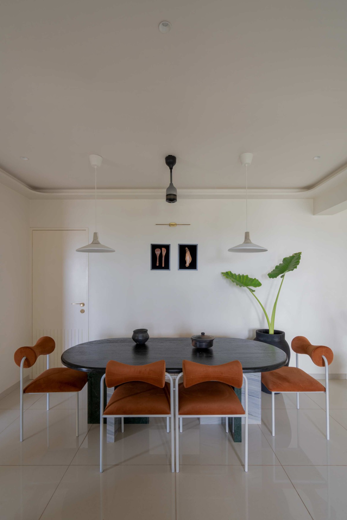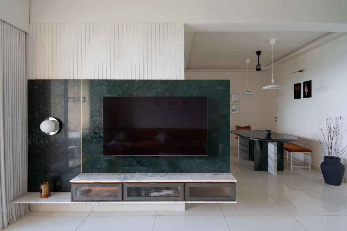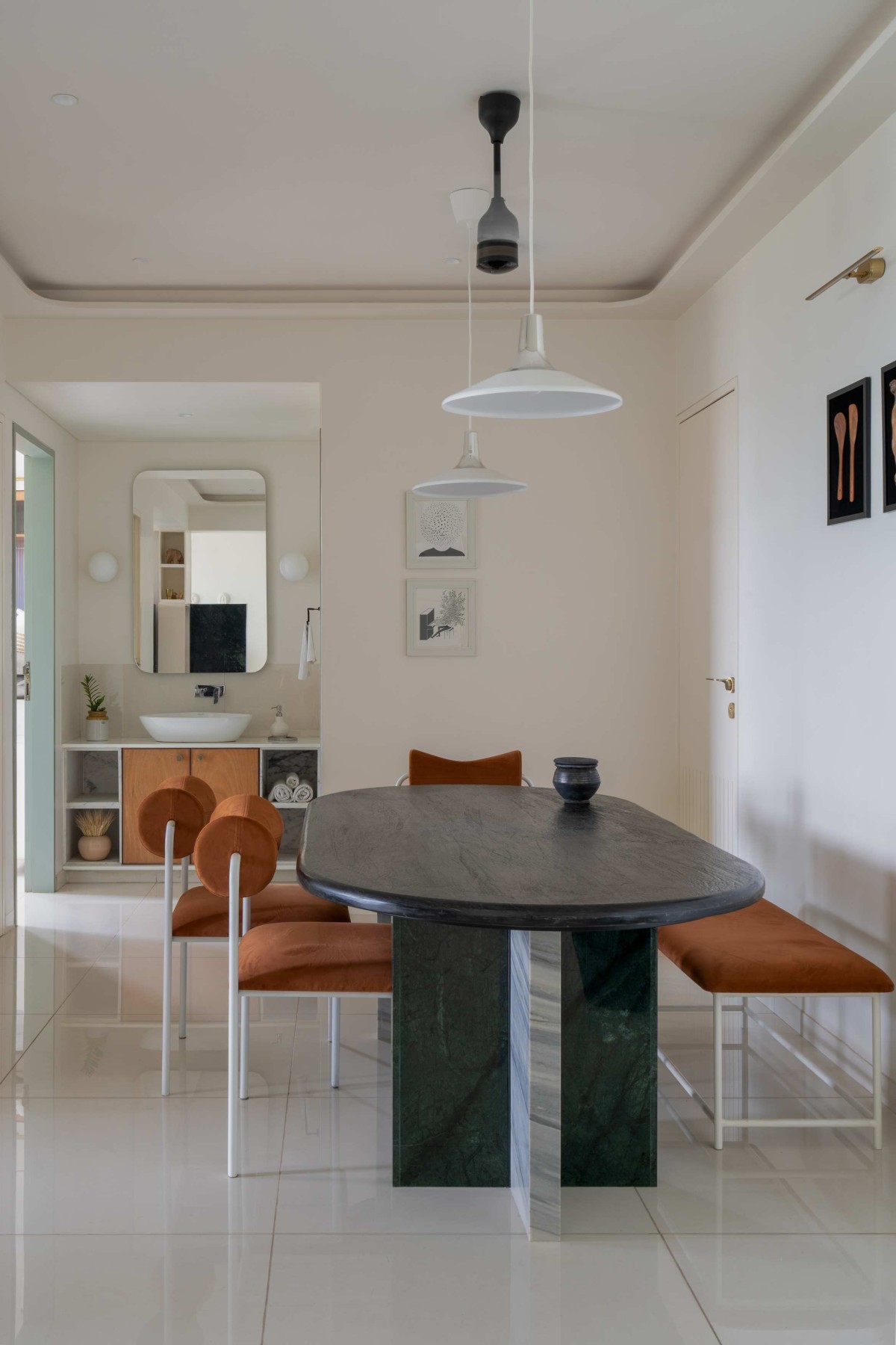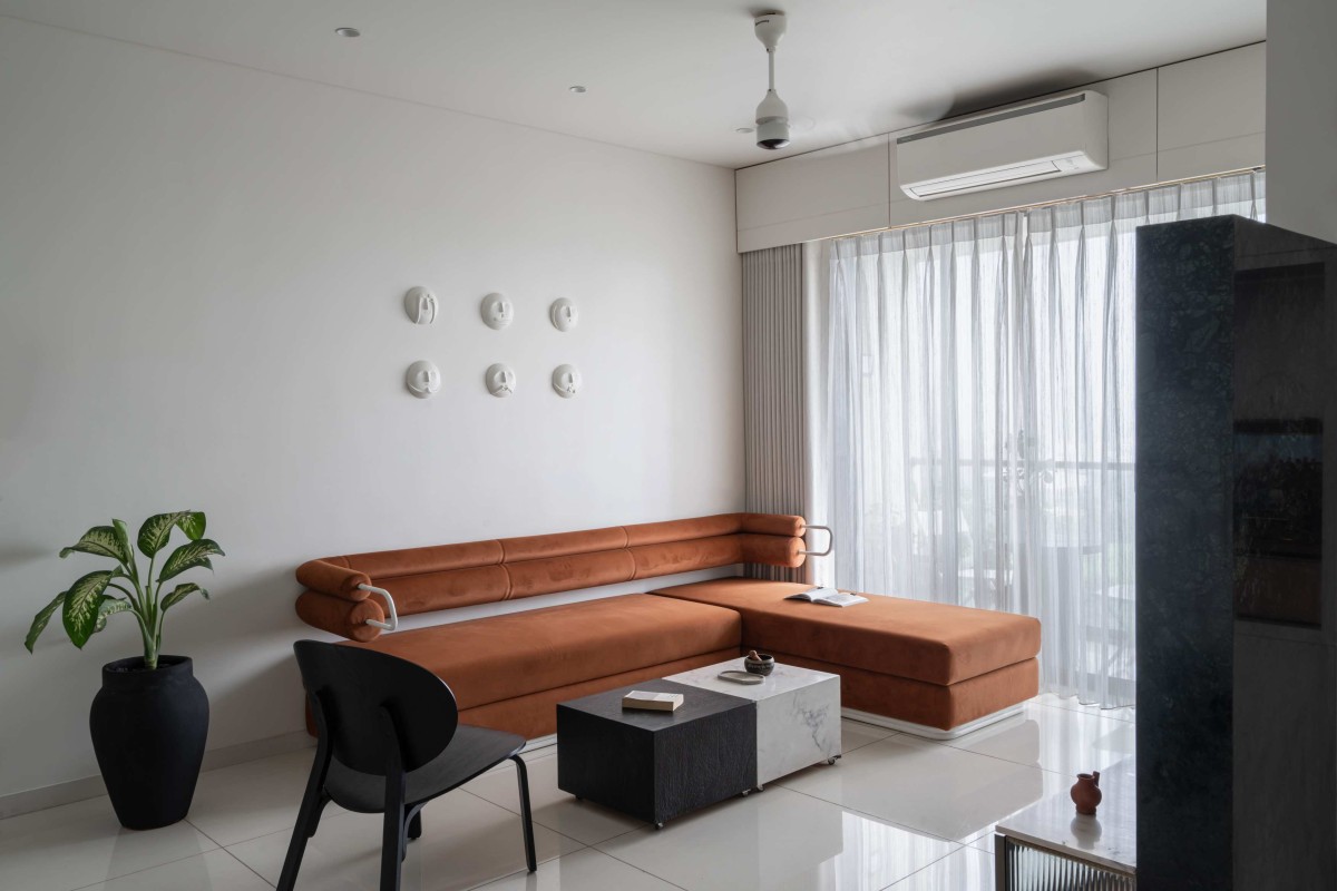 The design incorporates elegant elements in form of brass pipes, steel bed, rich marble accents, and polished plywood, creating a harmonious blend of form and function. The plain white ceilings and walls serve as a backdrop, allowing the furniture, fabrics, and decor to take centre stage. This design embraces modern minimalism with mid-century influences.