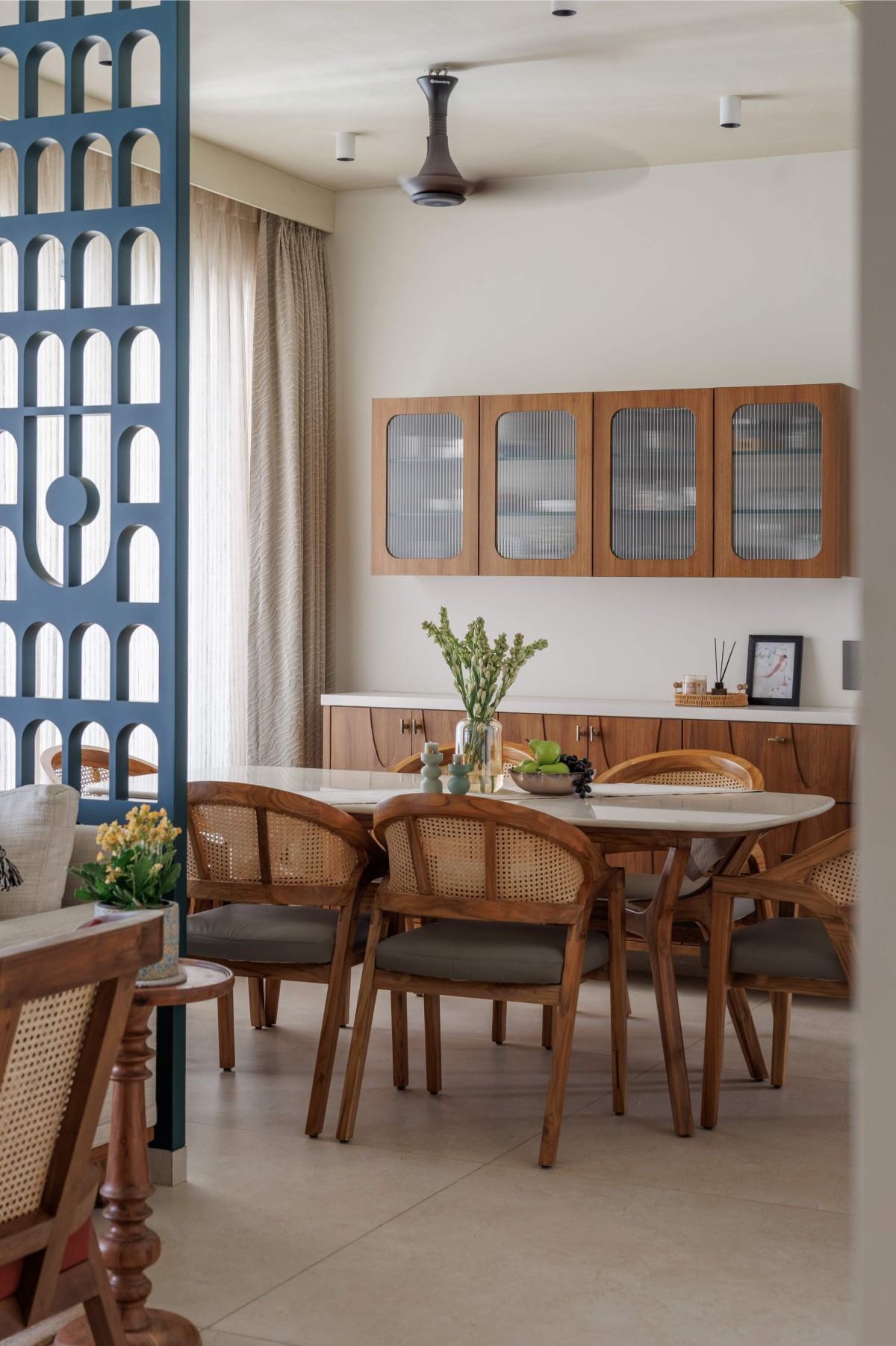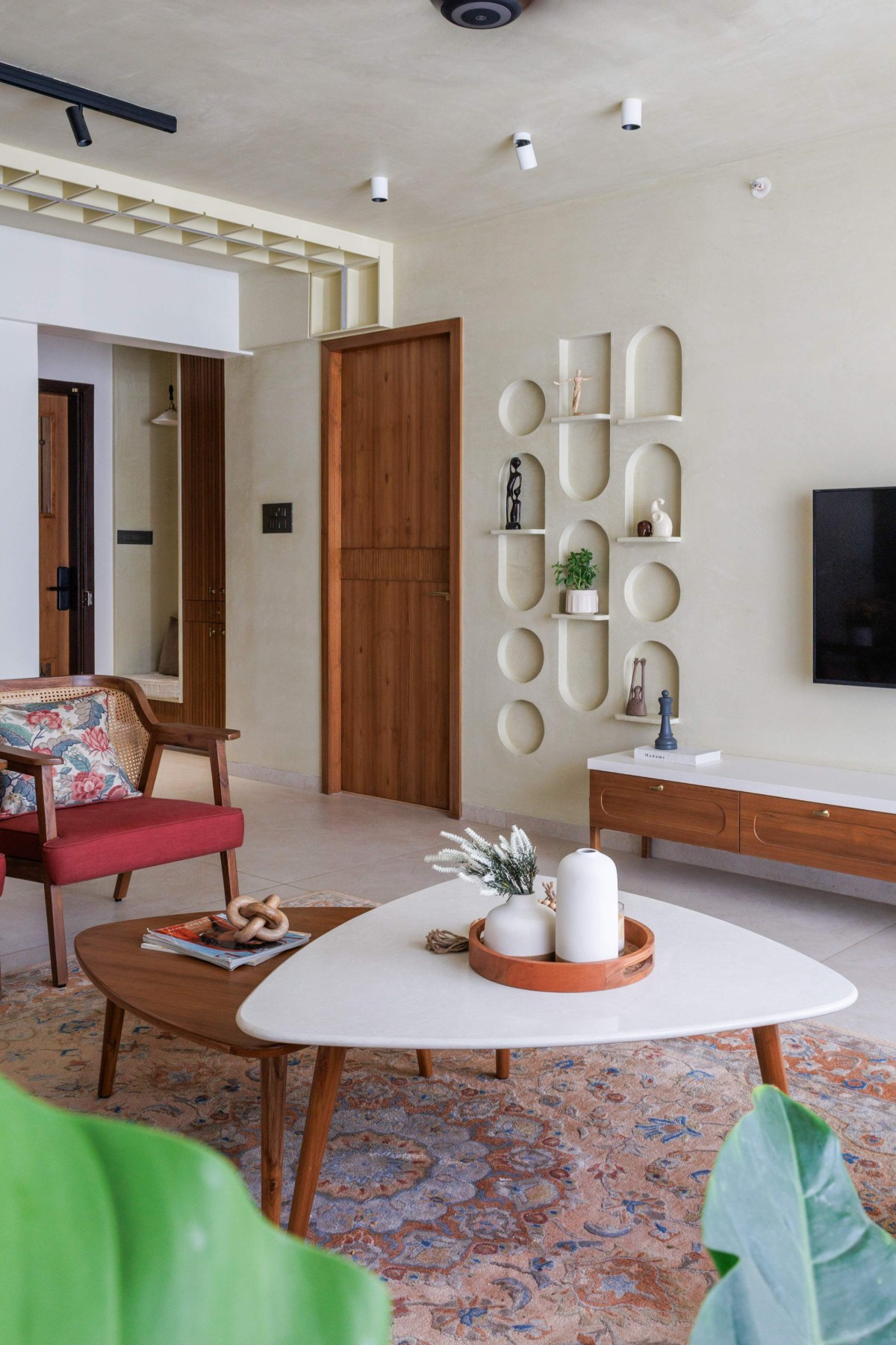 One of the most defining elements of the home is the living room TV wall. Inspired by the form of a jharokha, the niche composition adds architectural depth while maintaining softness. It anchors the living space without excess, embodying the project’s larger philosophy — balance, restraint, and warmth.