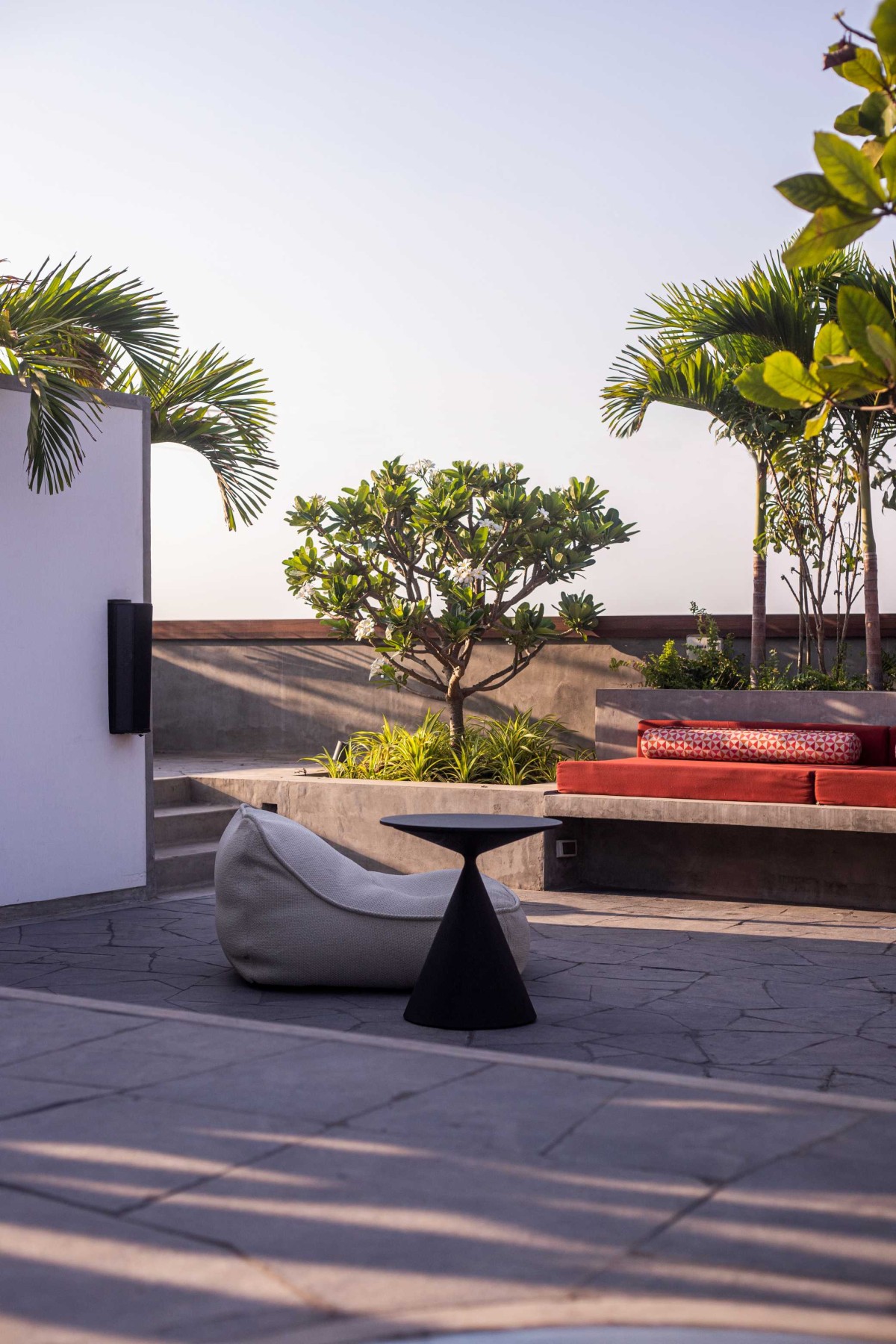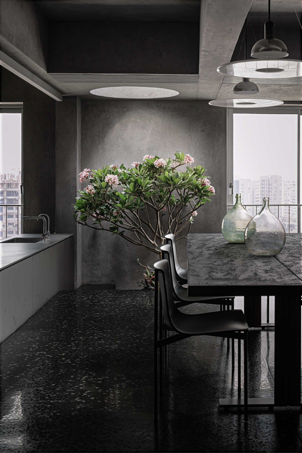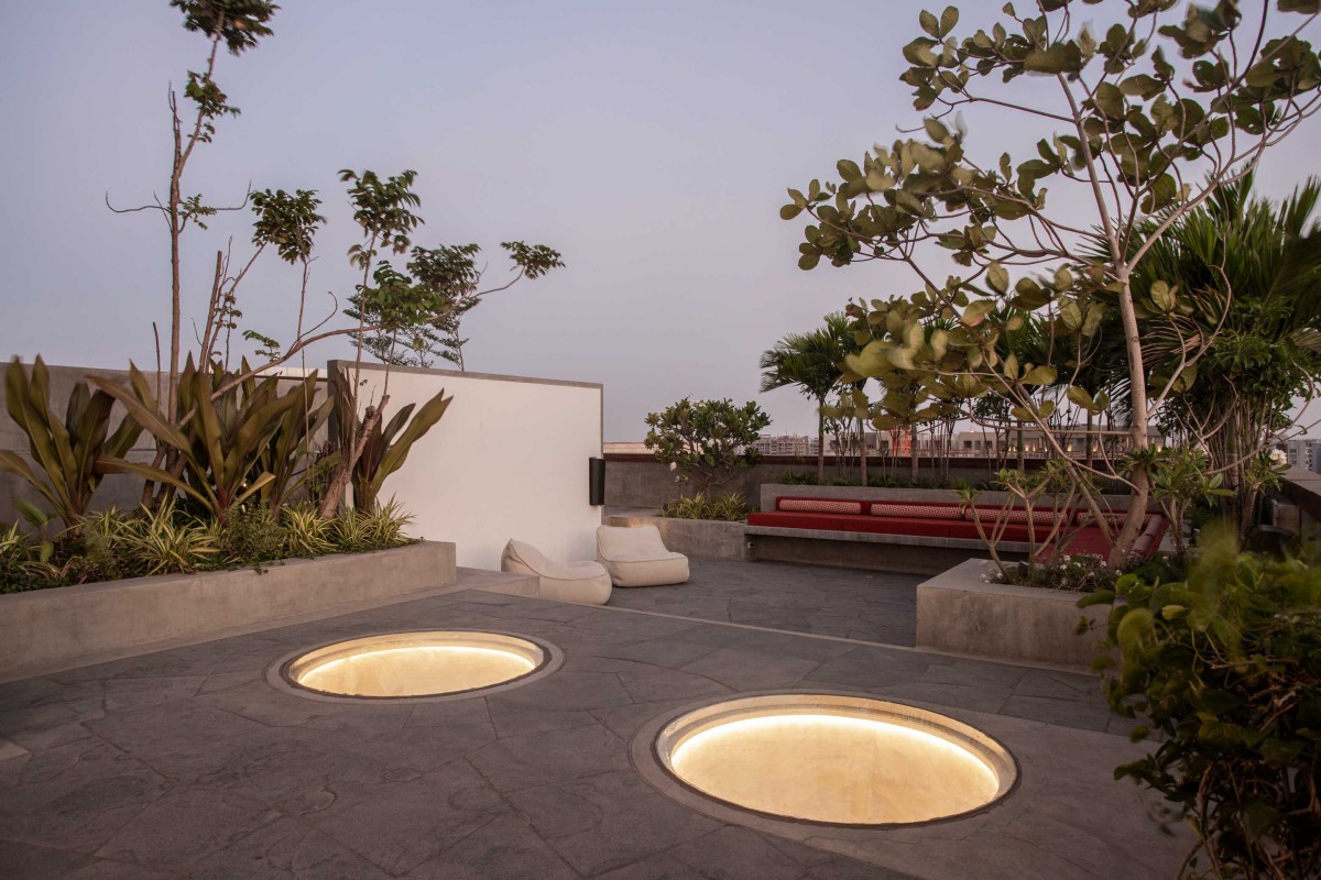 As the curved staircase in fair finished concrete folds upwards, one departs from a rather calm and polished interior to a rustic ground on the terrace. The smooth fine black terrazzo from the lower floor turns into large pieces of randomly laid, black limestone. The covered pause on the terrace is of sort a large glass gazebo, opening on three sides to three zones of the terrace. The curve of the stair within the glass extends into a low height curved partition wall, forming a green pocket to the east; a large planter box along with a Spathodea tree, a screening wall, a stepped down seating and a dense plantation edge punctuated with two planter boxes with trees on either side creates an enclosure to the south; while a step-up zone to the west with a dining, gazes at the cityscape.