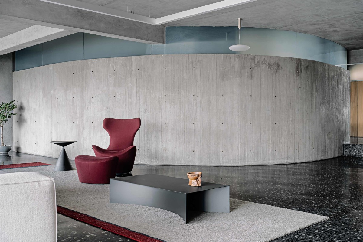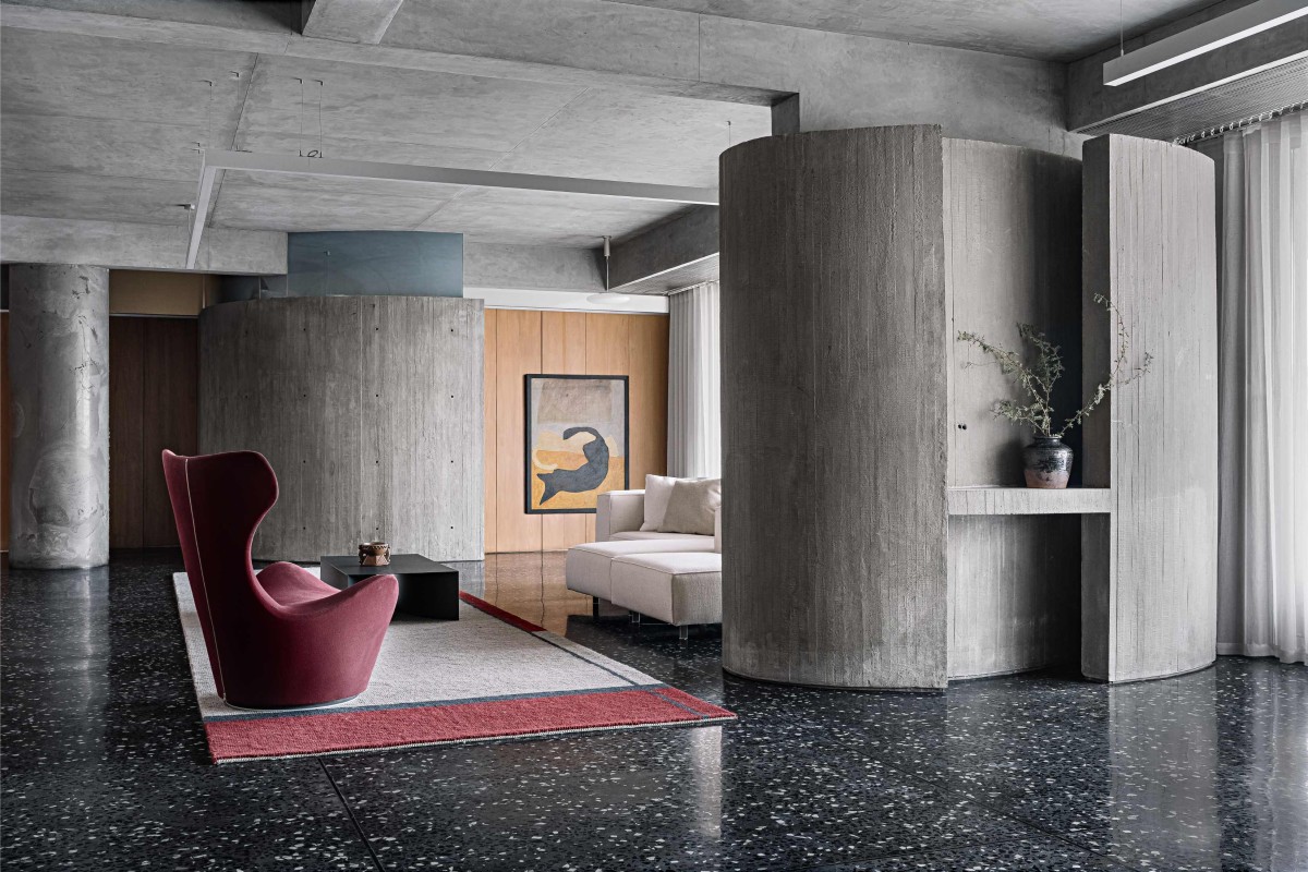 As the wooden door pivots open, a straight wooden wall directs one towards a large curved cast-in-situ concrete plane which draws the eyes towards a living room flooded with natural light further to the landscaped balcony outside. The living room is tucked between three curved concrete walls, the first warps an existing shear wall while the second and third cups the Parent’s bath and kitchen store respectively.
