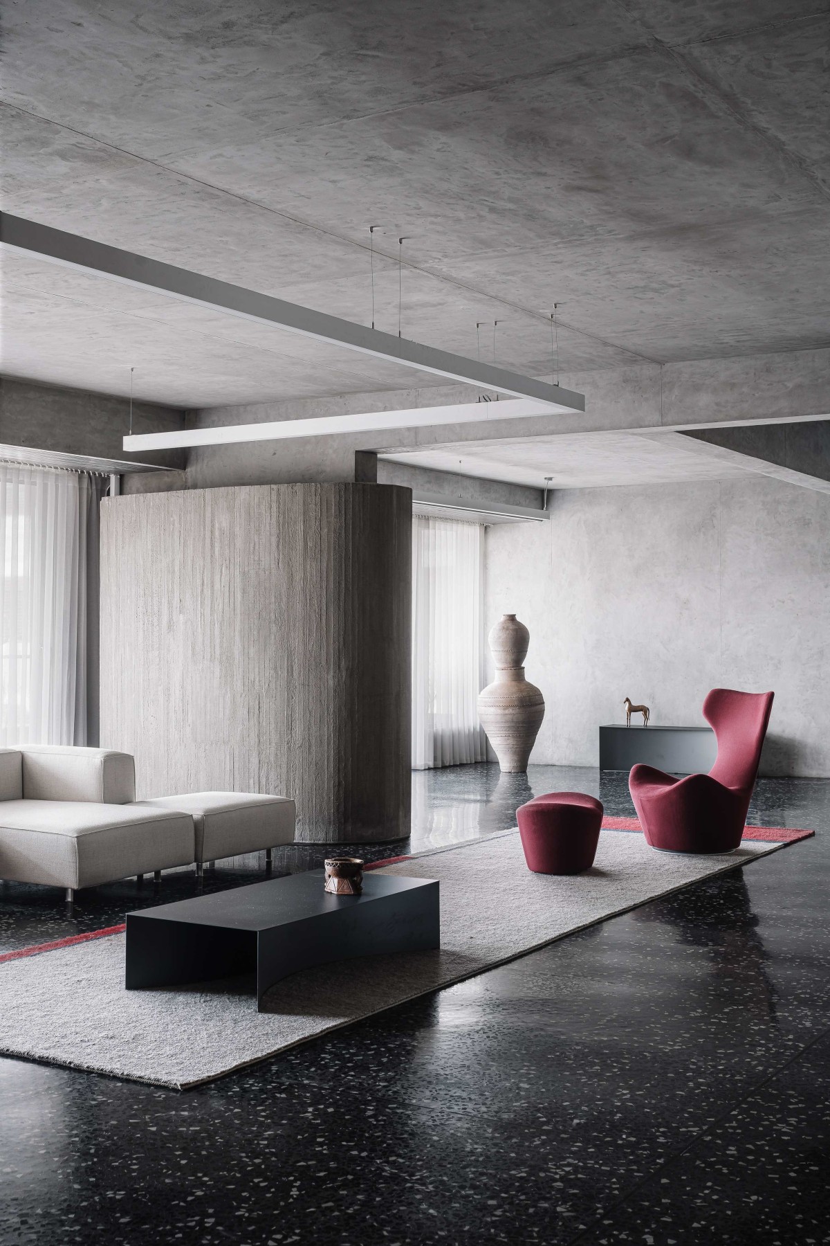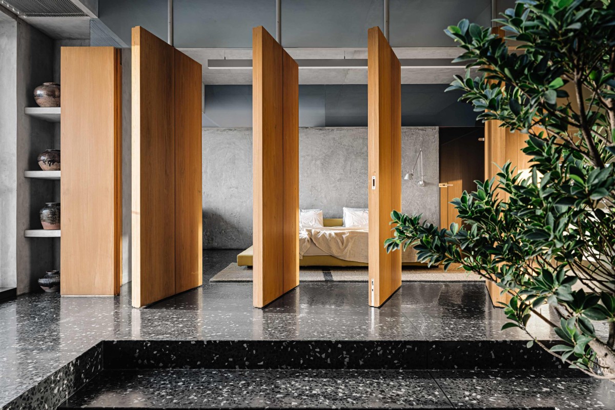 The house features an open plan, a bare slab, a modulating floor which offers variation of scale in space, fair finished curved concrete walls and teak wood partition walls as planes that are capacitated with some form of housing within it, handmade IPS walls and terrazzo floor; all have been craft fully used to evoke the quality of being minimal, consistent and extremely rooted to the naturalness of the space.