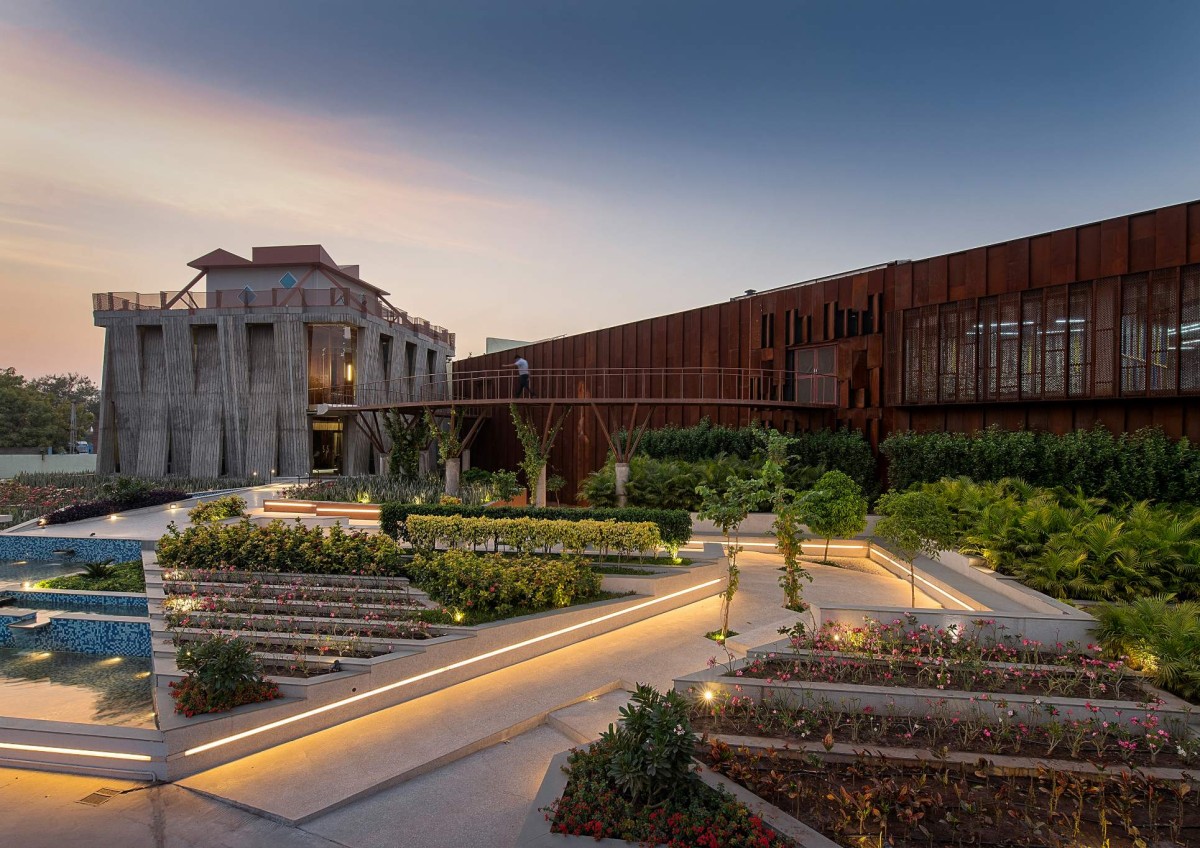 Dusk light exterior view of Office Complex for Gopal Printpack Solutions by I-Con Architects & Urban Planners