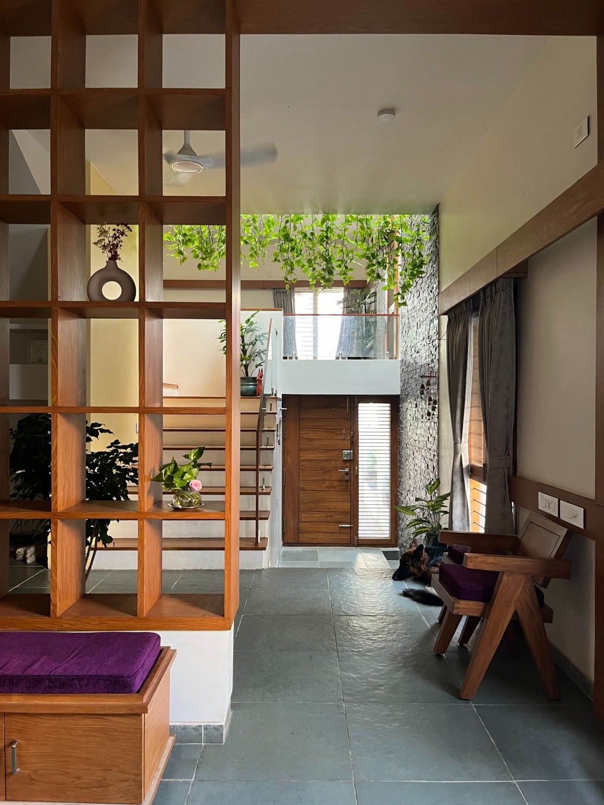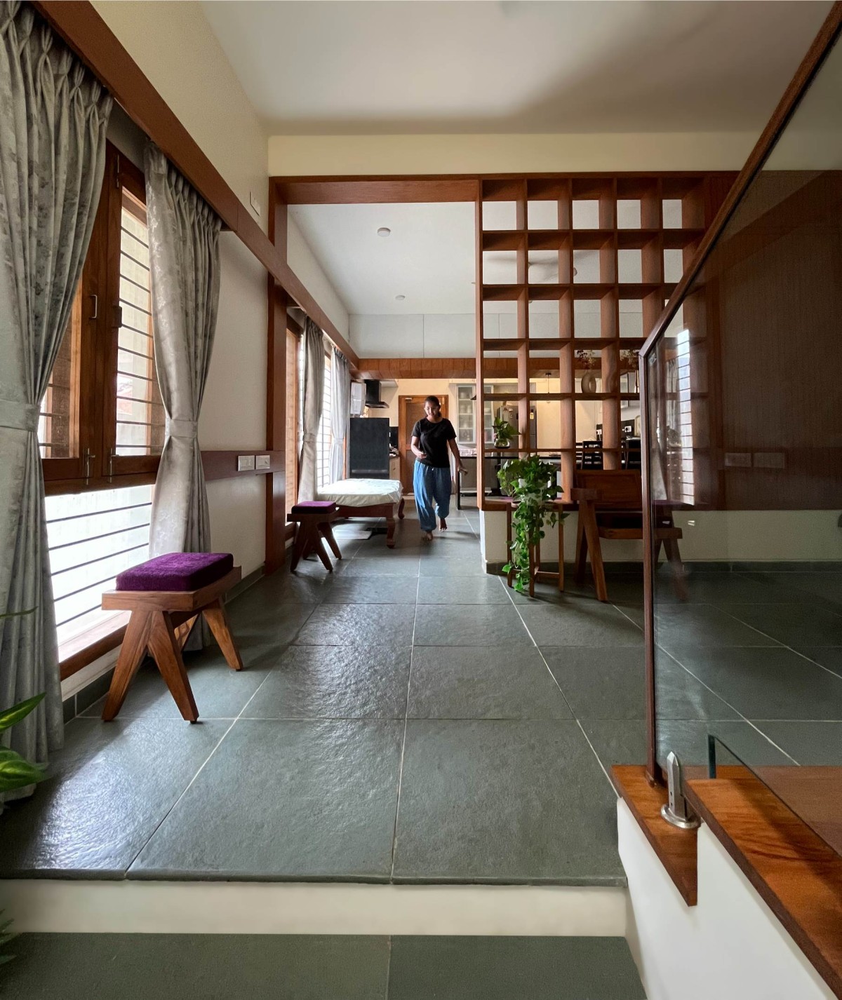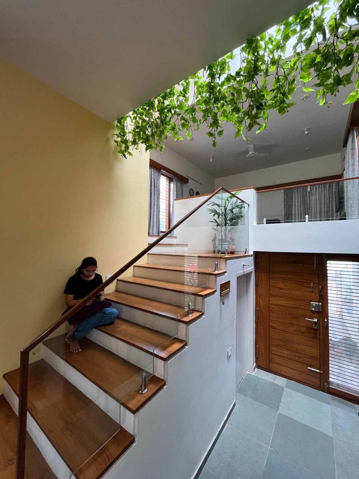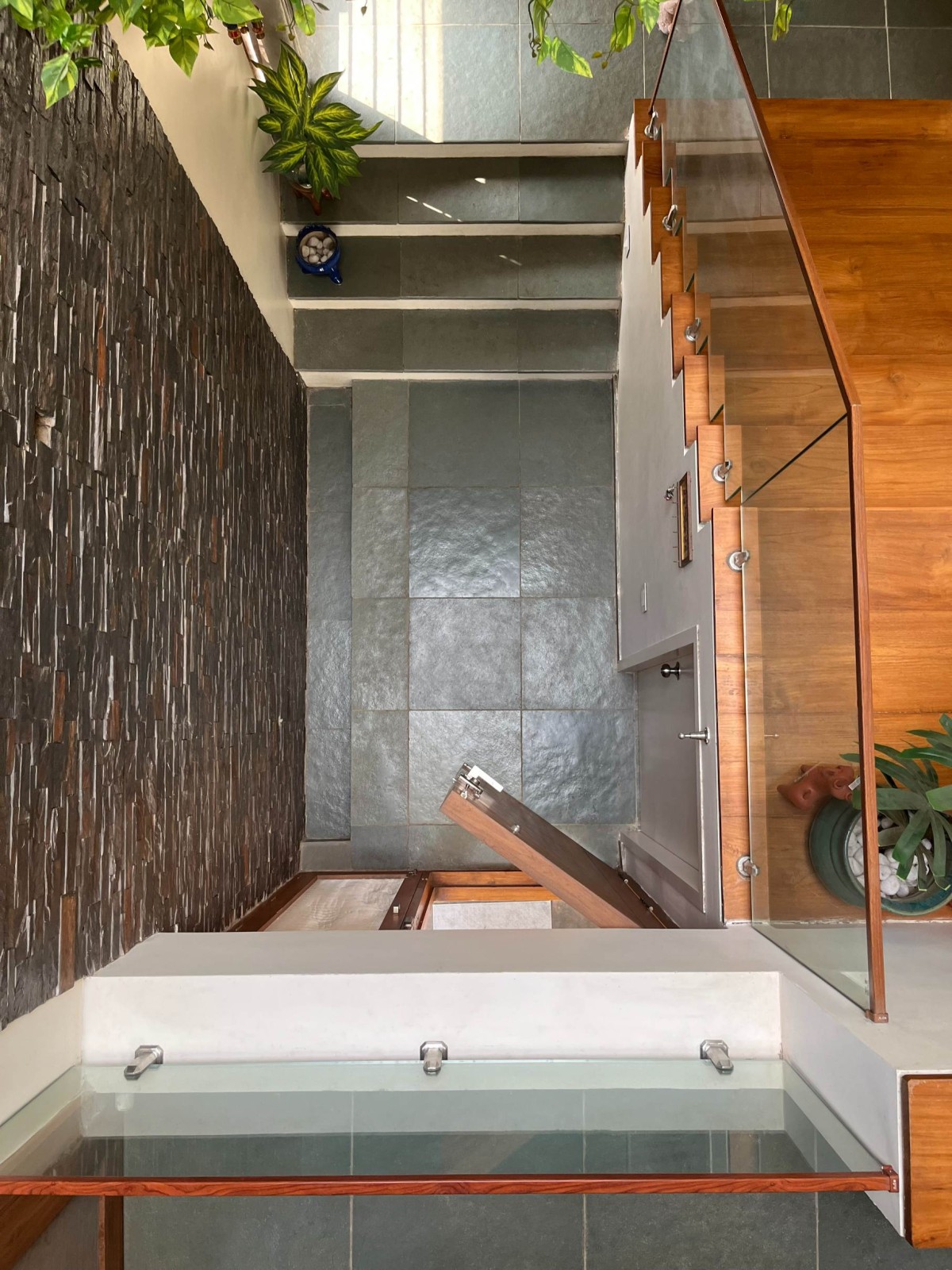 Material decisions reinforce this conceptual clarity. A restrained palette emphasizes thermal performance and tactile comfort. Kota stone flooring moderates interior temperature, while exposed surfaces allow light to articulate depth and proportion. Natural stone cladding is introduced along the core of the double-height skylight, grounding the vertical volume and providing visual weight that anchors its scale. This material articulation prevents the central void from reading as a narrow shaft, instead establishing it as a defined spatial element within the house. Cascading vegetation is integrated into the void, softening vertical scale and introducing seasonal change into the interior atmosphere.