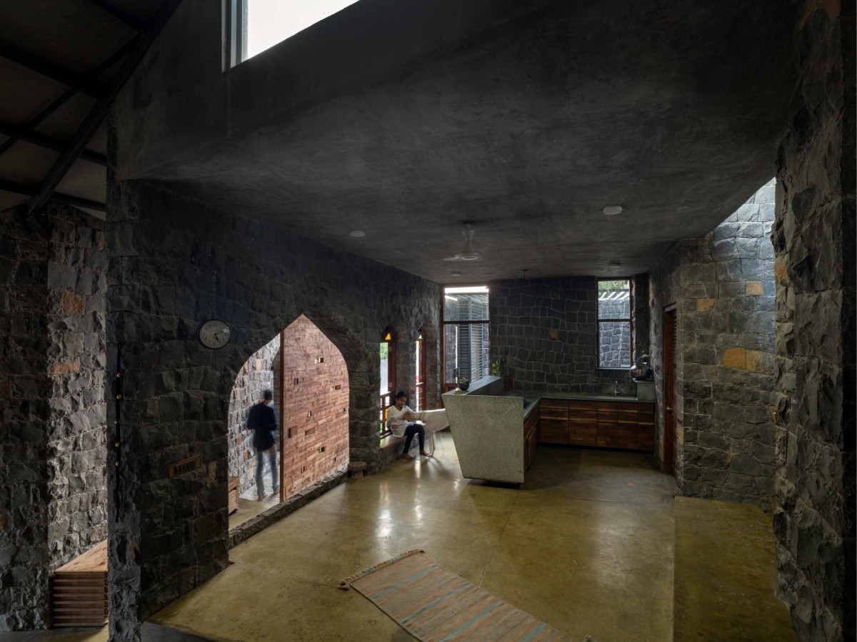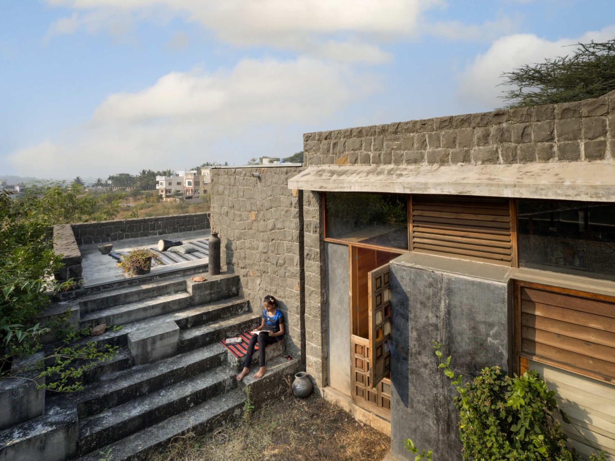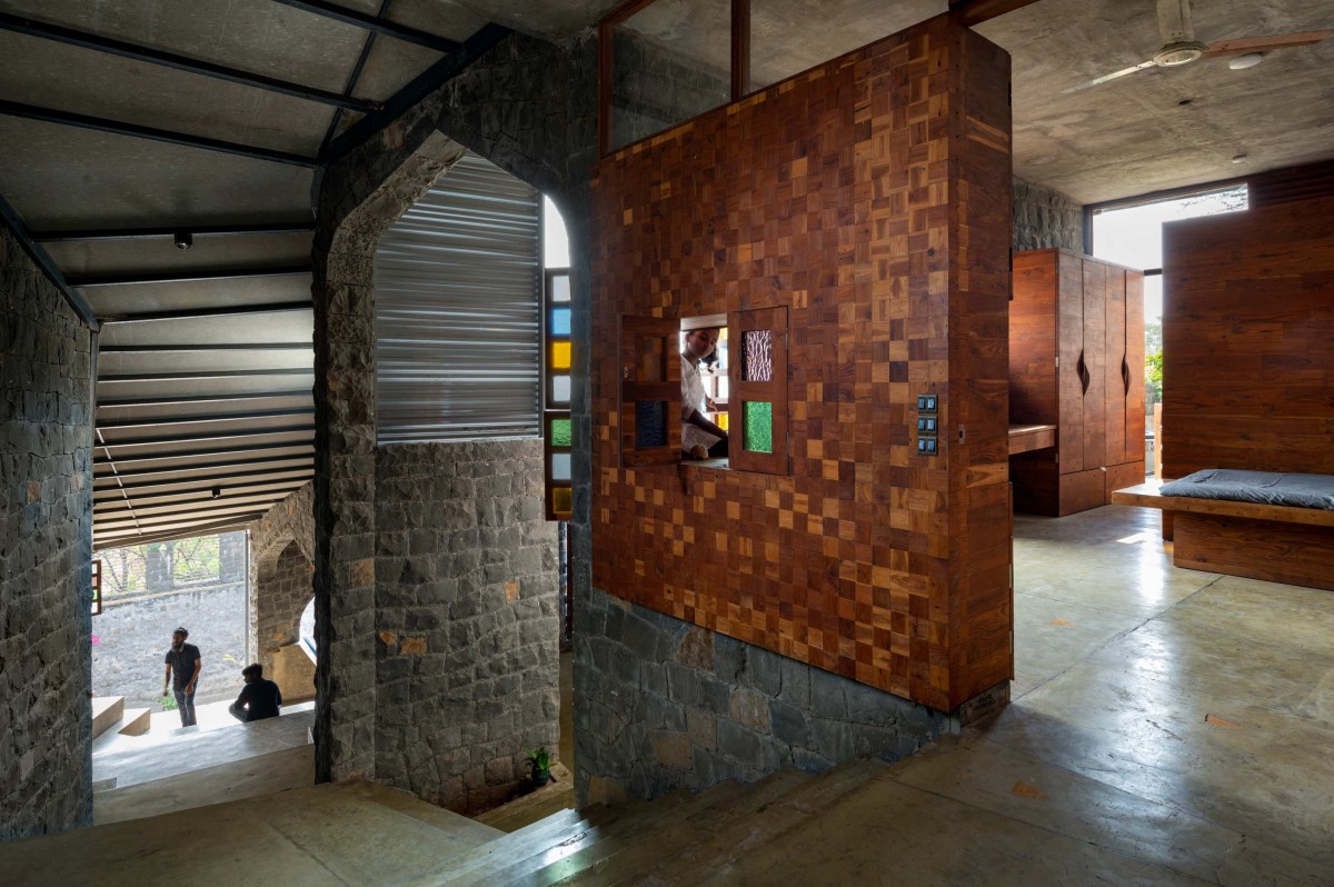 A portion of load bearing structure is built using discarded stone quarried from a nearby site, hand-dressed by artisans familiar in basic brickwork and rubble masonry. Integrating upcycled teak wood and IPS (Indian Patent stone) flooring envisages a minimalist approach. It kindled an architectural vocabulary reviving the regional craftsmanship defying the mechanical industrial yield.