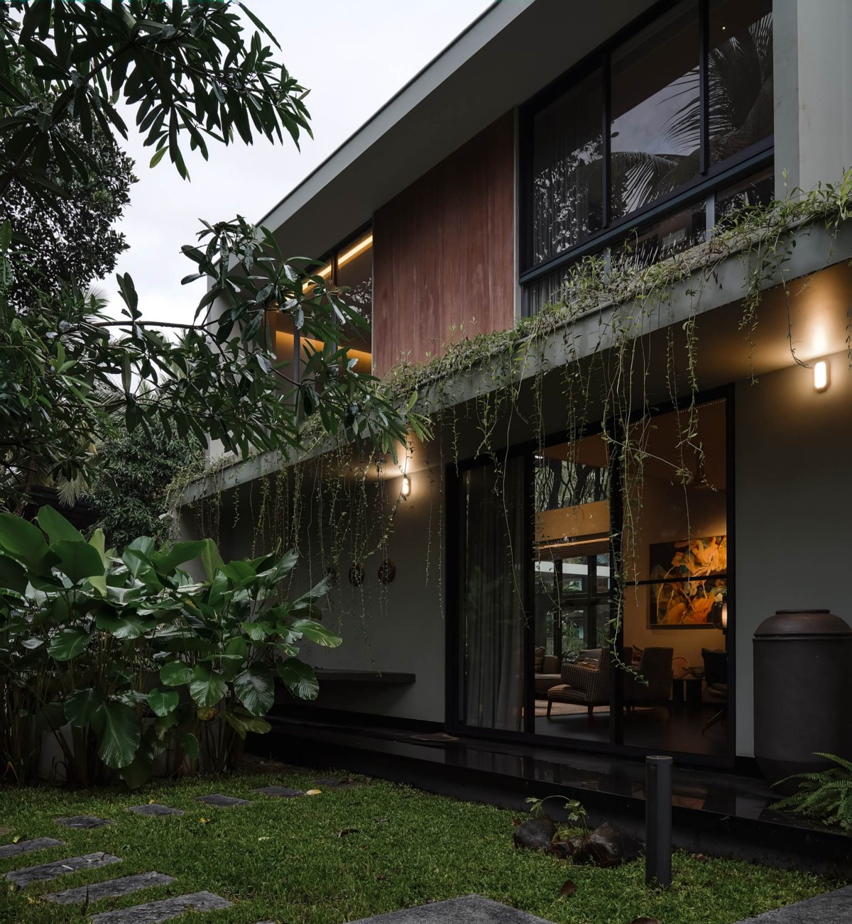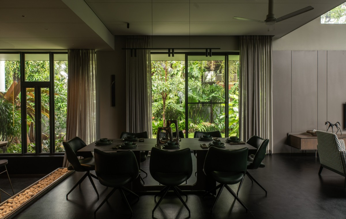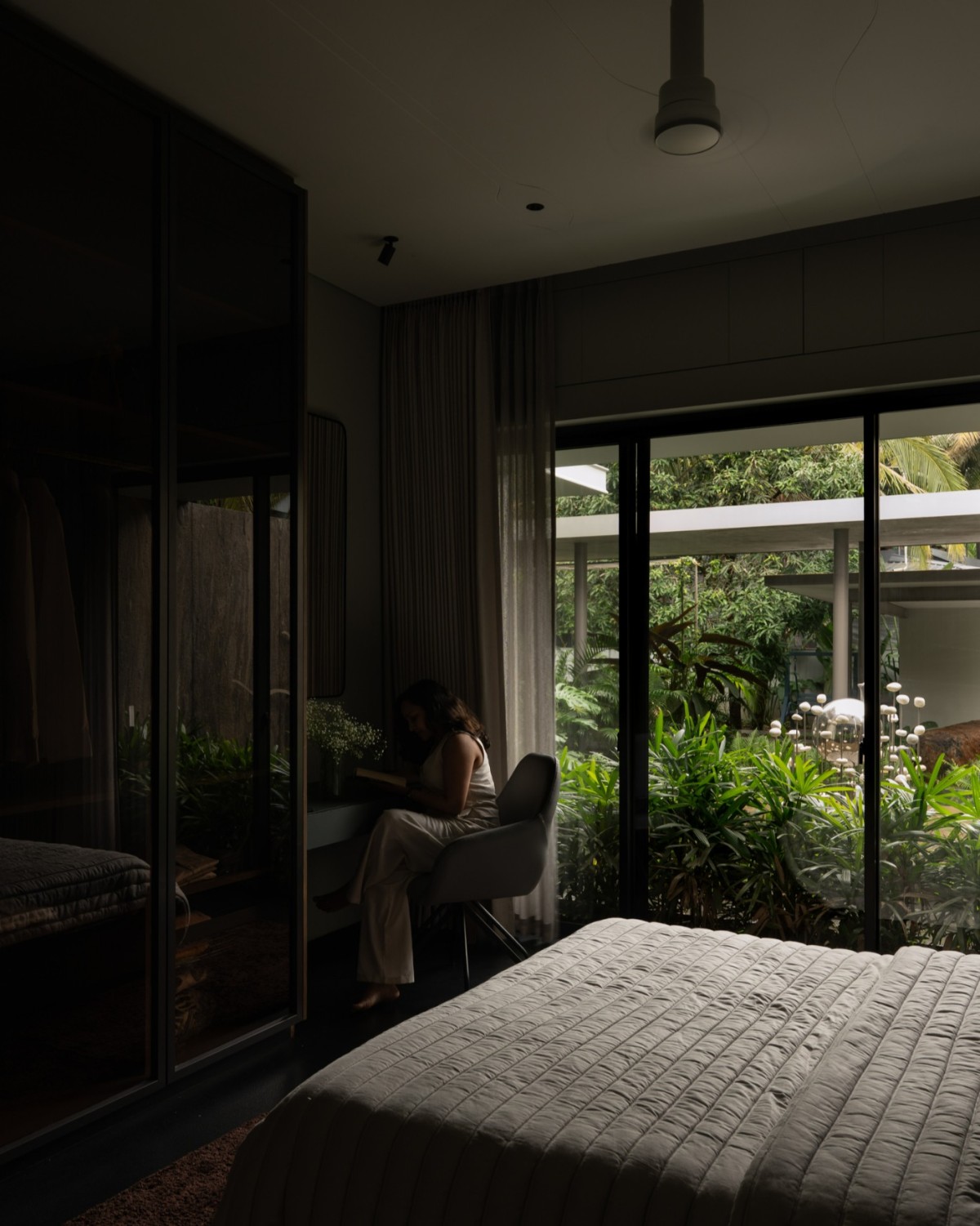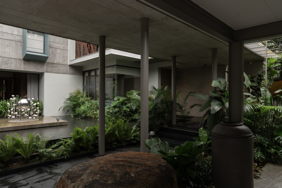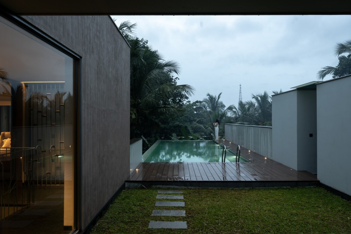 The southern block follows the site’s natural contours, allowing gentle level shifts instead of flattening the terrain. This creates spatial continuity on the upper floor, most notably in the study, which enjoys an uninterrupted view through the deck to the pool. The placement of the pool on the first floor, west side, accomplished 2 things: privacy, owing to the adjacent temple - which restricts vertical development on that edge - and freeing up the ground floor for landscaping.