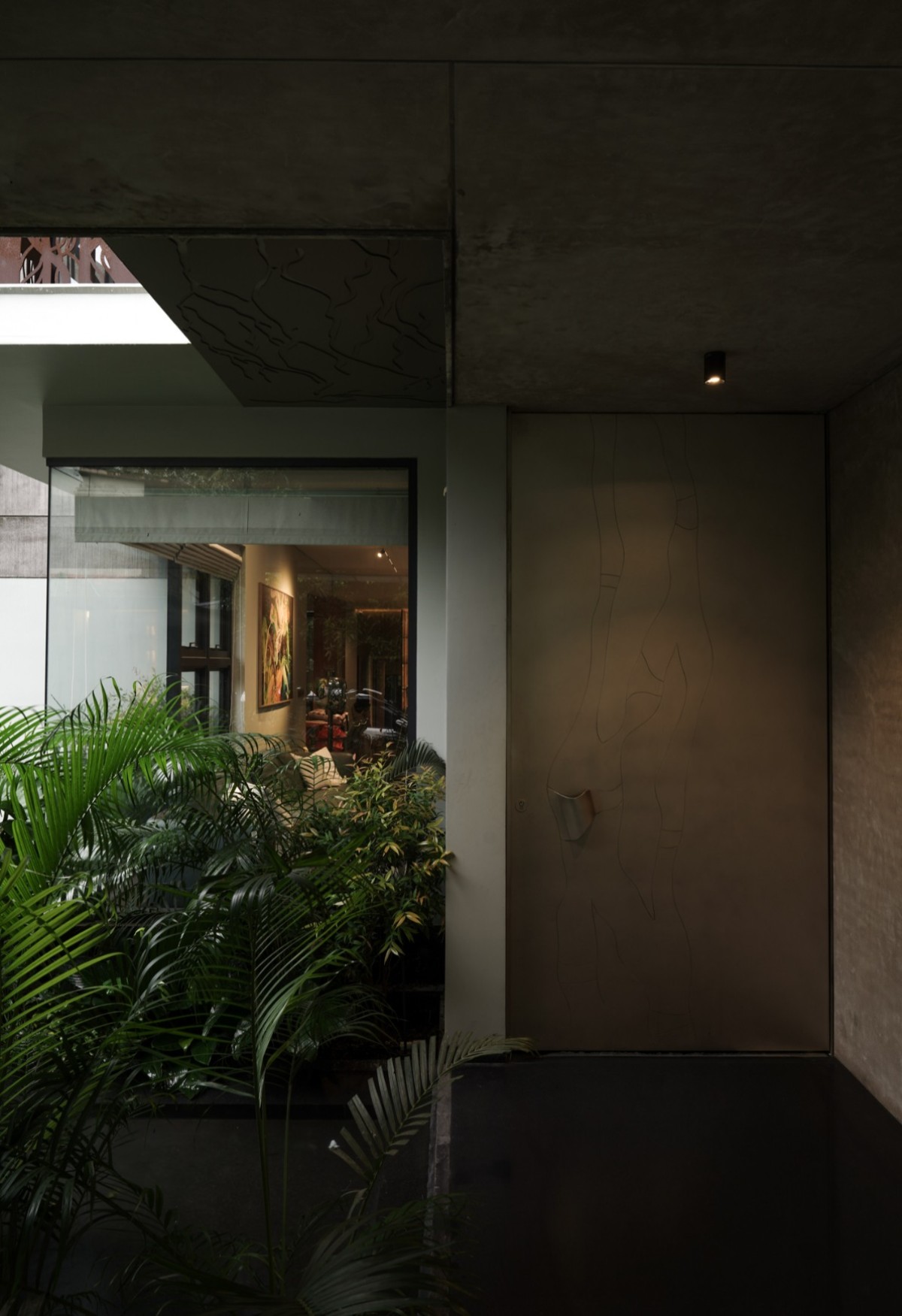The finishes for the interiors have been carefully chosen to maintain a neutral and minimal color palette, the different shades of grey for the walls and ceilings, for instance. The only color applied is to that of the custom-made art pieces. Keeping in harmony with the muted colors, neutral oak-colored mica, veneers for kitchen cabinets and a grey counter top were chosen by the architects.