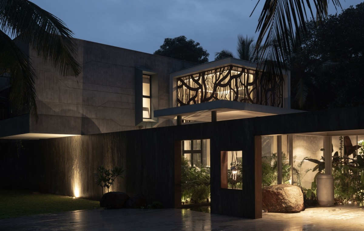 The exterior uses raked cement plaster with leather-finish black granite, whose textured undulations glow dramatically when lit. Granite, chosen for its hardness and weather resistance, appears throughout the house, reflecting the client’s deep knowledge of geology.