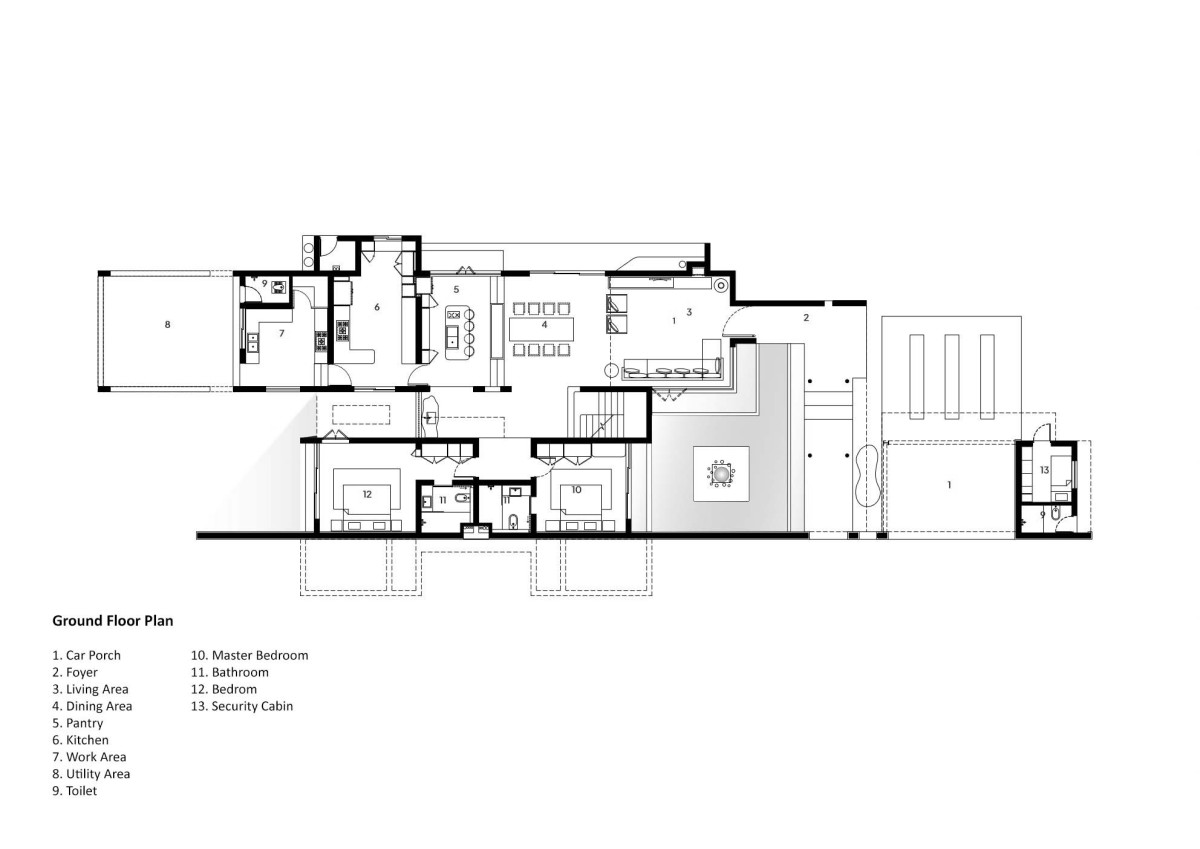 Internally, the house is separated into 2 zones. The northern block houses common areas (living, dining, kitchen) and encourages interaction, and southern block houses private areas (bedrooms, bathrooms) and ensures seclusion, separated by the buffer zone, housing the staircase and the wash area.