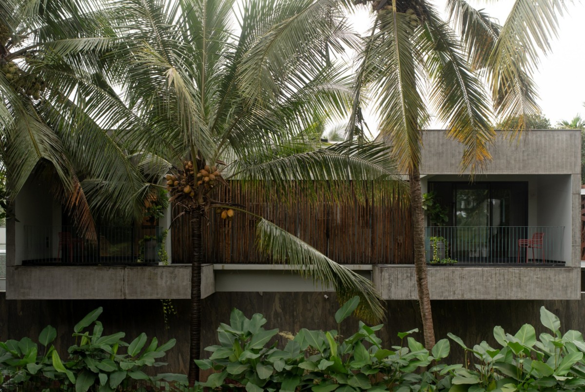 The built mass sits at the center of the site, allowing a generous backyard, a welcoming front lawn and optimal shade from the banyan. The form is a composition of 2 parallelly placed blocks, staggered with respect to each other. The masses were split to allow airflow into the main structure by inducing a buffer area in between where the openings were strategically placed to facilitate air movement. The staggered nature of the blocks produces a more dynamic form and creates nooks and niches which allow opportunities for elements of interest.