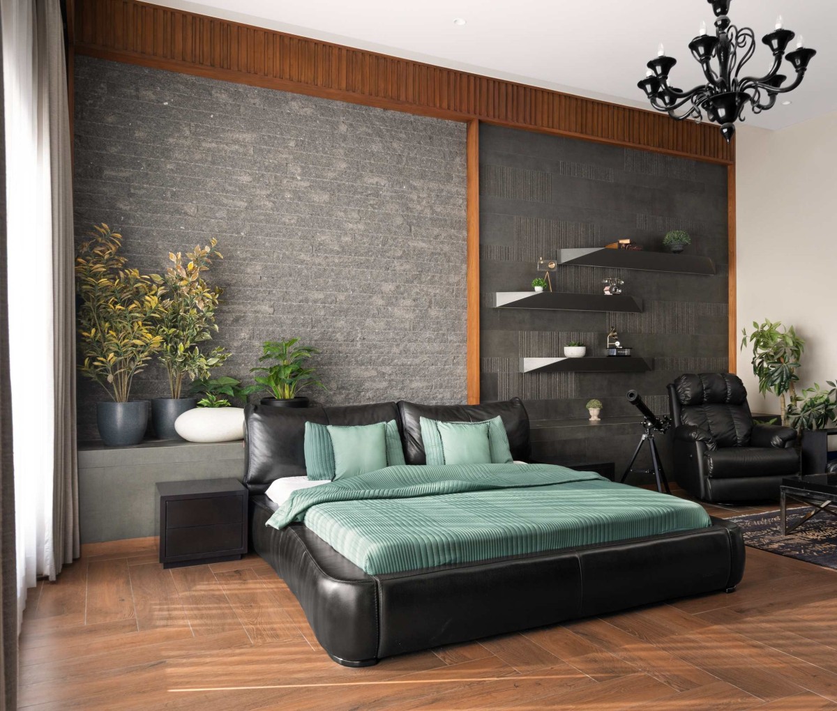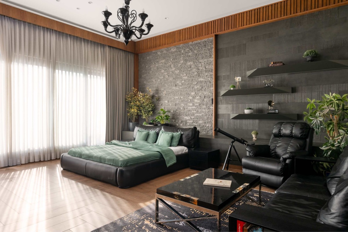 Since the master bedroom is a more private space, the couple wanted their room to be very different from the rest of the rooms. So it is designed to have a more modern and a darker theme while the carefully selected furniture and decor items add a hint of luxury. The focal bed backdrop wall is divided into two parts, one with rough stone and the other with smooth stone and large shelves. This adds a certain depth and allure with different patterns and materials.