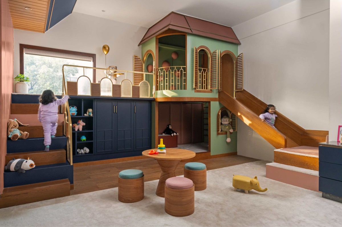The kids play area is designed as a colourful vibrant haven for the kids with a play house and a lot of storage space for toys. The space brings together all the pastel shades used in the house together to form a vibrant and a soothing combination. The play house itself has two levels where the top level is accessed through stairs on one side and a wooden slide on the other. The kids are able to climb the alternating coloured stairs, walk through a playful arched brass railing, enter the playhouse with floating balloons on the back wall, and either slide down back or step down through the metal ladder into the lower level. The lower level is a cozier bedded zone with leather wall padding for safety of the kids. The stairs and the walkway has storage space below it for toys.