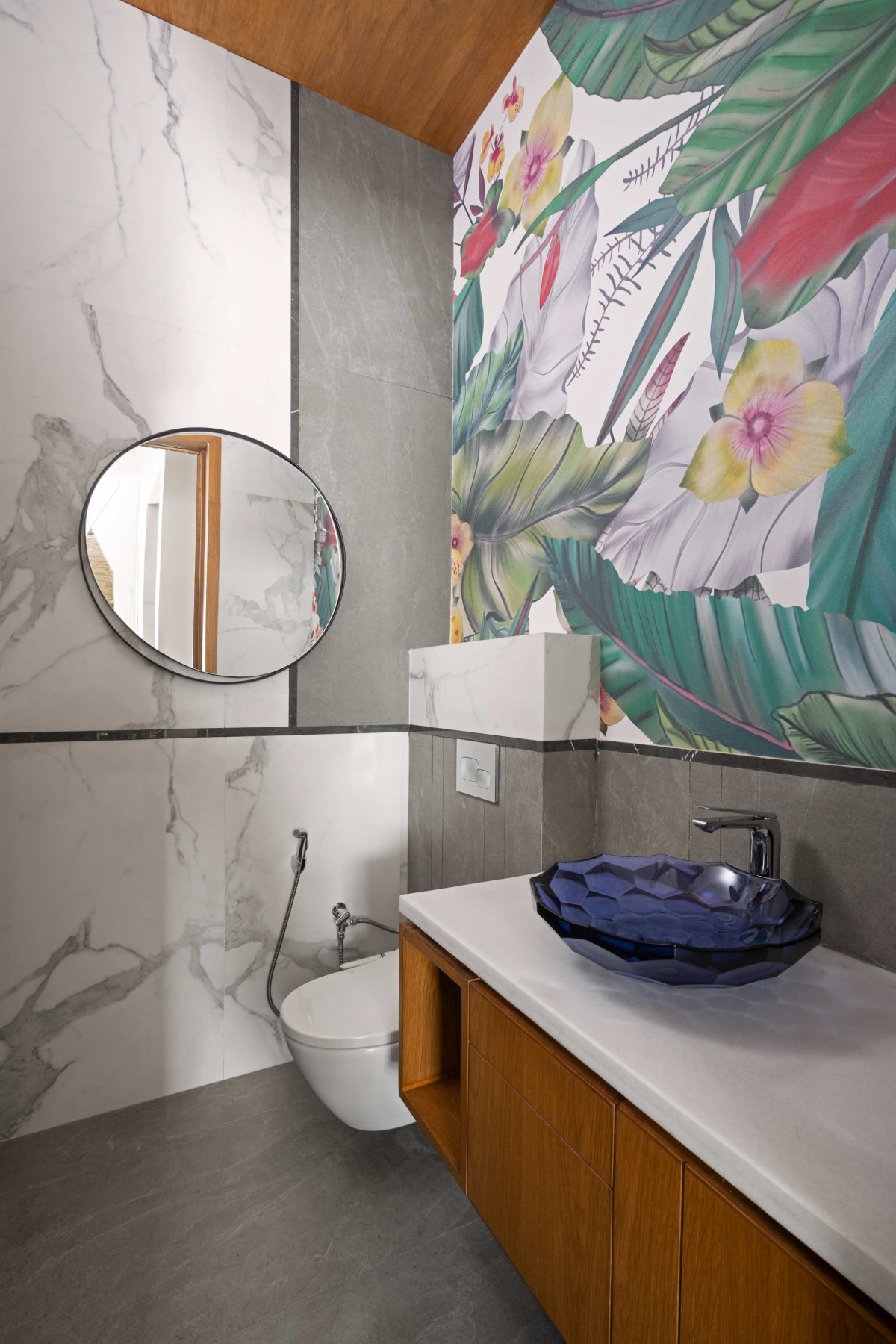 The powder room in the lobby outside the play area is designed with grey and white matt finished tiles and the wall behind the washbasin has a colorful custom designed wall art on it to complement the rest of the interiors.