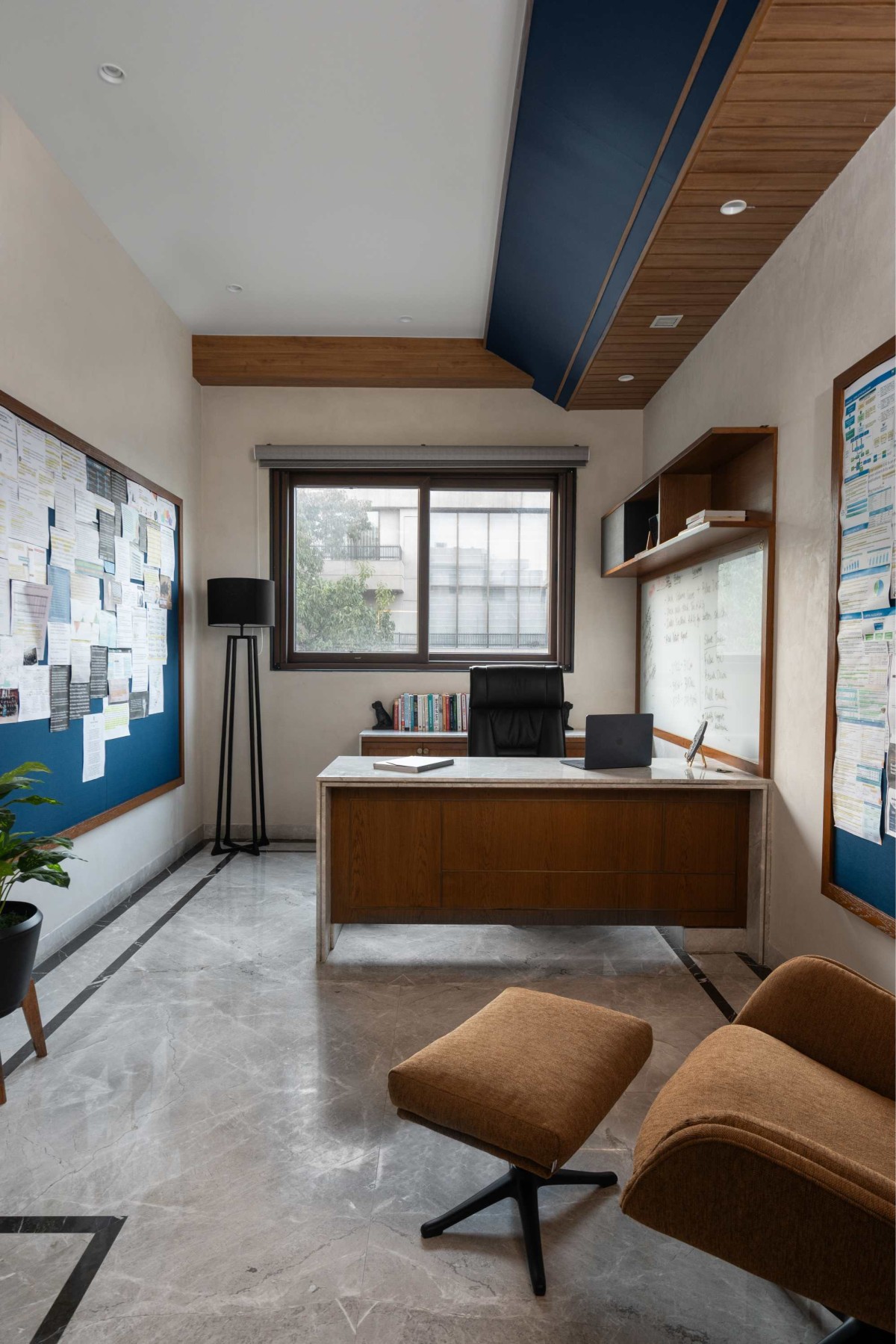 Since, the office space was visible from the lobby alongside the play area, the design was to be dealt with to complement it but feel entirely different for its own purpose. They had a requirement for a table with enough storage and large pinup boards. So the walls have been covered with a beige texture paint and the pinup boards are mounted on it with a blue fabric to provide a contrast yet complement the colours of the house. The table of the room was designed with a combination of stone and veneer with brass inlay in it.