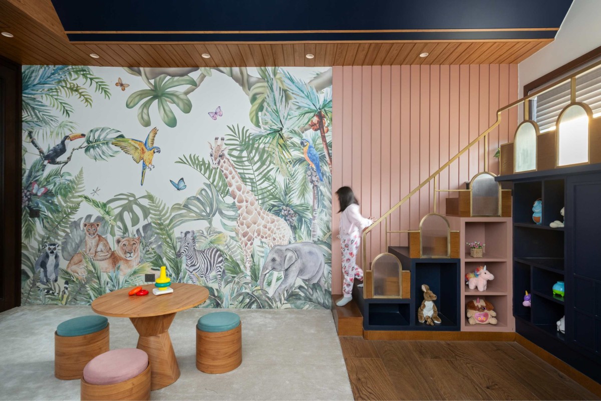 The larger wall is treated with a jungle themed wallpaper artwork which extends into a pink fluted panel towards the rear. The floor is carpeted for the kids to feel free and safe to move while enjoying their space.