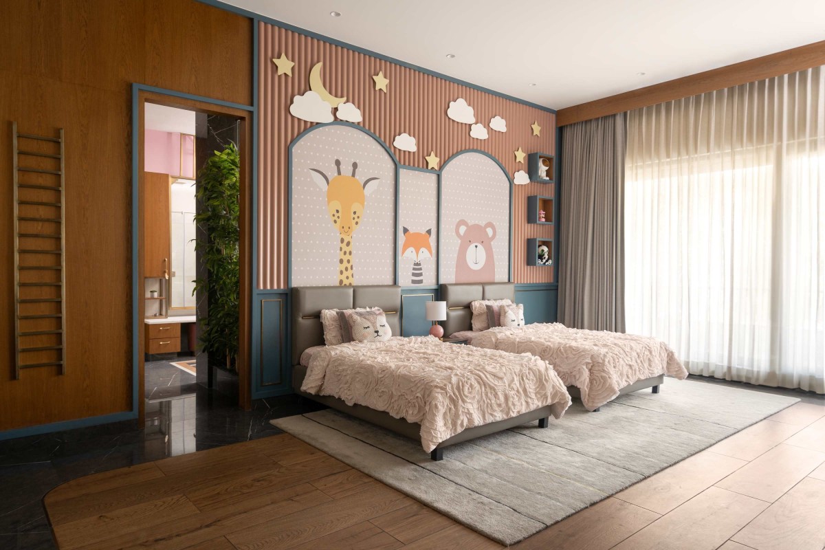 Next to the lounge is the kids bedroom and it is designed to have 2 individual beds, 2 study tables and a lot of storage and wardrobe space for books and clothes. Since both kids are girls and they wanted more pinks and soft pastels in their rooms, the backdrop of the beds are carefully designed with customized animal themed wallpapers to go with the pastel pink fluting panels and are further adorned with clouds and stars around them. The bottom part of the wall is clad with pastel blue paneling and brass inlay which complements rest of the wall. The flooring was a combination of marble and wooden to add more warmth. The study for both girls are themed around European houses like cabinets again painted with the same colour theme. The larger book cabinet and the wardrobe is finished with white and pink lacquered glass where the kids can scribble and draw their imaginations. A large tag board for collaging is also a part of the interactive experience in the room for the kids. The space is designed with large glazing to maximize the natural light flow.
