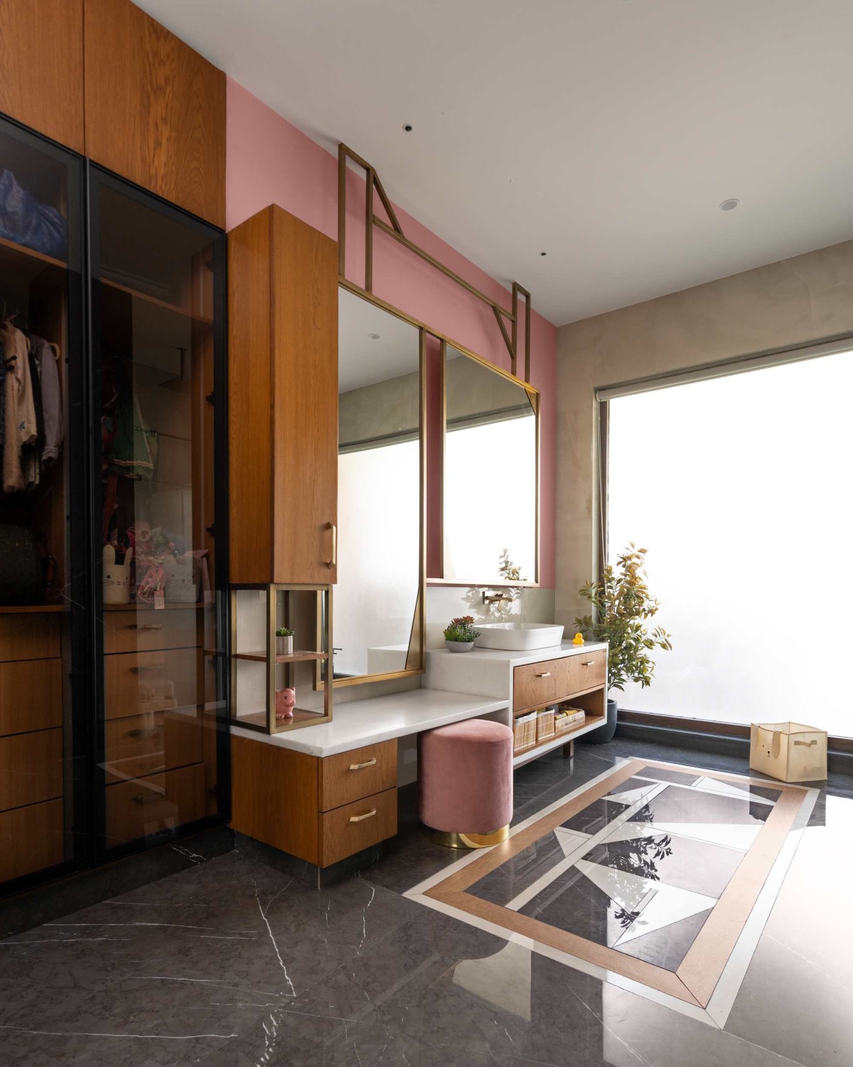The kid’s washroom is designed as an open spacious area with a U shaped walk in glass wardrobe and a separate dressing and vanity wall. The washroom has a combination of dark grey and white tiles and an abstract flooring pattern with just the mirror wall painted in a pastel pink shade to complement the bedroom. The vanity is carefully designed with two large brass framed mirrors hanging down from the ceiling at different lengths for the dressing and the wash area. The vanity also has storage at various levels to provide ease of access to the kids. The shower area also has huge glazing allowing ample natural light. The space is also filled with plants to enhance it.