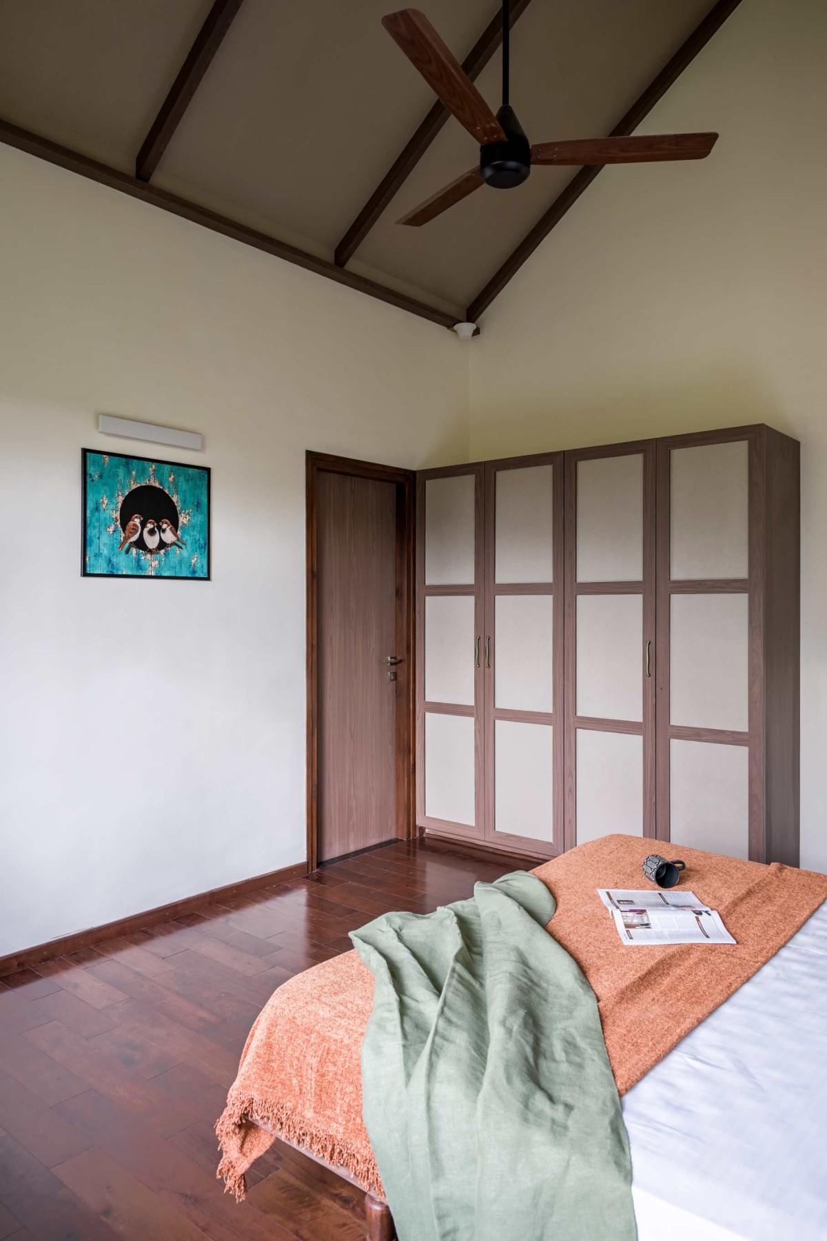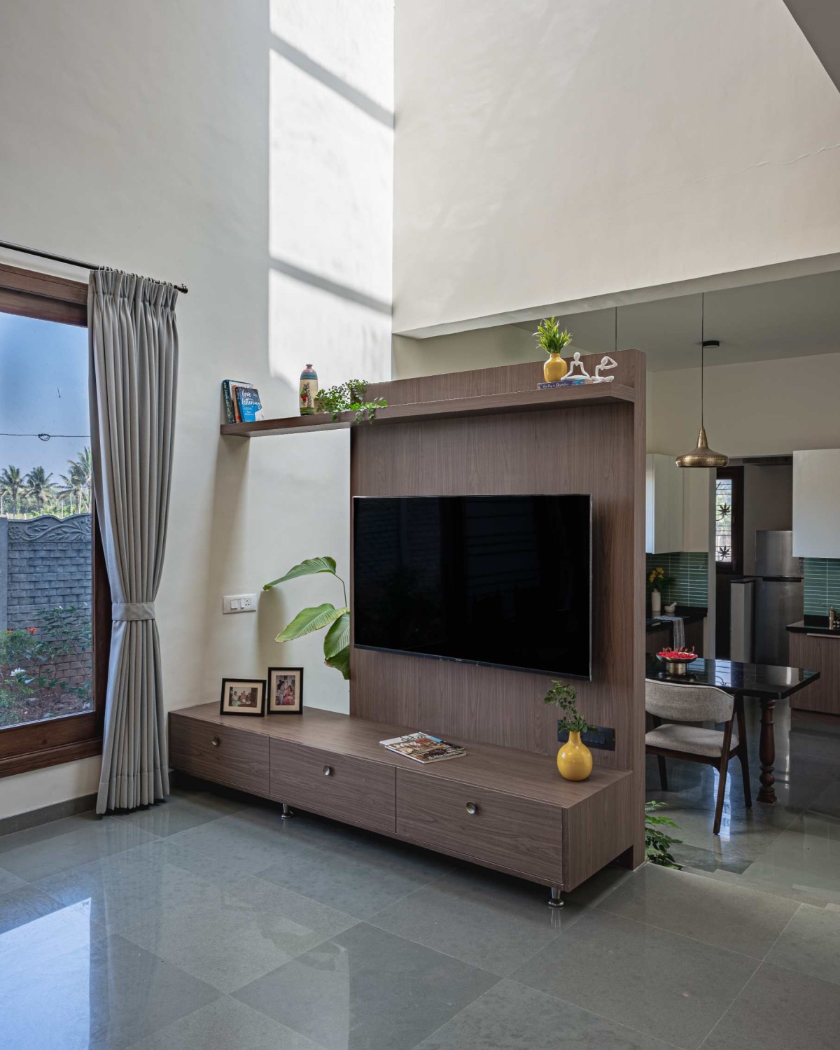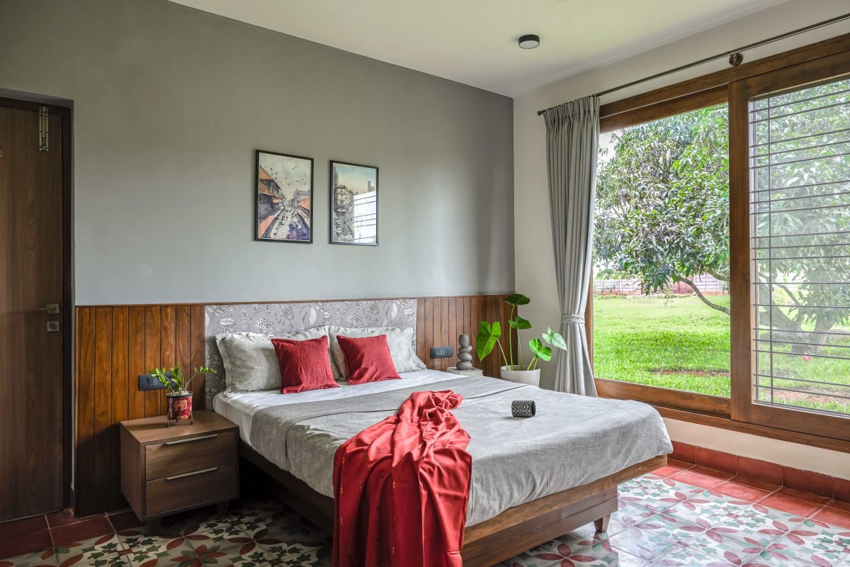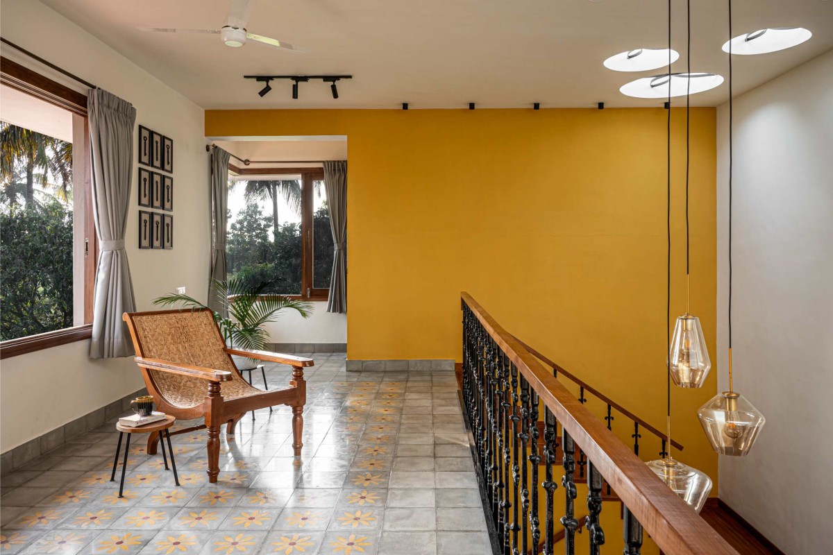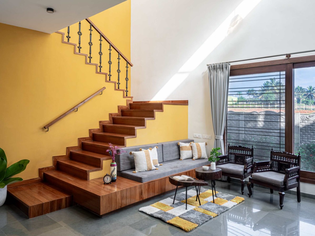 An antique Chettinad door, lovingly restored to its former glory, welcomes visitors into the farmhouse. This heritage piece anchors the home’s narrative, bridging the past with the present. Beyond the threshold, a double-height living room unfolds, offering a grand yet inviting ambiance. The space features a mix of fixed seating and heritage furniture, sourced from Chettinad homes, exuding authenticity and timeless charm.