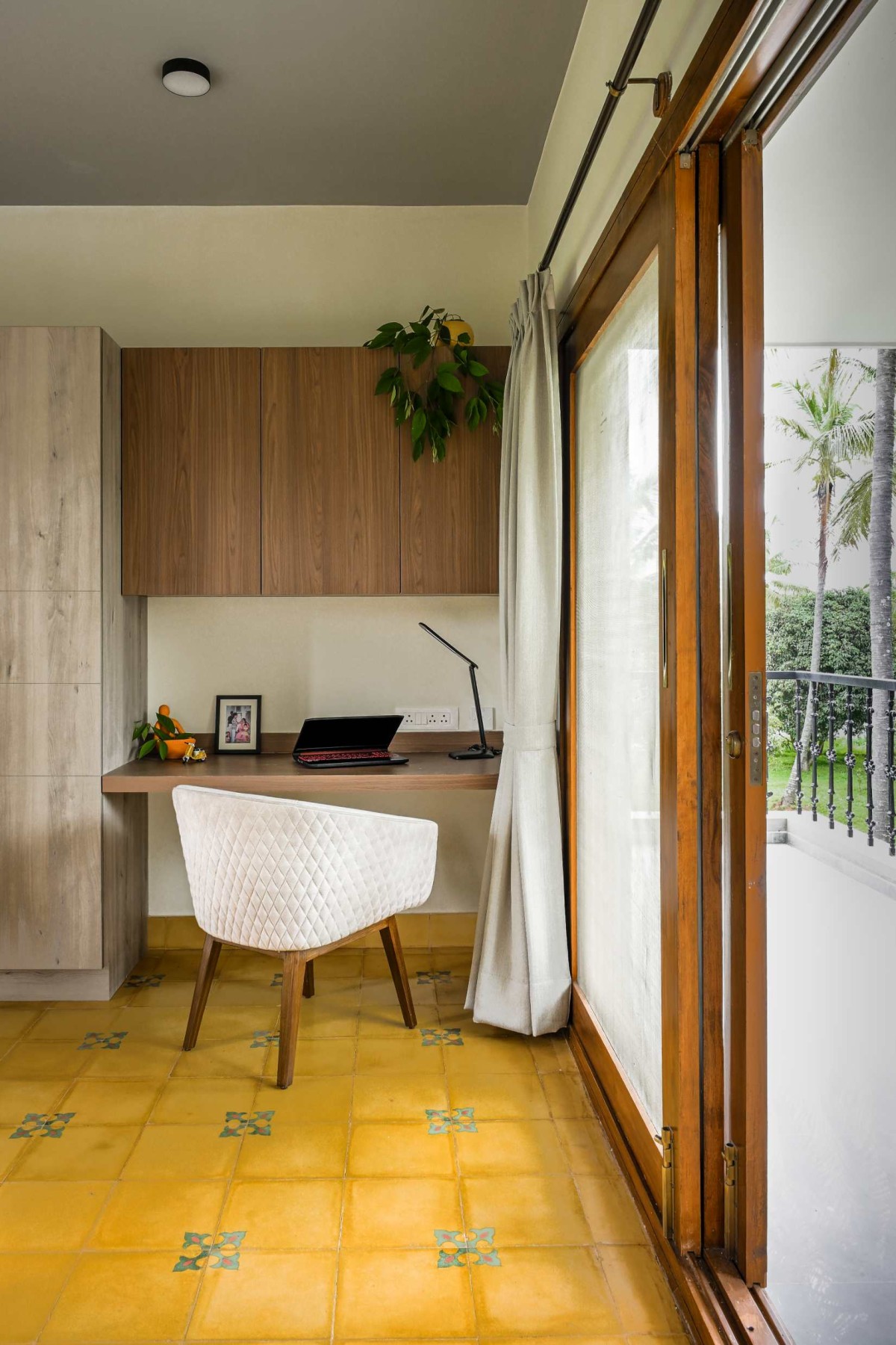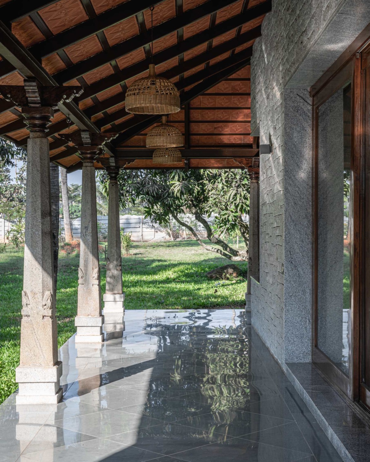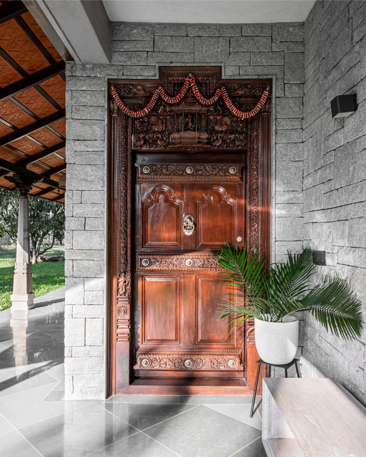 The verandah serves as a tranquil gathering space, effortlessly balancing functionality with aesthetic appeal. A Mangalore-tiled roof, supported by antique stone pillars sourced from Karaikudi in the Chettinad region, provides a rustic yet sophisticated charm. The Kota stone flooring, laid in an intricate diamond pattern, adds depth and texture, while the rough grey stone cladding, expertly chiseled and installed on-site, underscores the artisanal craftsmanship involved. This inviting outdoor space seamlessly transitions into the home, setting a warm and elegant tone.