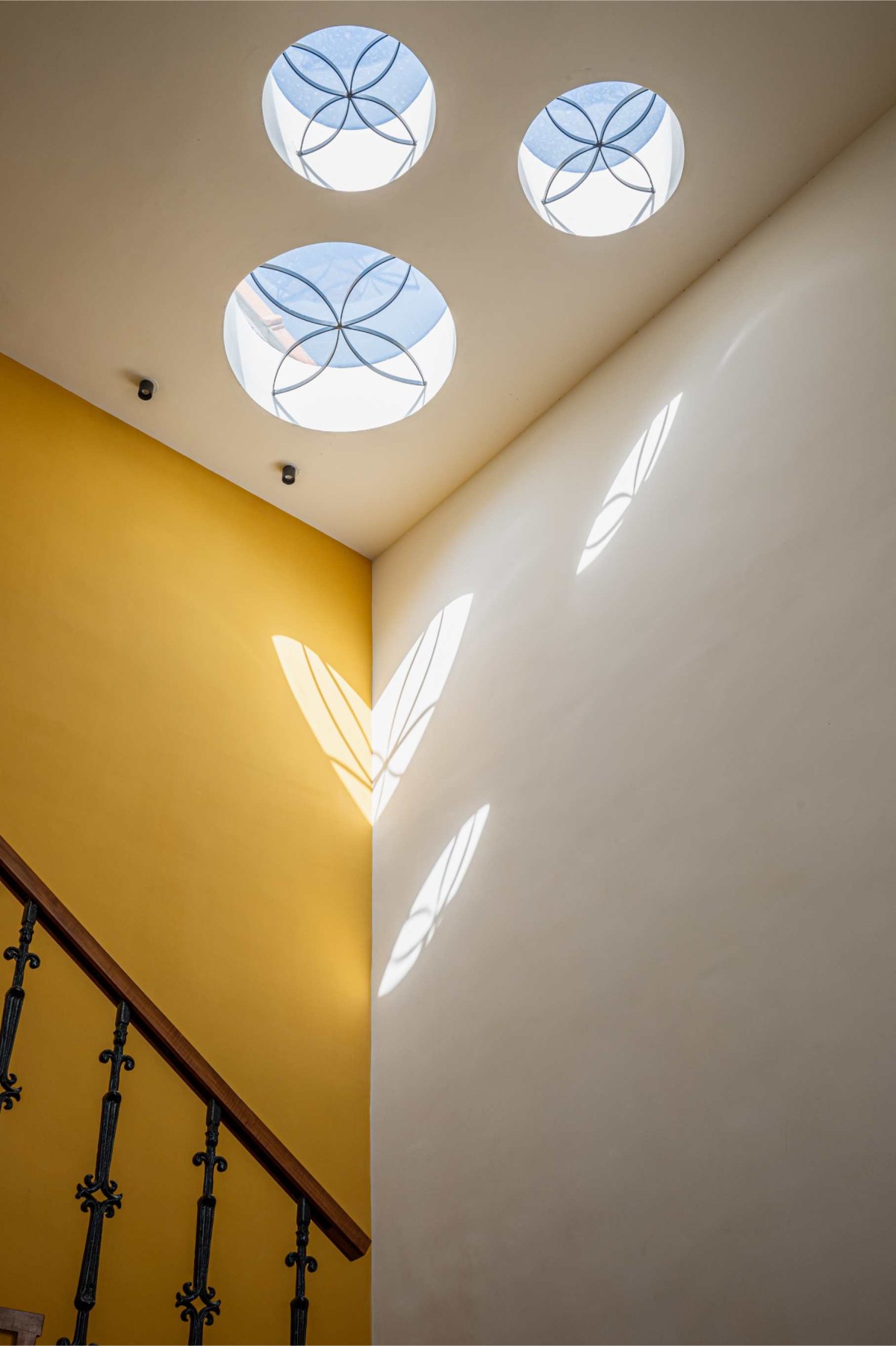 Natural light is integral to the home’s design, with strategically placed skylights flooding the interiors with daylight. The circular skylights above the staircase landing create dynamic patterns of light and shadow, offering a visual spectacle as the day progresses. A compact landscaped courtyard, nestled between the kitchen and living area, further enhances the home’s connection to nature. Illuminated by an overhead skylight, this green nook provides a refreshing contrast to the interiors.