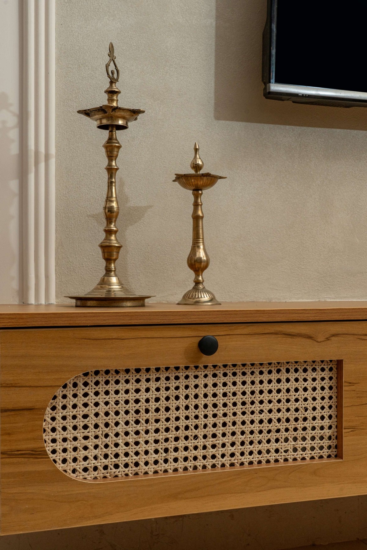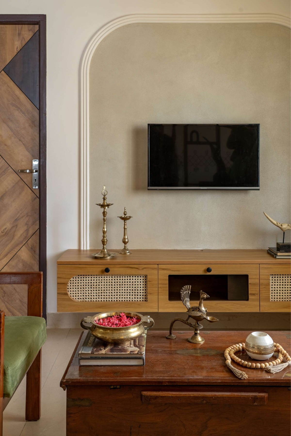 The design language of Ādya is rich in detail. The textured wall backdrop behind the TV unit is highlighted with delicate beading that frames it, giving depth and definition to the feature wall. Furniture pieces suit the scale of the spaces, combining clean lines with traditional hints in form and material.