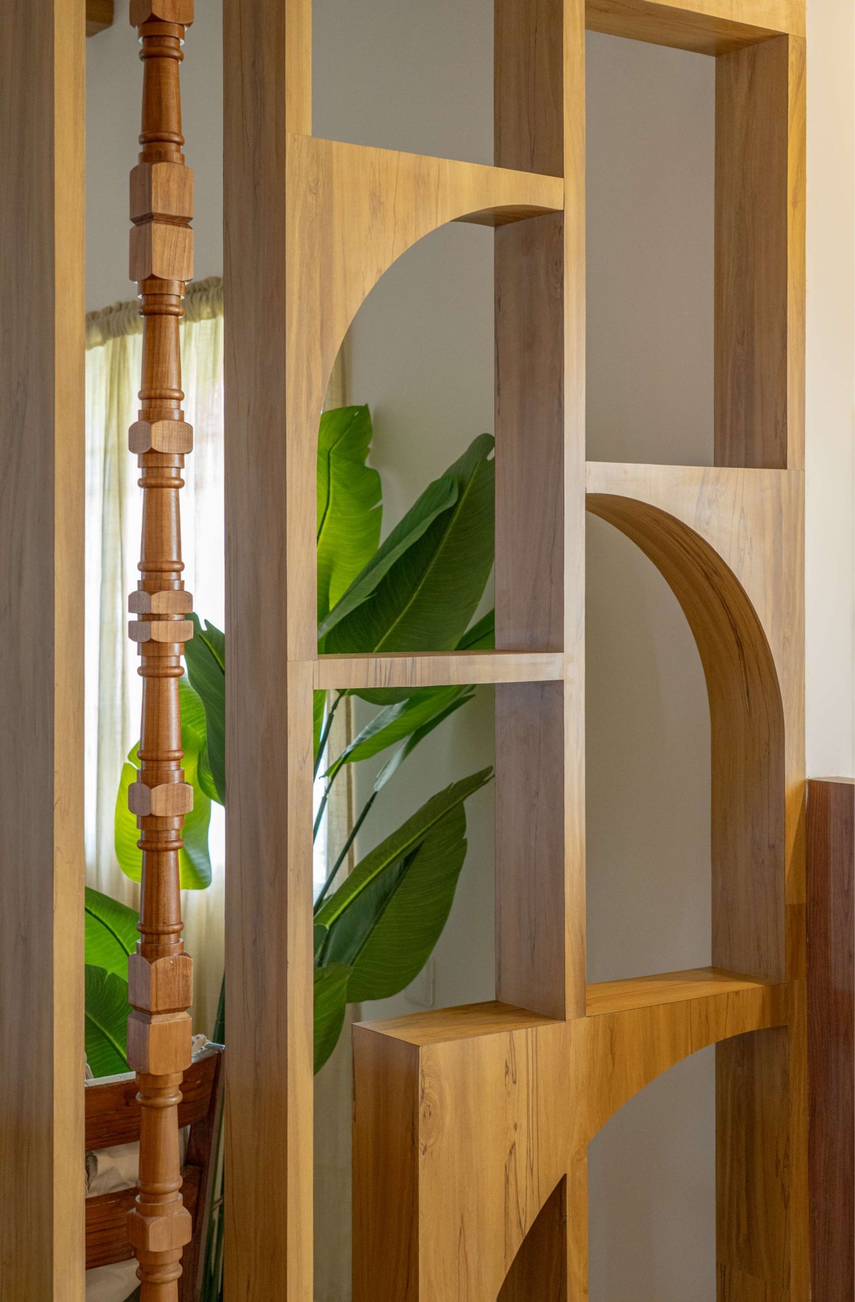 Detailed shot of wooden partition between living & dining of Project Ādya by Concept-D Architects