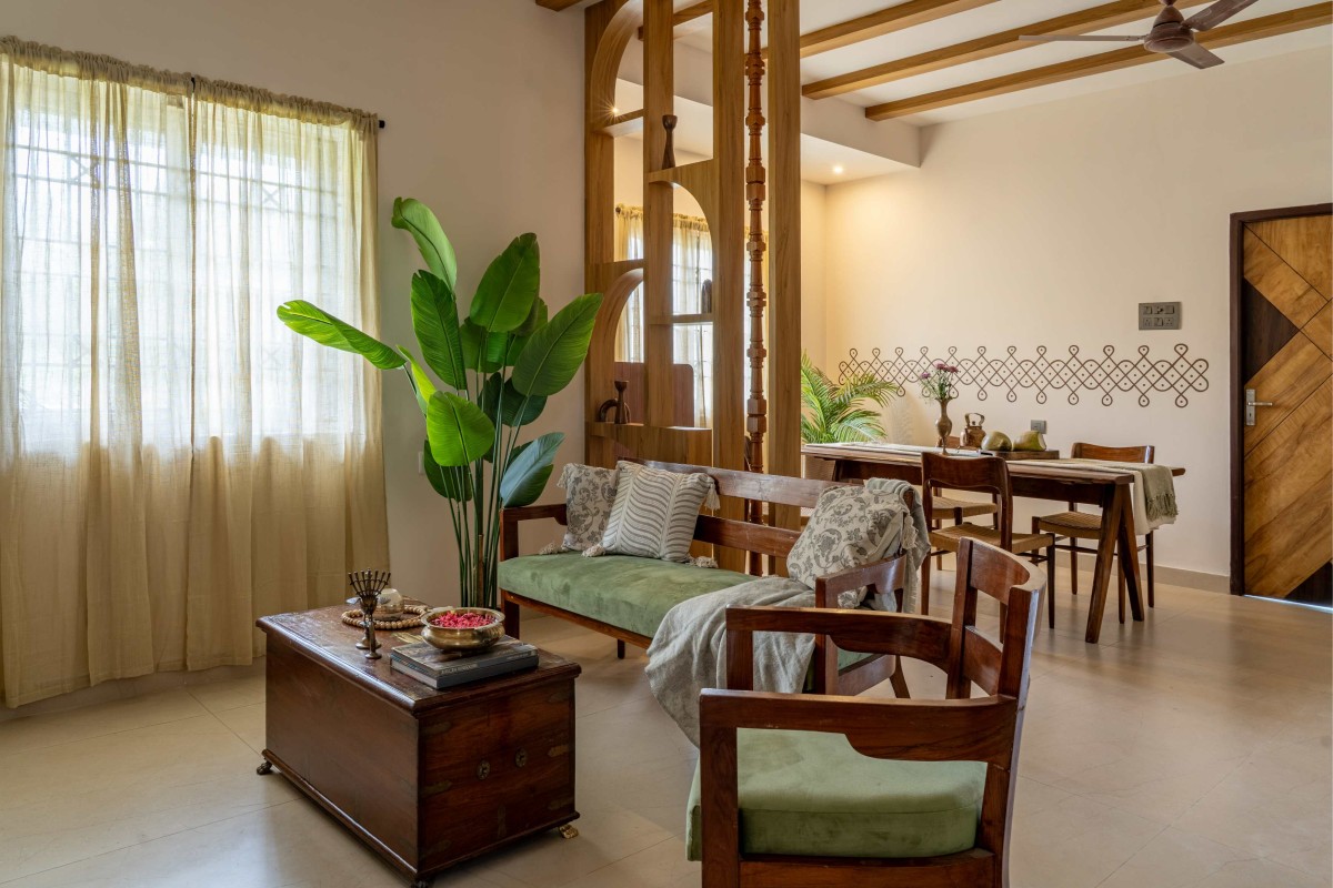The planning ensures that the interiors flow intuitively while maintaining a balance of openness and subtle zoning. The living room sets the tone with its warm furniture, wooden accents, and cozy atmosphere. A carefully crafted partition introduces definition without blocking connectivity, creating a sense of separation while retaining visual continuity.