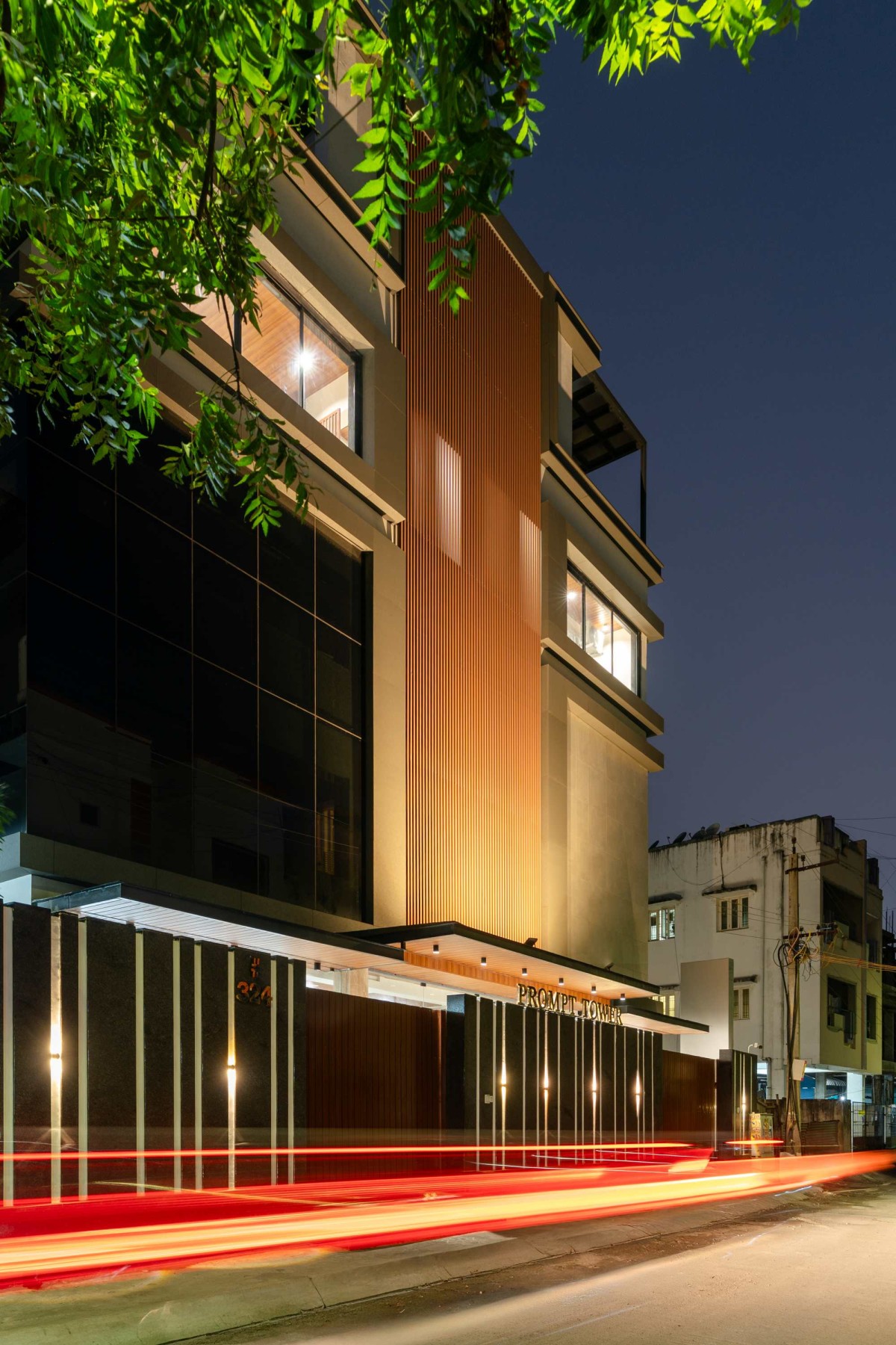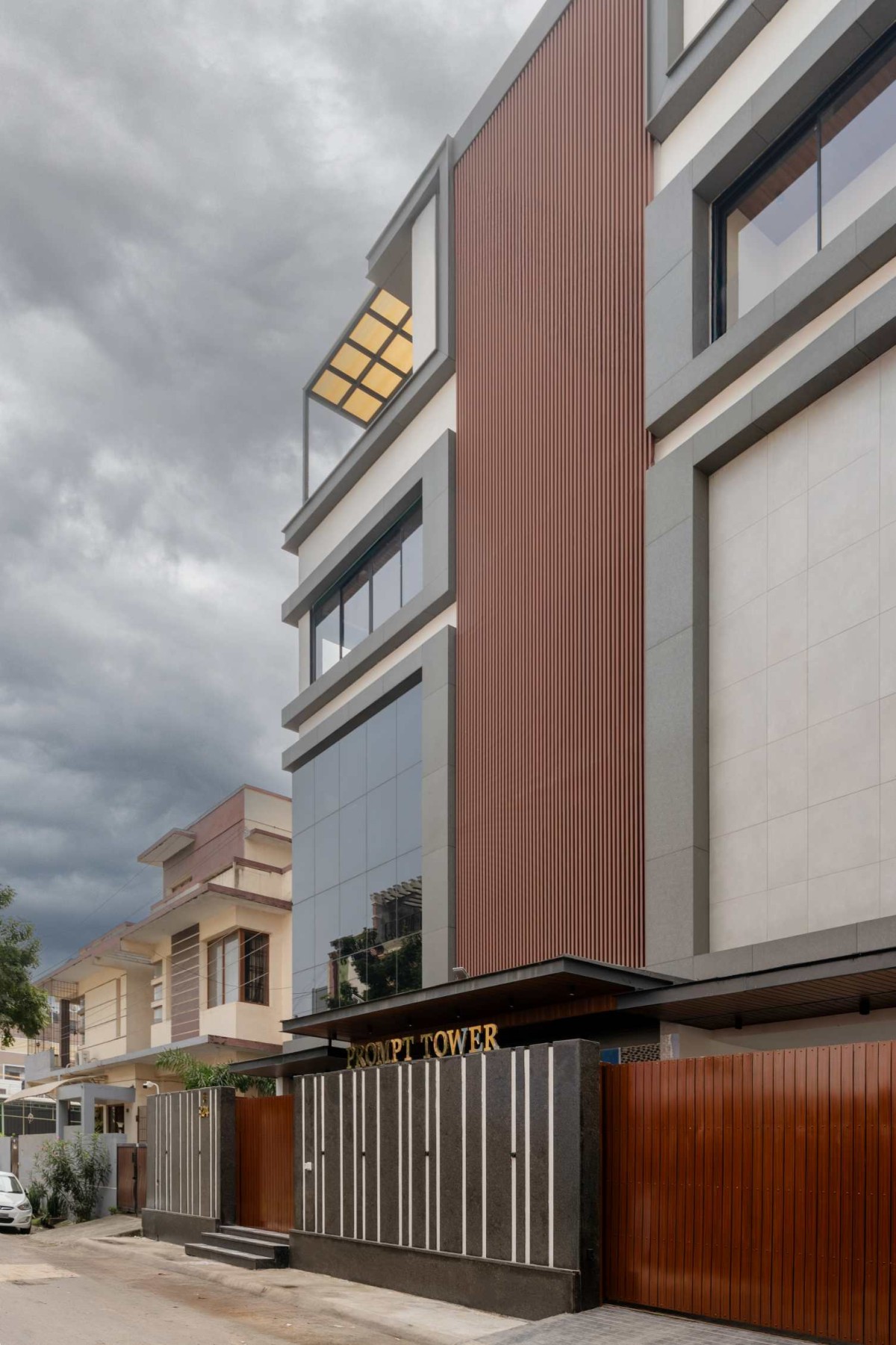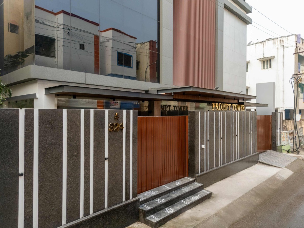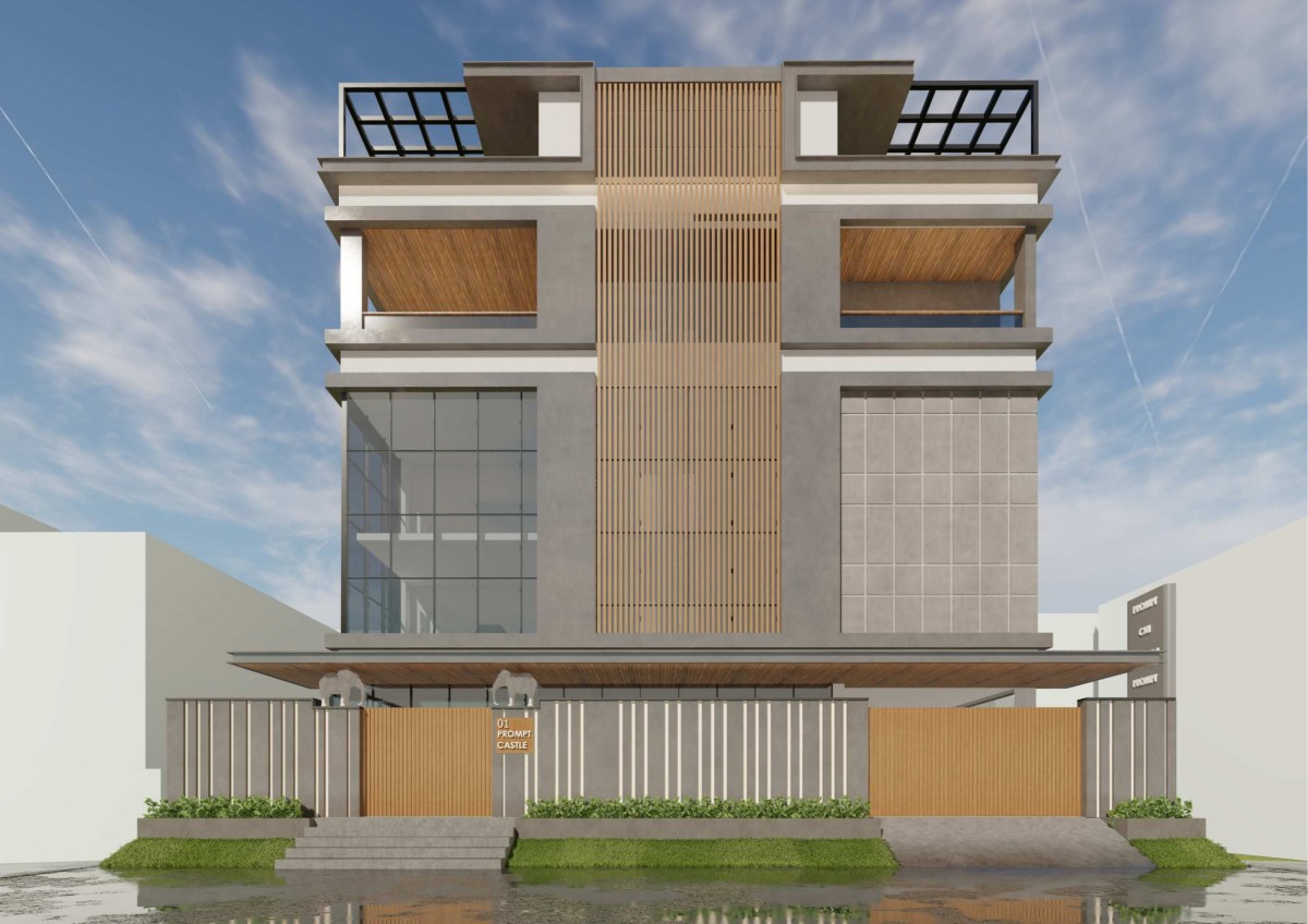 Prompt Castle is conceived as a contemporary mixed-use building where commercial efficiency and residential comfort coexist within a unified architectural language. The primary design driver was to articulate program clarity while responding to climate and urban context. The building is vertically stratified, with lower floors accommodating offices and upper floors housing residential apartment, yet visually unified through a consistent material palette and proportional system. A bold vertical louvre screen establishes identity while functioning as a climatic buffer, regulating sunlight and enhancing privacy. This vertical emphasis is counterbalanced by horizontal slab edges, creating a clear rhythm of solid and void. Strategically placed glazing maximizes daylight penetration and visual connection without compromising comfort.