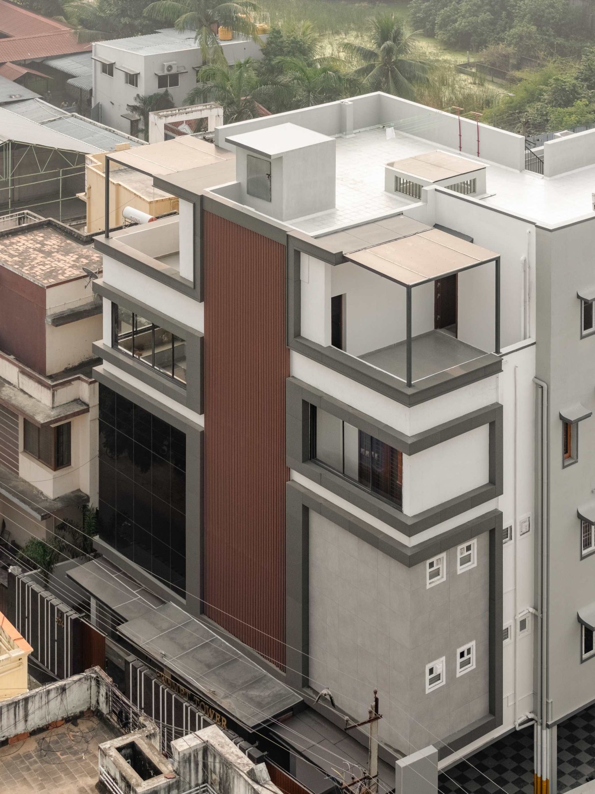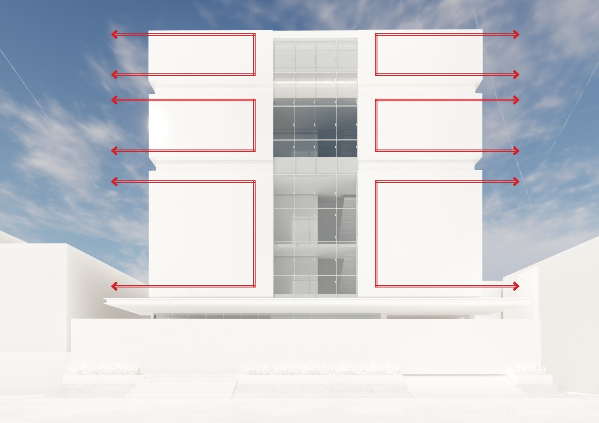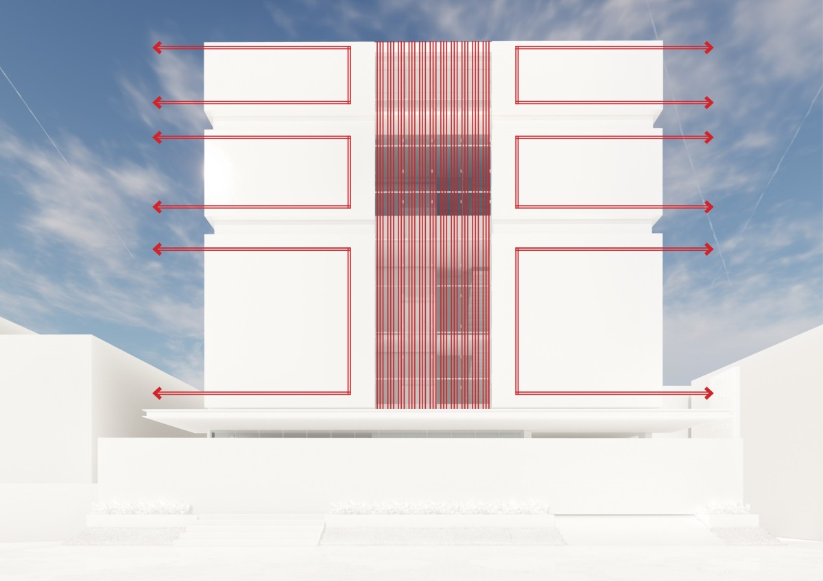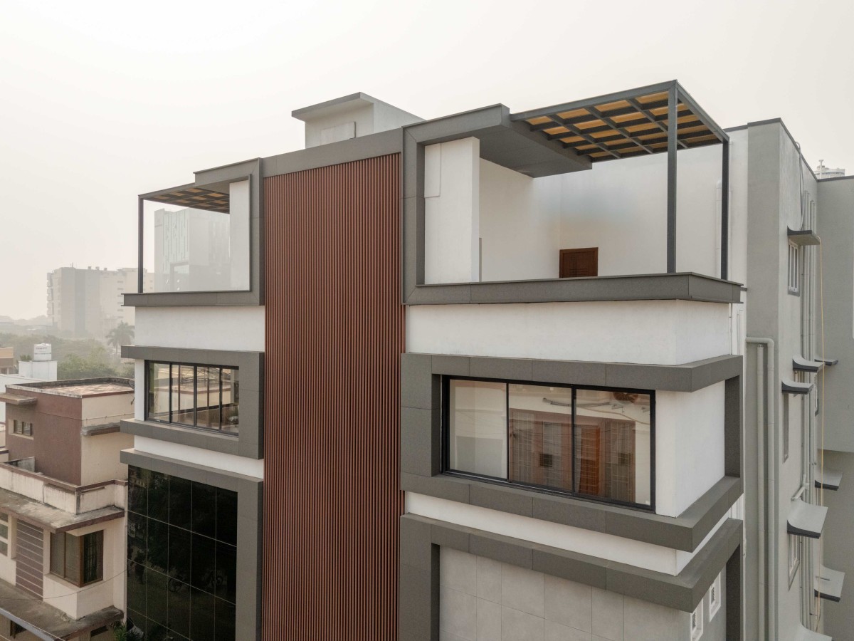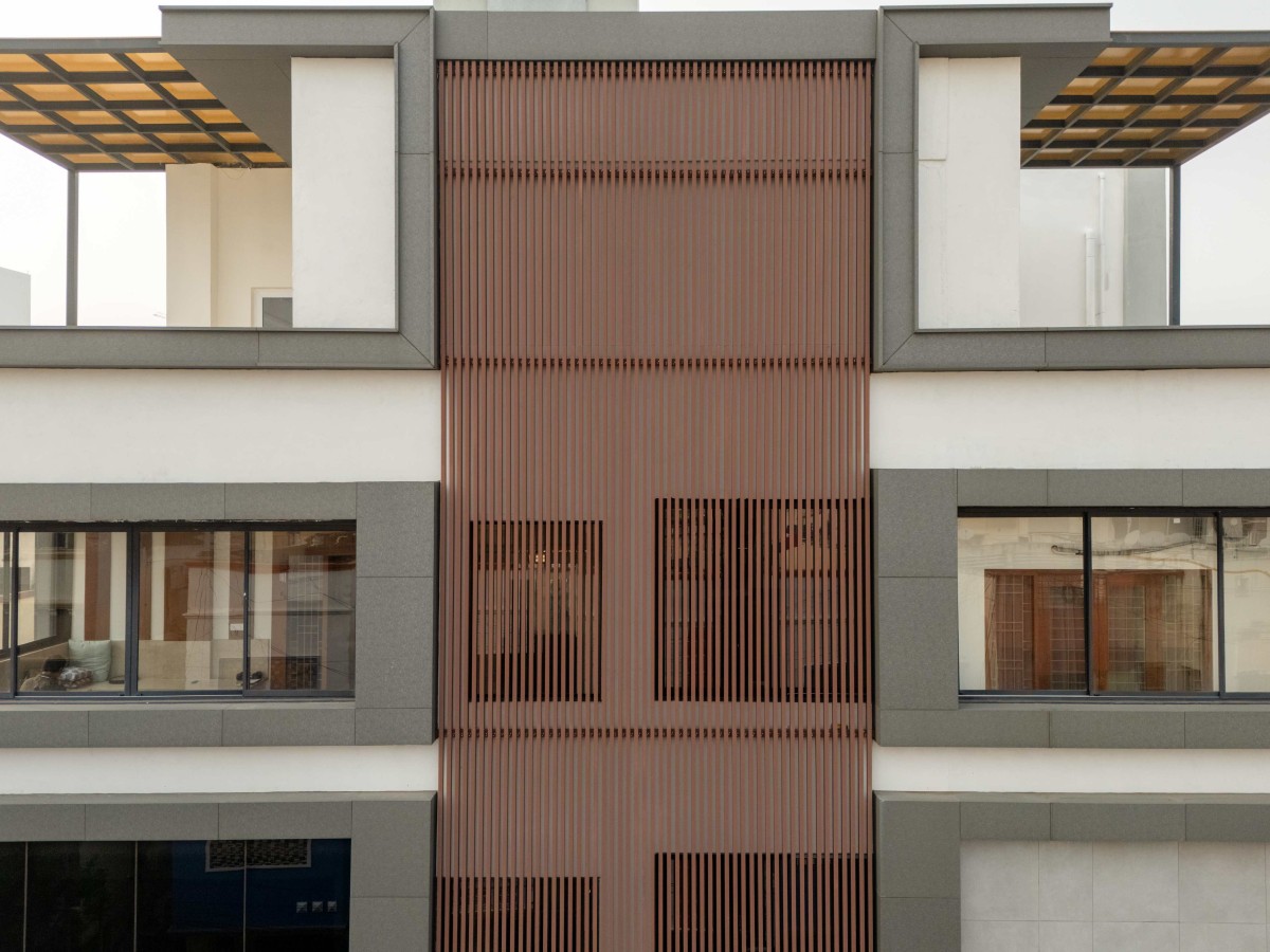 The design process began with an analysis of site orientation, access, and surrounding built fabric to optimize daylight and ventilation. Program zoning was fundamental to the mixed-use strategy, placing office floors at lower levels for accessibility and visibility, while residential were elevated to ensure privacy and acoustic comfort. The façade was developed as a performance-driven system rather than a purely visual layer. Vertical louvres were introduced along the central mass to control solar gain, reduce glare, and add depth to the elevation. Glazing sizes and positions were calibrated according to orientation to balance daylight and heat control.