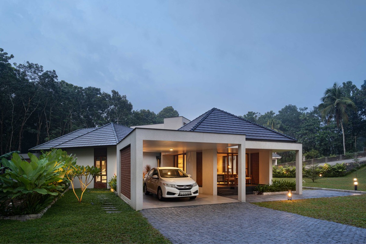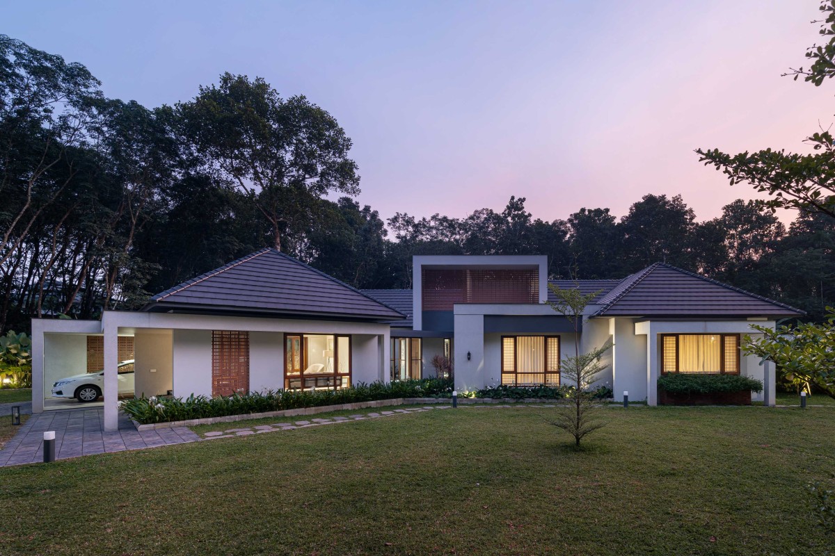 Dusk light exterior view of Puthumullil House by McTerra Architects