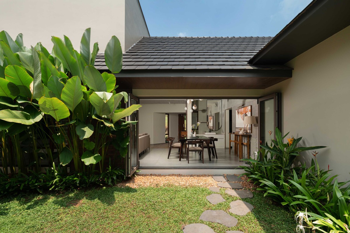 Lawn to dining view of Puthumullil House by McTerra Architects