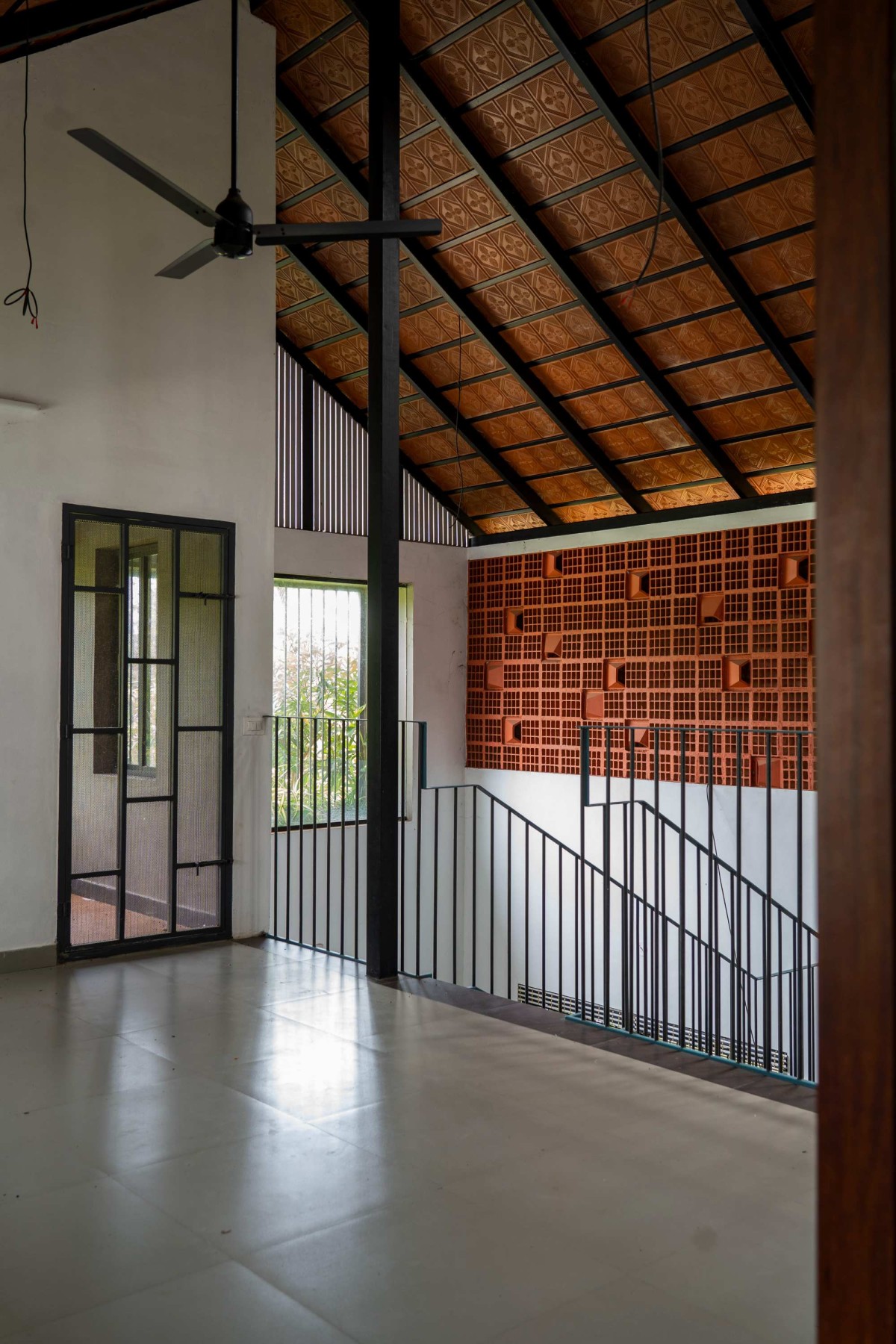 As a west-facing residence, the house incorporates thoughtful facade treatments to mitigate heat gain. The ground floor features a shaded sit-out and a well-protected living room, while the first-floor balcony opens to an expansive field, offering stunning sunset views. This space doubles as a quiet corner for gardening and evening relaxation. The planter boxes not only serve as green buffers but also enhance the visual serenity of the balcony.