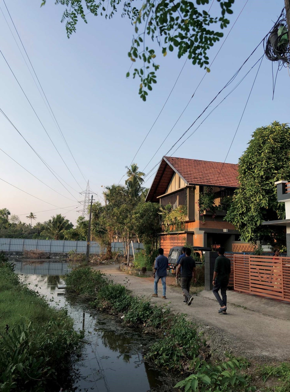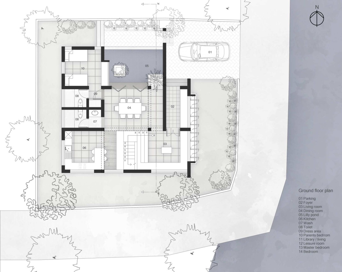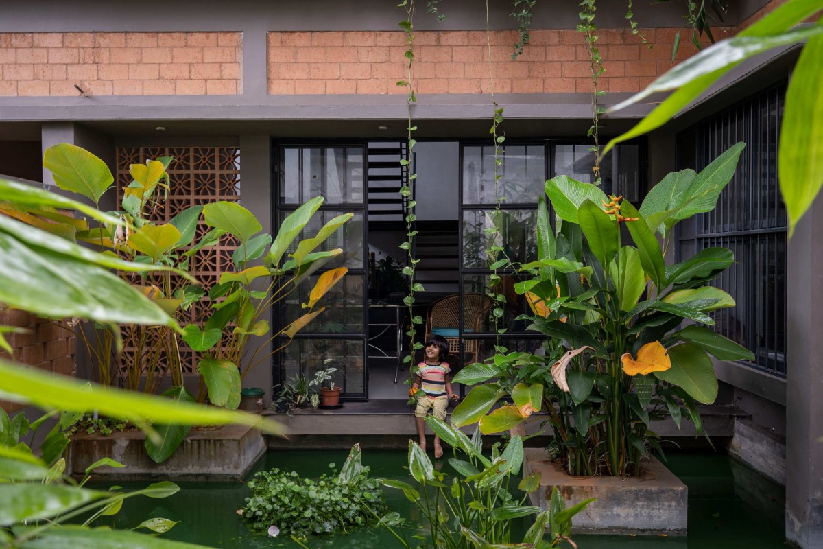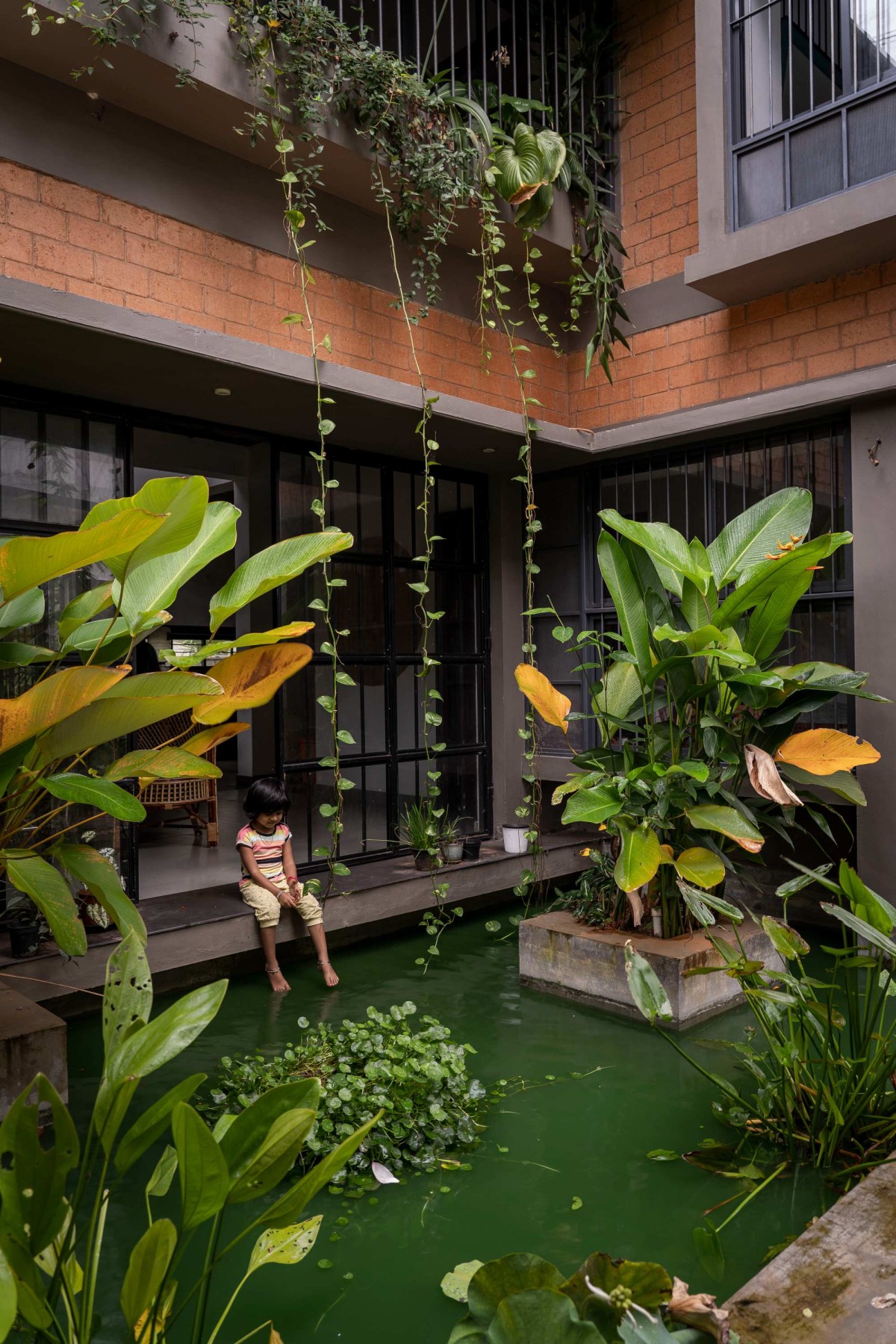 The house comprises three bedrooms, a living area, a dining space, and a kitchen on the ground floor. An upper-level living area, combined with a cozy library, opens out to a planter box that enhances the biophilic experience. A shaded pond on the southern side, benefiting from the shadow of the adjacent building, contributes to the home’s thermal comfort and creates a tranquil microclimate.
