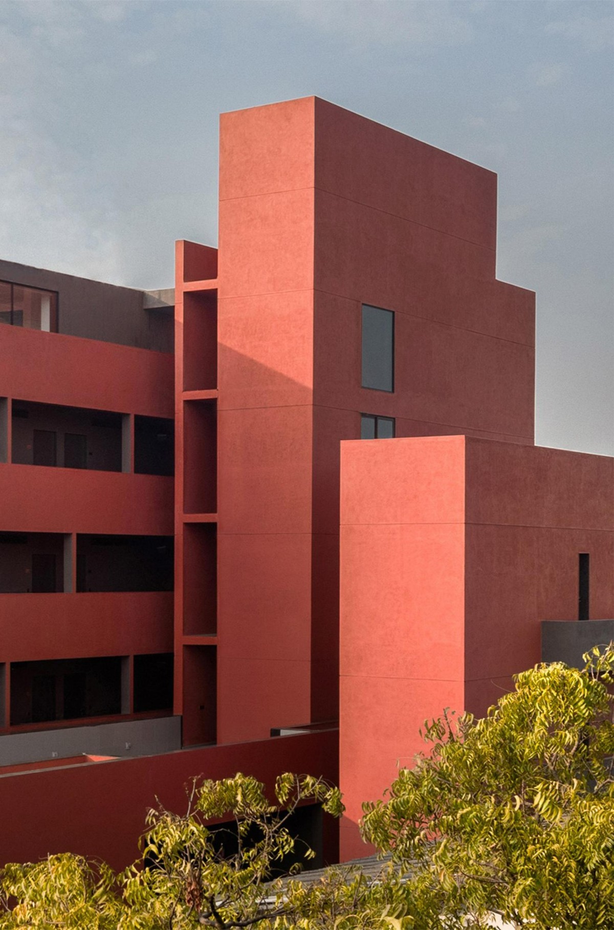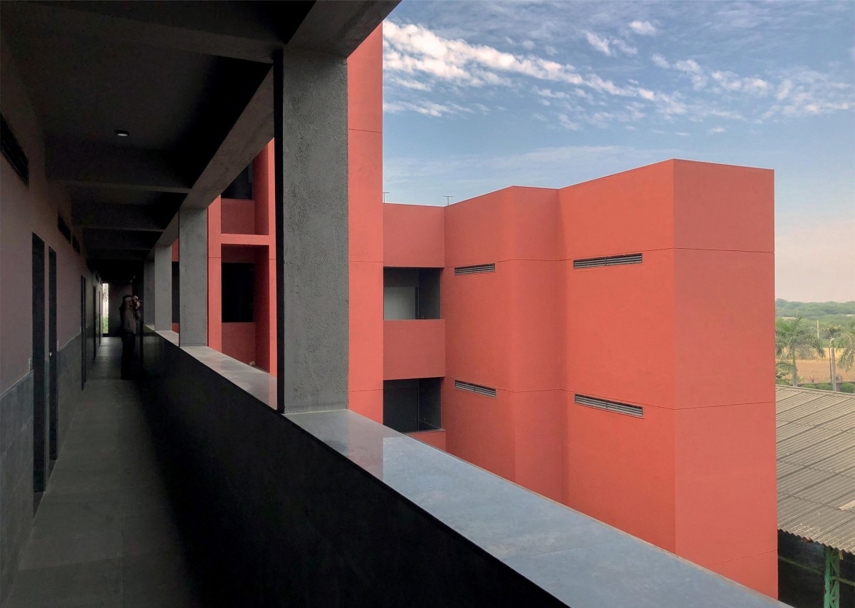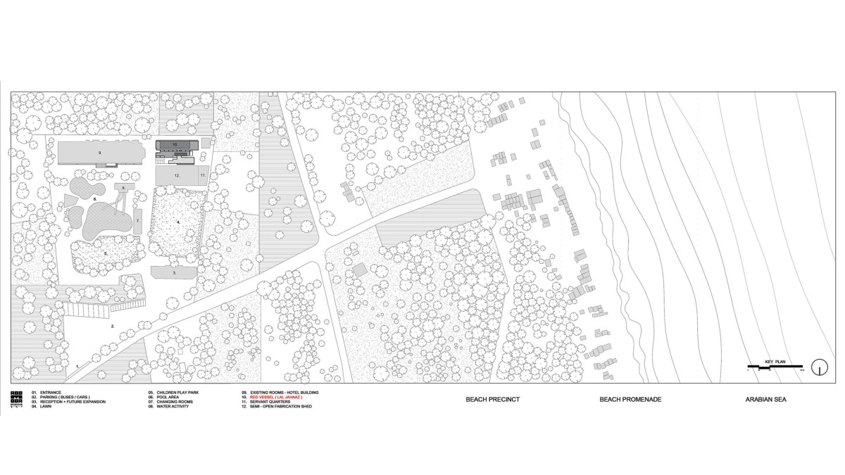 Set amidst a coastal landscape on the Arabian Sea, Red Vessel / laal jahaaz (Hindi) is a hotel annex about an hour's drive from Surat city in Gujarat, India. The context comprises sparse rural settlements, diverse flora marked with palms, and coconut trees with an omnipresent sea breeze. The design intervention is part of a larger resort master plan that caters to recreational and socio-cultural events. It has a small water park with swimming pools, a children's play garden, congregation lawns, and an existing hotel building housing 35 rooms.