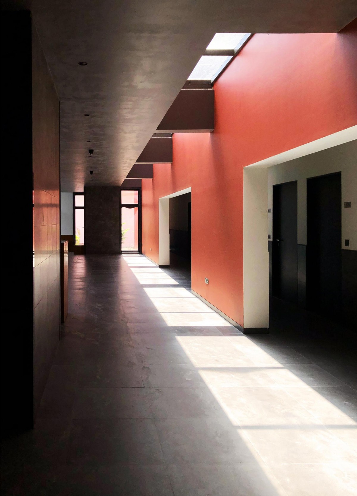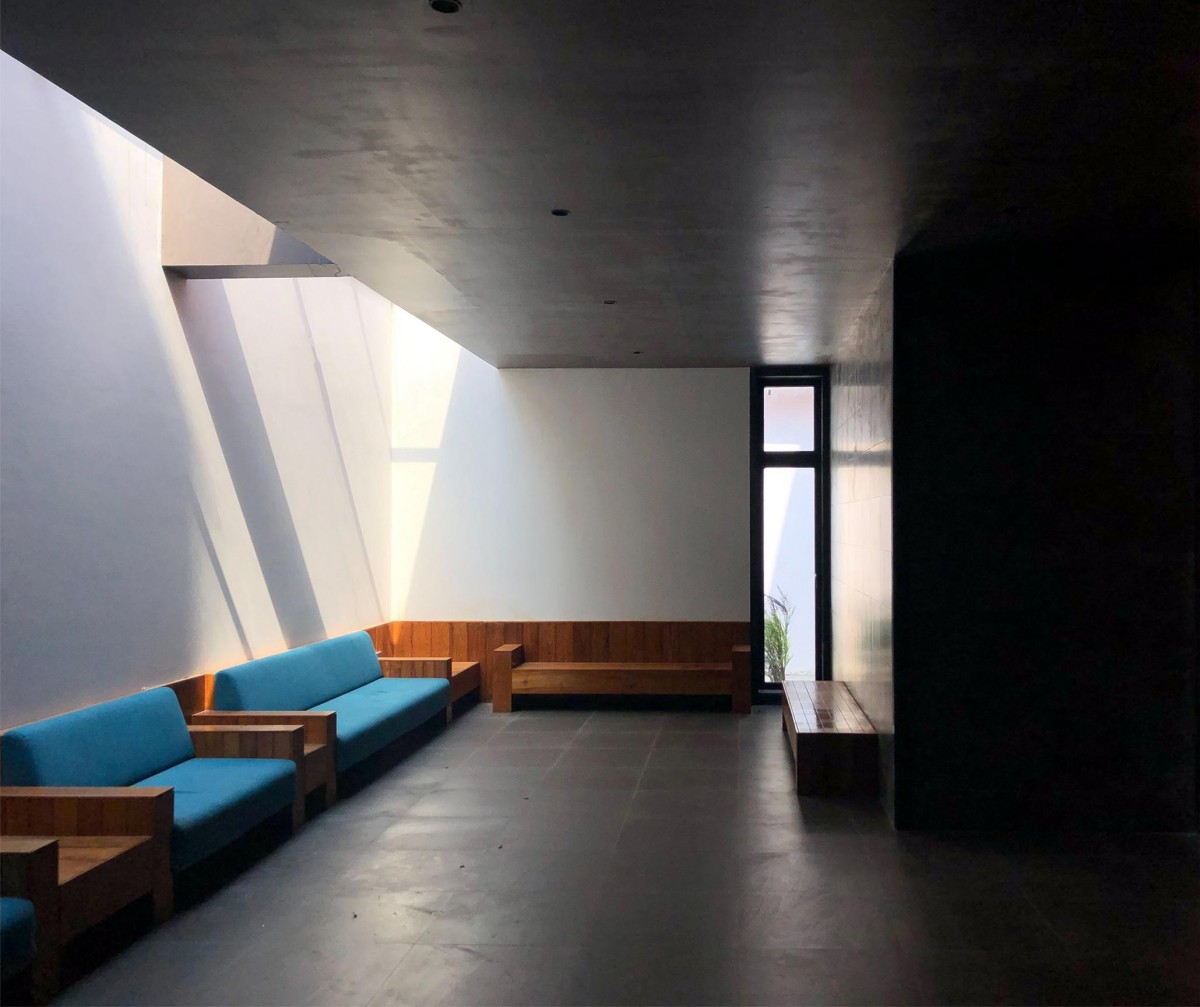 One encounters tall red shafts and passes through the entrance, gradually shifting to a dark interior with diffused natural light, a space akin to a primitive cavern. Walking along the light trail of skylights, one discovers a hidden staircase and vertical circulation. A path begins from tall and narrow space proportion of site constraints that opens up to deep panoramic views of the coastal seascape, creating anticipation as one goes through diverse spatial qualities of changing light, depth, and compression; culminating in a final release on the open sky terrace, where the sky and the sea converge into a singular line. A mere parapet remains of the building as the sea takes center stage. The breeze and sounds of waves take over as the setting Sun paints the sky with its reddish-yellow hue; a moment of calm presides over the scene. The eyes gaze toward silhouettes of ships passing by, deep in the distant horizon. The experience offers a contemplative getaway to the guests in an architecture that attempts to converse with the serene natural elements.