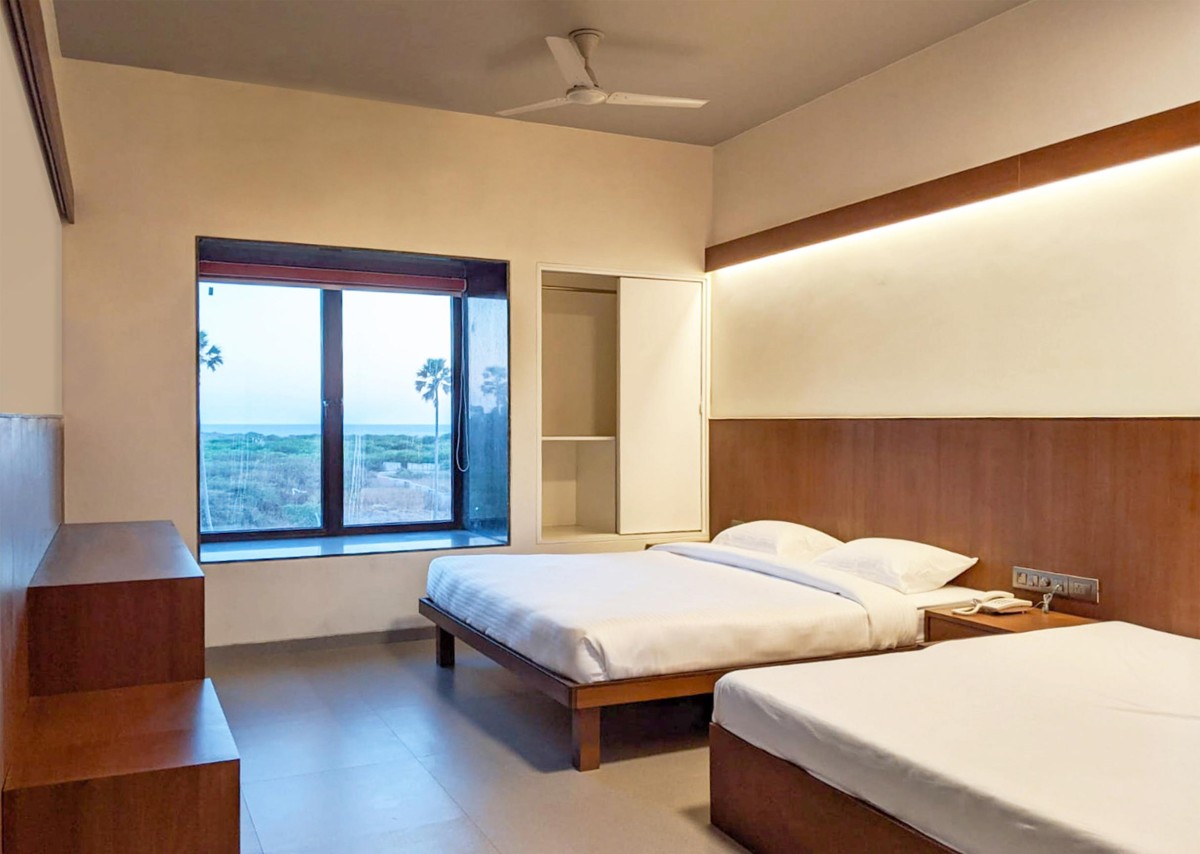 The hotel typology has an aspect of temporality, an in-between, or a transitory dwelling condition. This idea of transition is adapted consciously, with the structure becoming a portal from land to sea. Three parallel linear structures are connected with semi-open corridors fostering connections with the surrounding landscape. The east-to-west spanning linear blocks create a self-shading morphology, with gaps between the blocks acting as wind shafts due to their narrow proportions. A four-story Southern block has 40 rooms that can host 160 guests. A room size of 3.65 meters X 6.35 meters forms the basis of the proportioning system. This block provides shade over the low-lying Eastern terrace, ensuring all-day comfort in the hot and humid climate. To the North is a two-storied dormitory block crowned with another terrace opening up to the lawn and distant surroundings.
