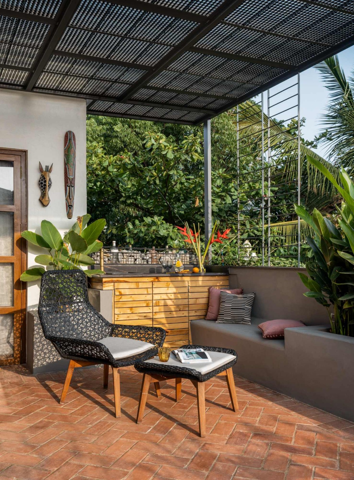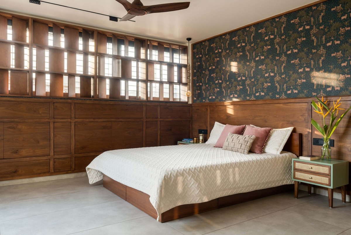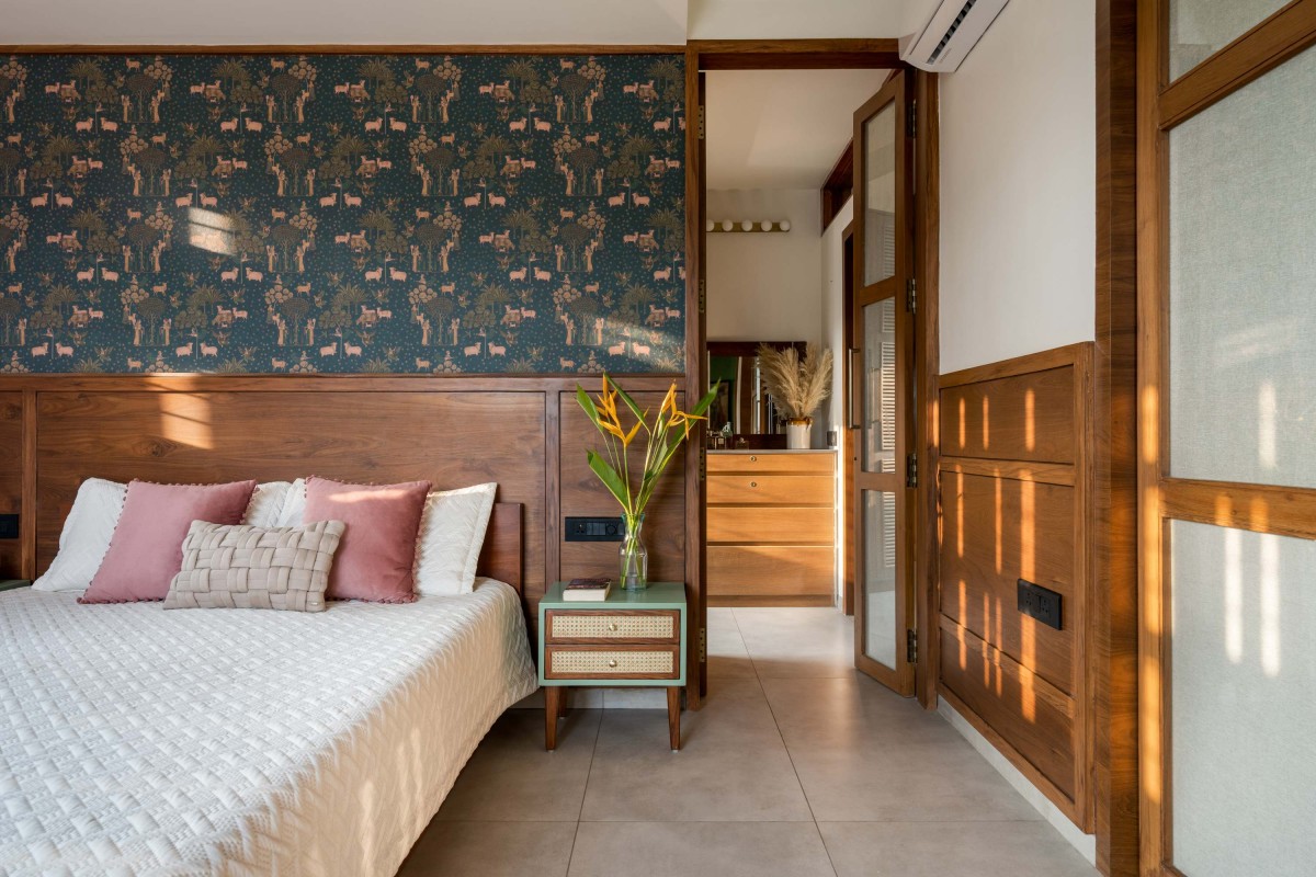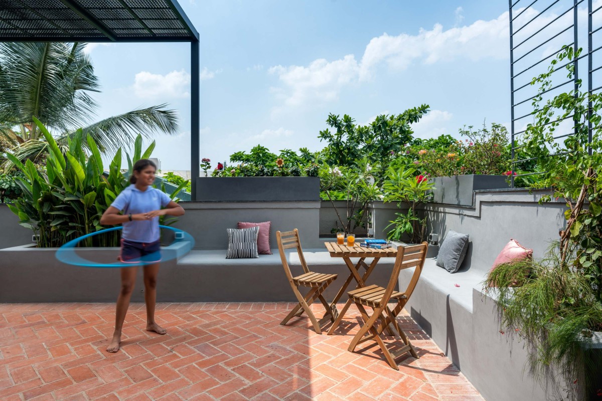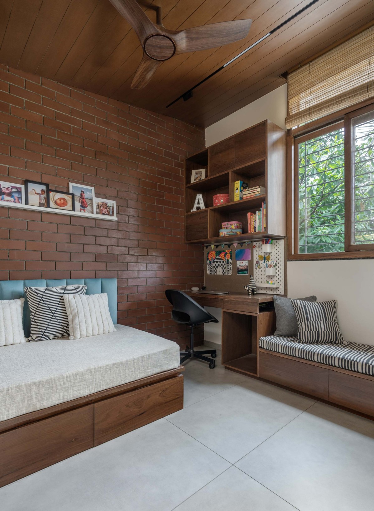 The upper floor forms the home’s retreat — an intimate, happy space where all bedrooms open onto an expansive 800 sq. ft. terrace. This outdoor extension serves multiple purposes, accommodating gatherings, workouts, work sessions, and moments of quiet connection with nature. The daughter’s room reflects her individuality — an expressive mix of brick textures, natural materials, and splashes of color, with ample room for her Lego creations and friends. The architects’ bedroom, on the other hand, is a poetic interplay of elements — a floating bed framed by three screen doors and a Sabyasachi wallpaper backdrop, allowing for varying spatial experiences of light, view, and privacy.