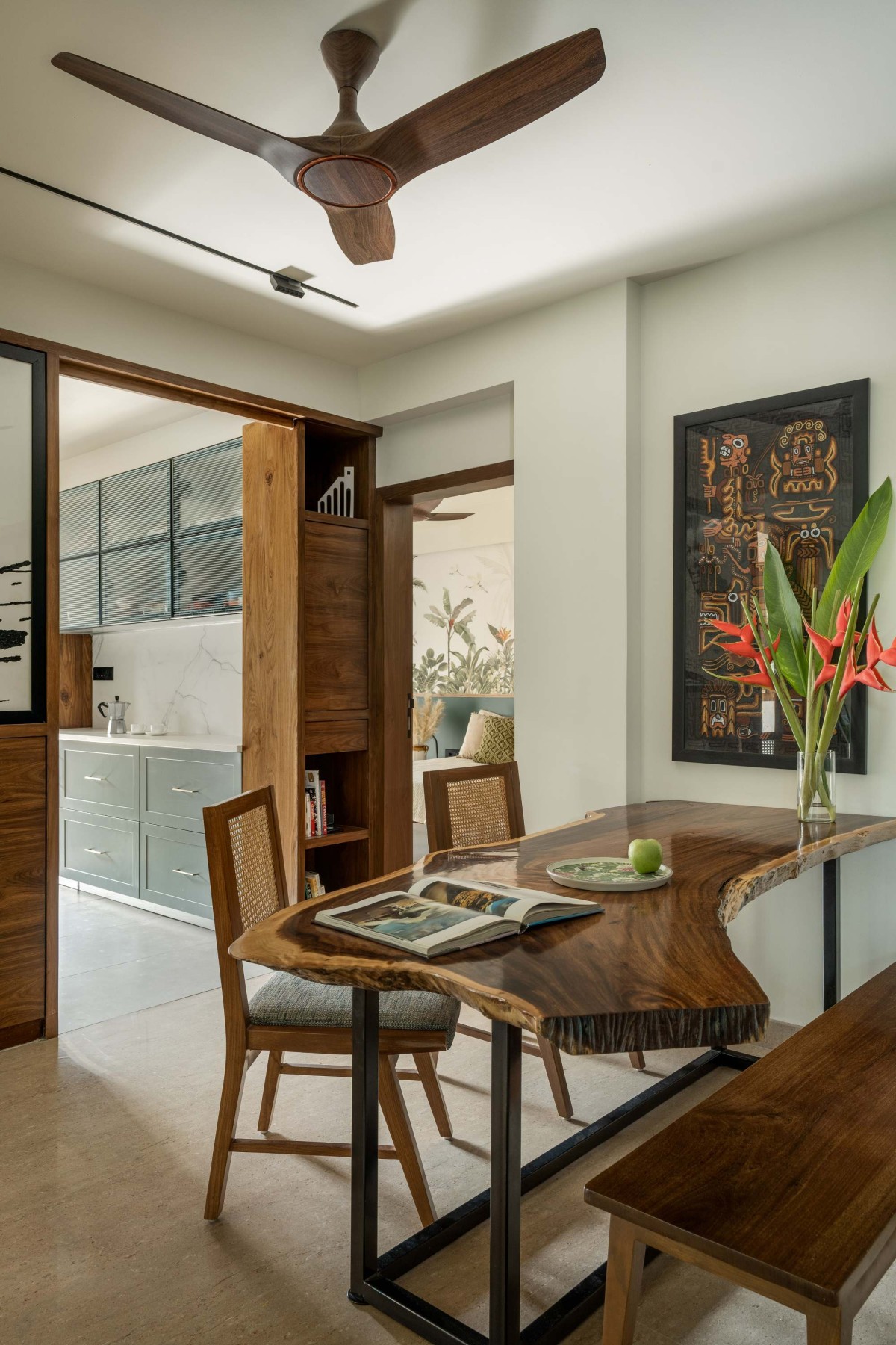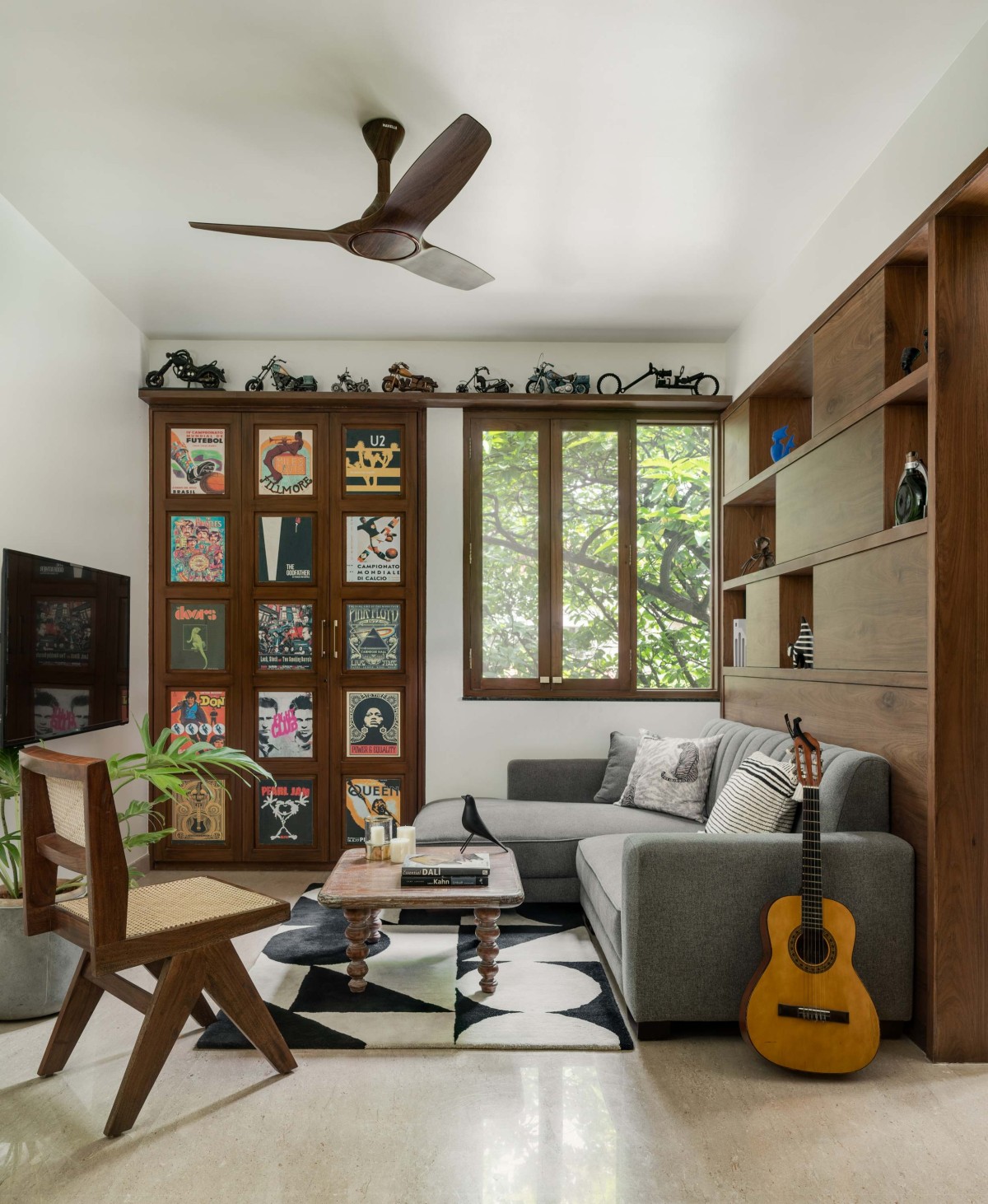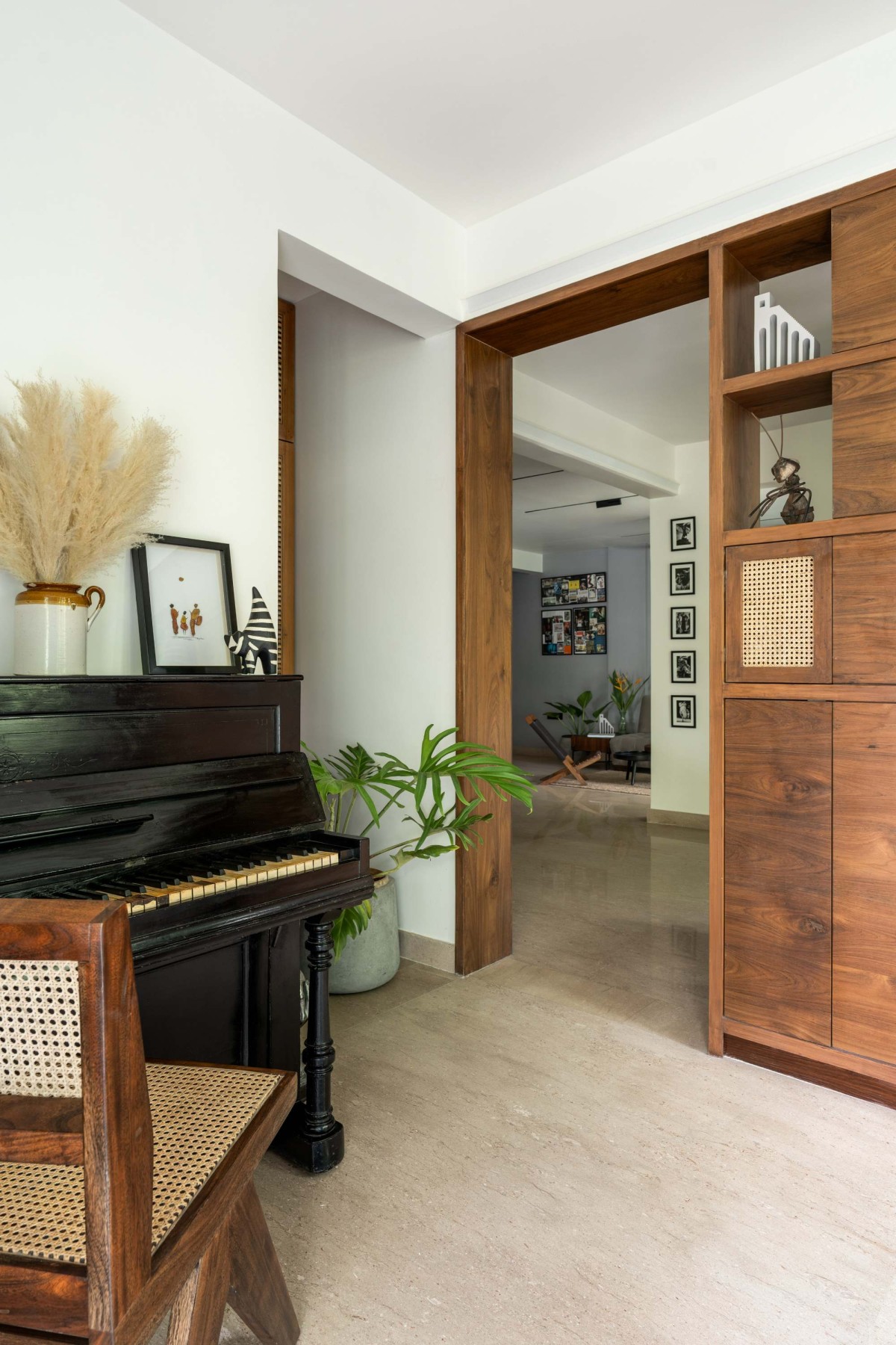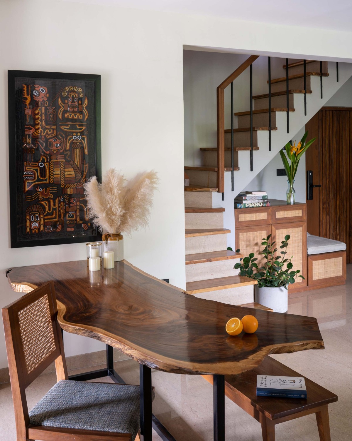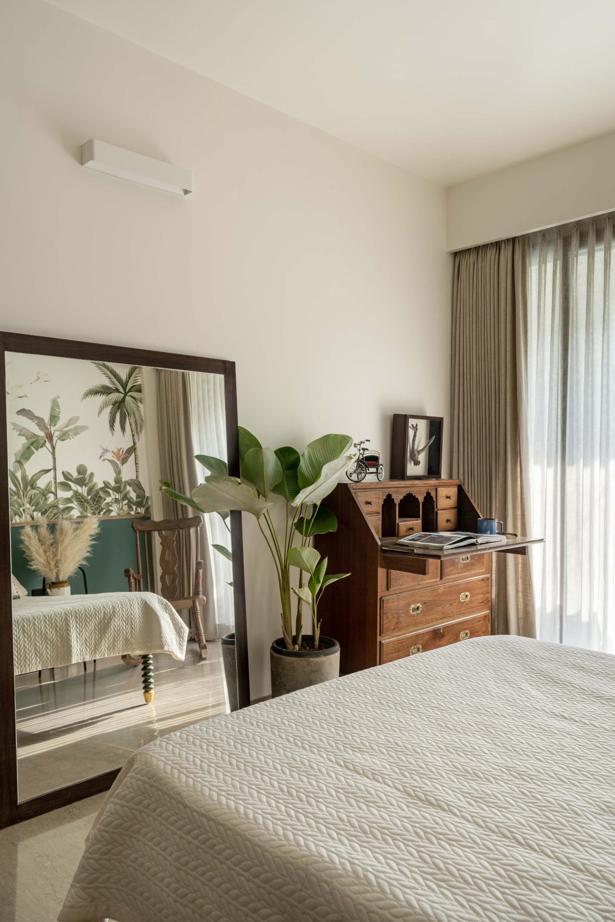 The upper floor forms the home’s retreat — an intimate, happy space where all bedrooms open onto an expansive 800 sq. ft. terrace. This outdoor extension serves multiple purposes, accommodating gatherings, workouts, work sessions, and moments of quiet connection with nature. The daughter’s room reflects her individuality — an expressive mix of brick textures, natural materials, and splashes of color, with ample room for her Lego creations and friends. The architects’ bedroom, on the other hand, is a poetic interplay of elements — a floating bed framed by three screen doors and a Sabyasachi wallpaper backdrop, allowing for varying spatial experiences of light, view, and privacy.