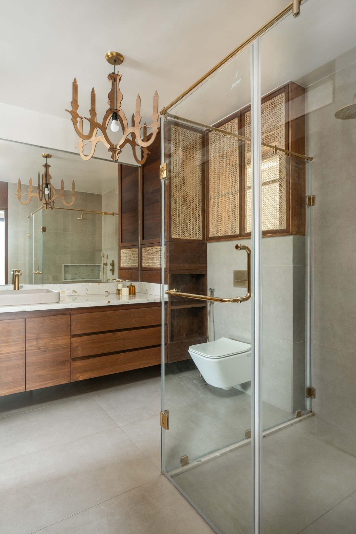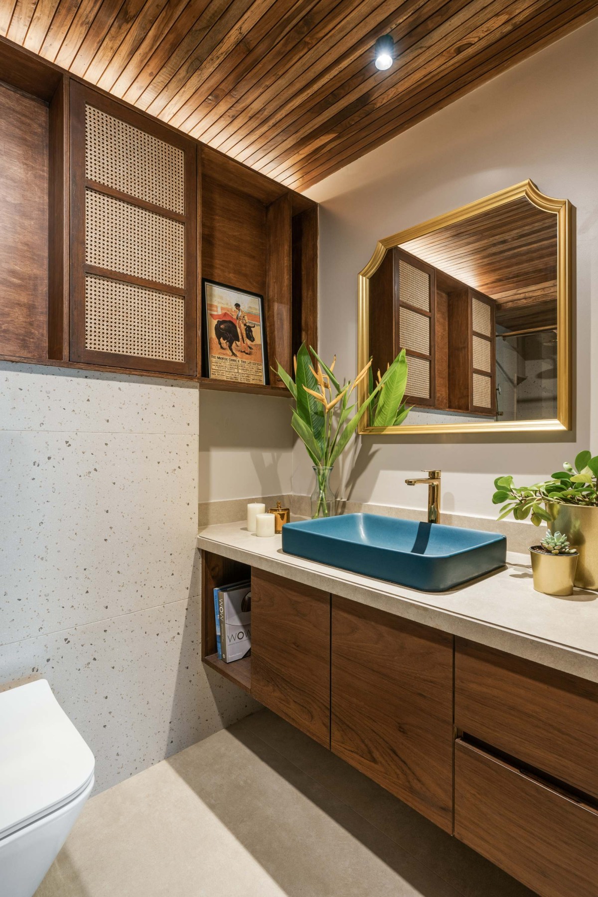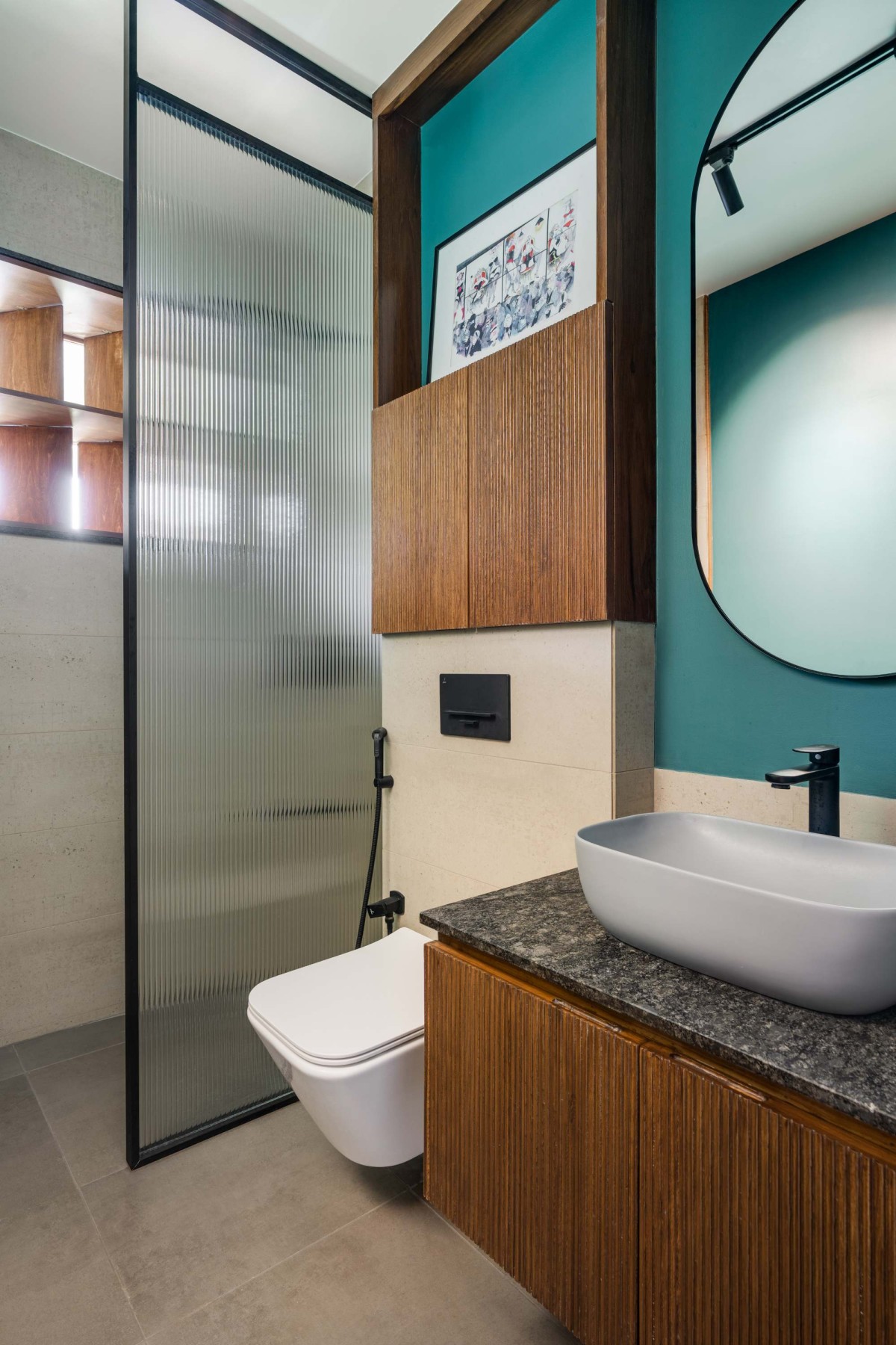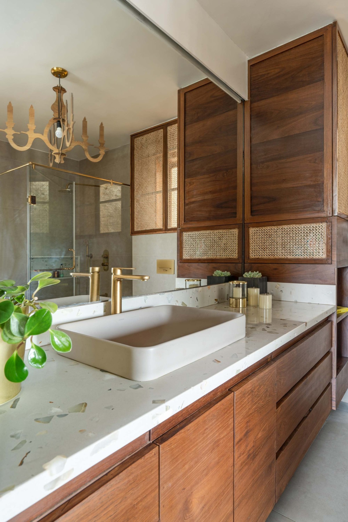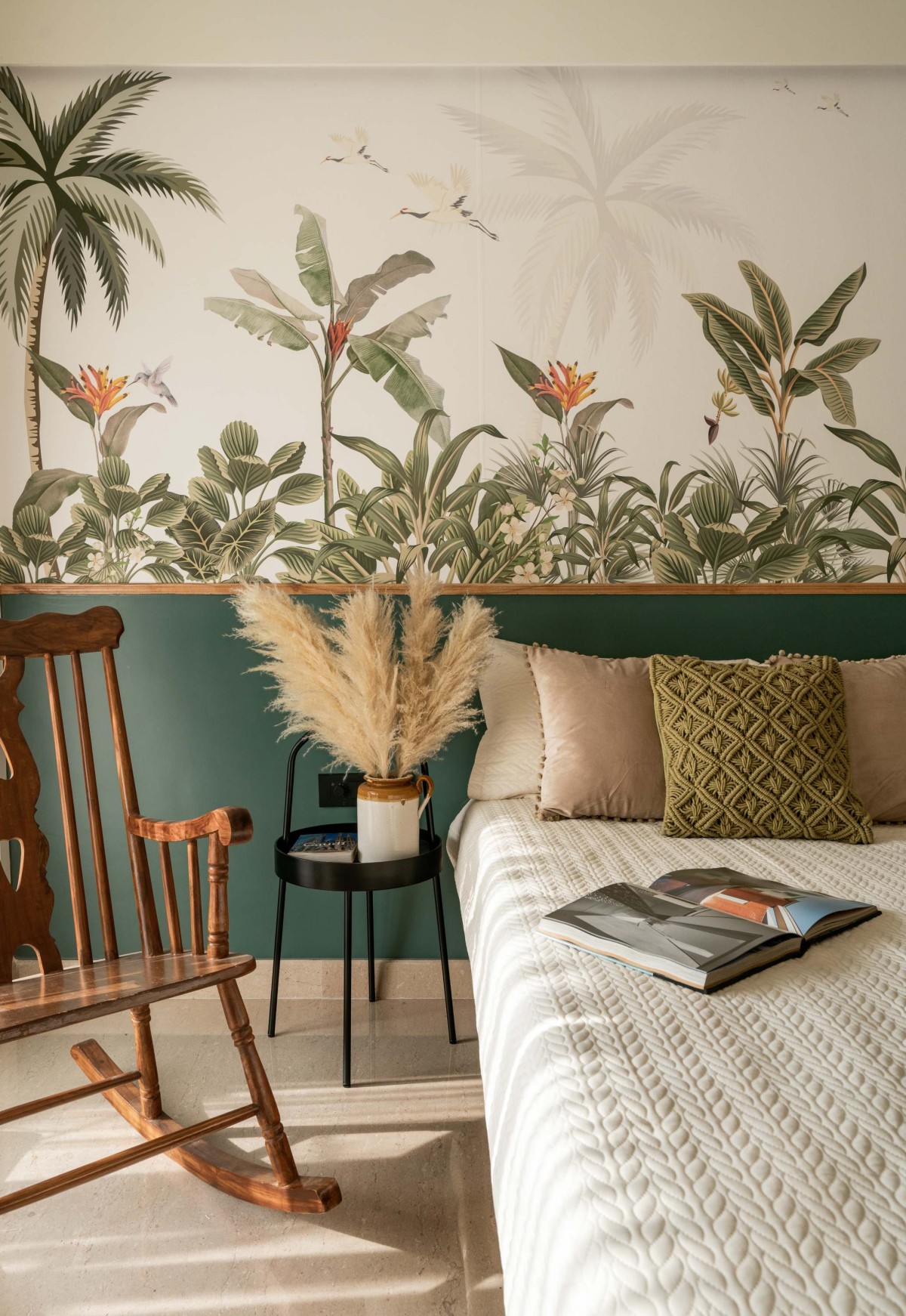 The upper floor forms the home’s retreat — an intimate, happy space where all bedrooms open onto an expansive 800 sq. ft. terrace. This outdoor extension serves multiple purposes, accommodating gatherings, workouts, work sessions, and moments of quiet connection with nature. The daughter’s room reflects her individuality — an expressive mix of brick textures, natural materials, and splashes of color, with ample room for her Lego creations and friends. The architects’ bedroom, on the other hand, is a poetic interplay of elements — a floating bed framed by three screen doors and a Sabyasachi wallpaper backdrop, allowing for varying spatial experiences of light, view, and privacy.