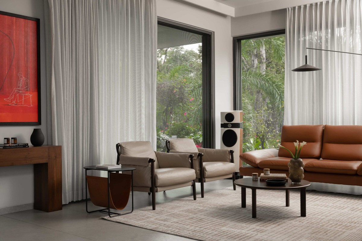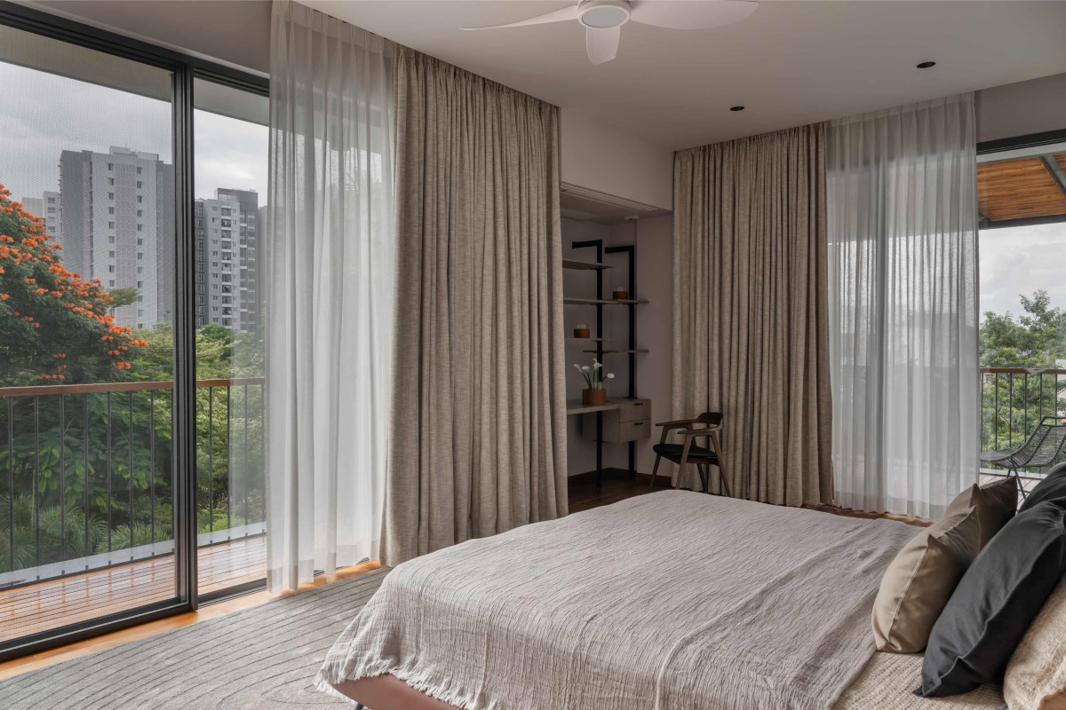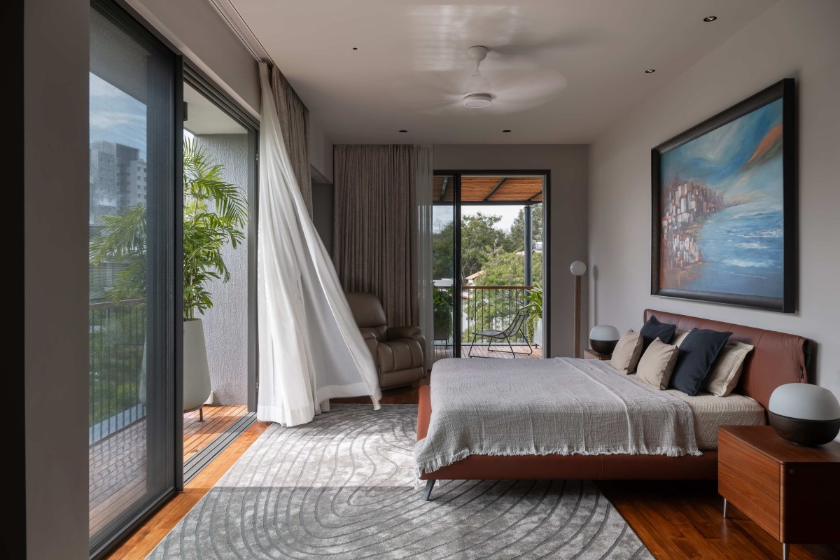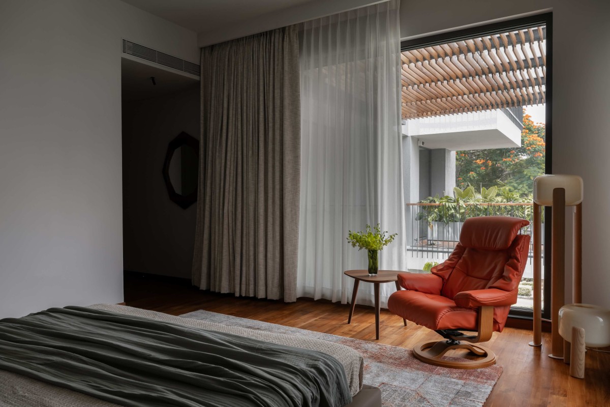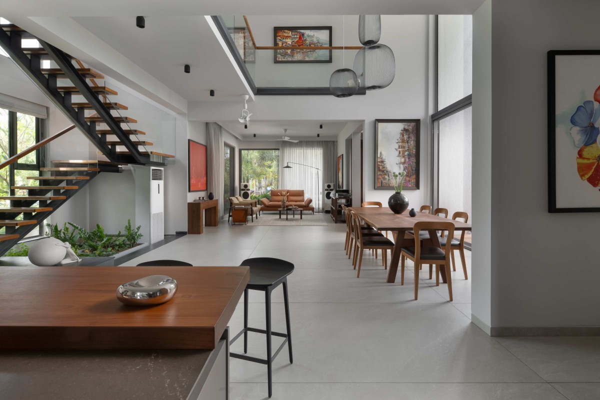 Located in the upmarket gated community of Beverly Hills in Bengaluru, the house was designed as the primary residence of Mr. Prasanth and family, with the lush green park view serving as the major focus. The clients’ love for gardening inspired the design, with the home oriented toward the lush green community park, creating a seamless connection with nature and making the plot feel larger through the borrowed openness of the park.