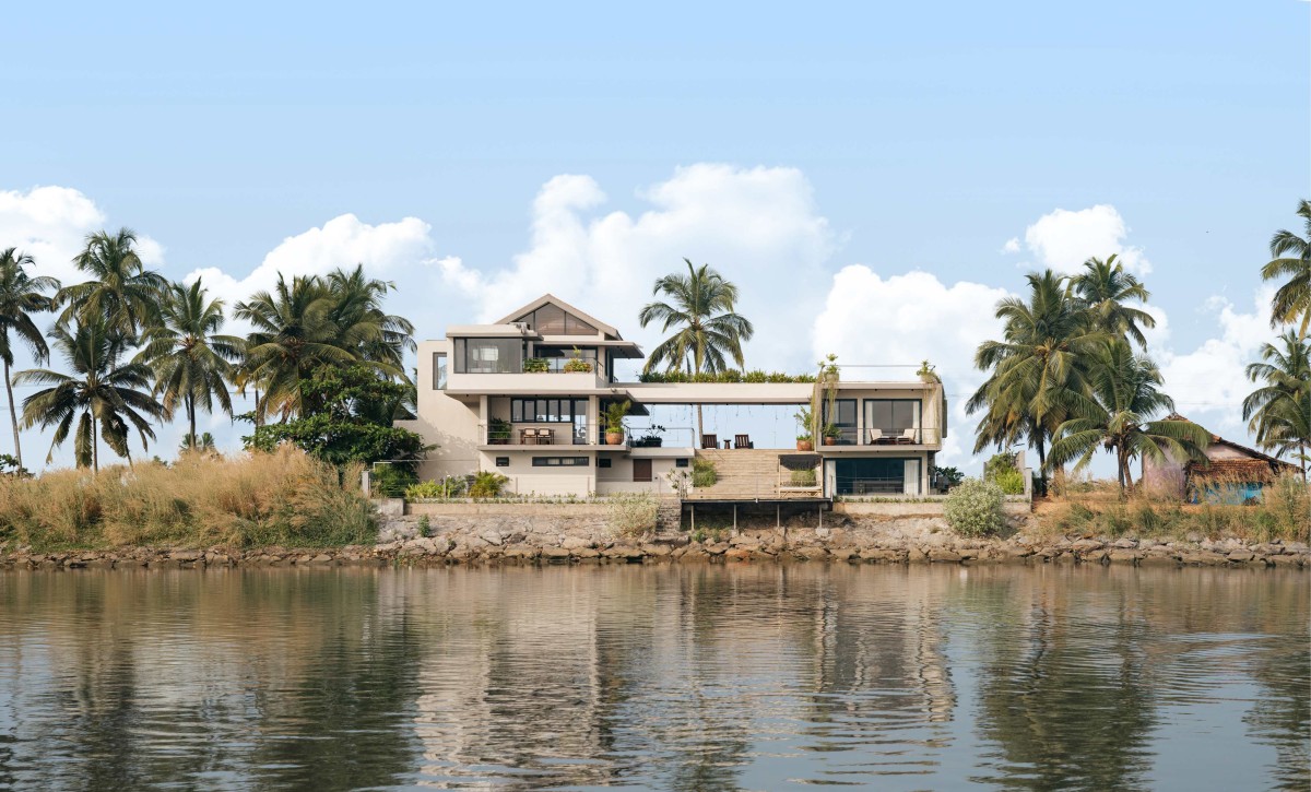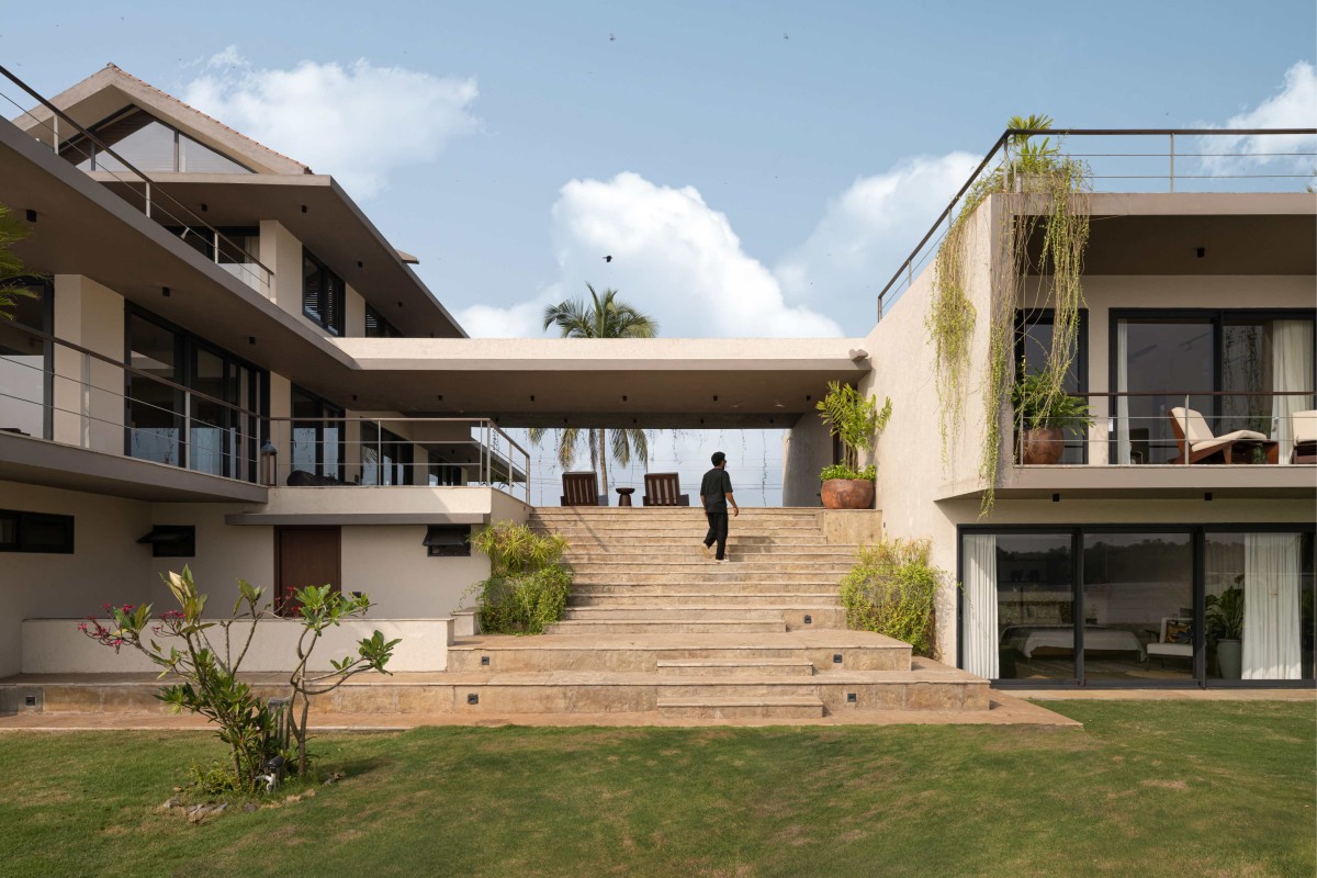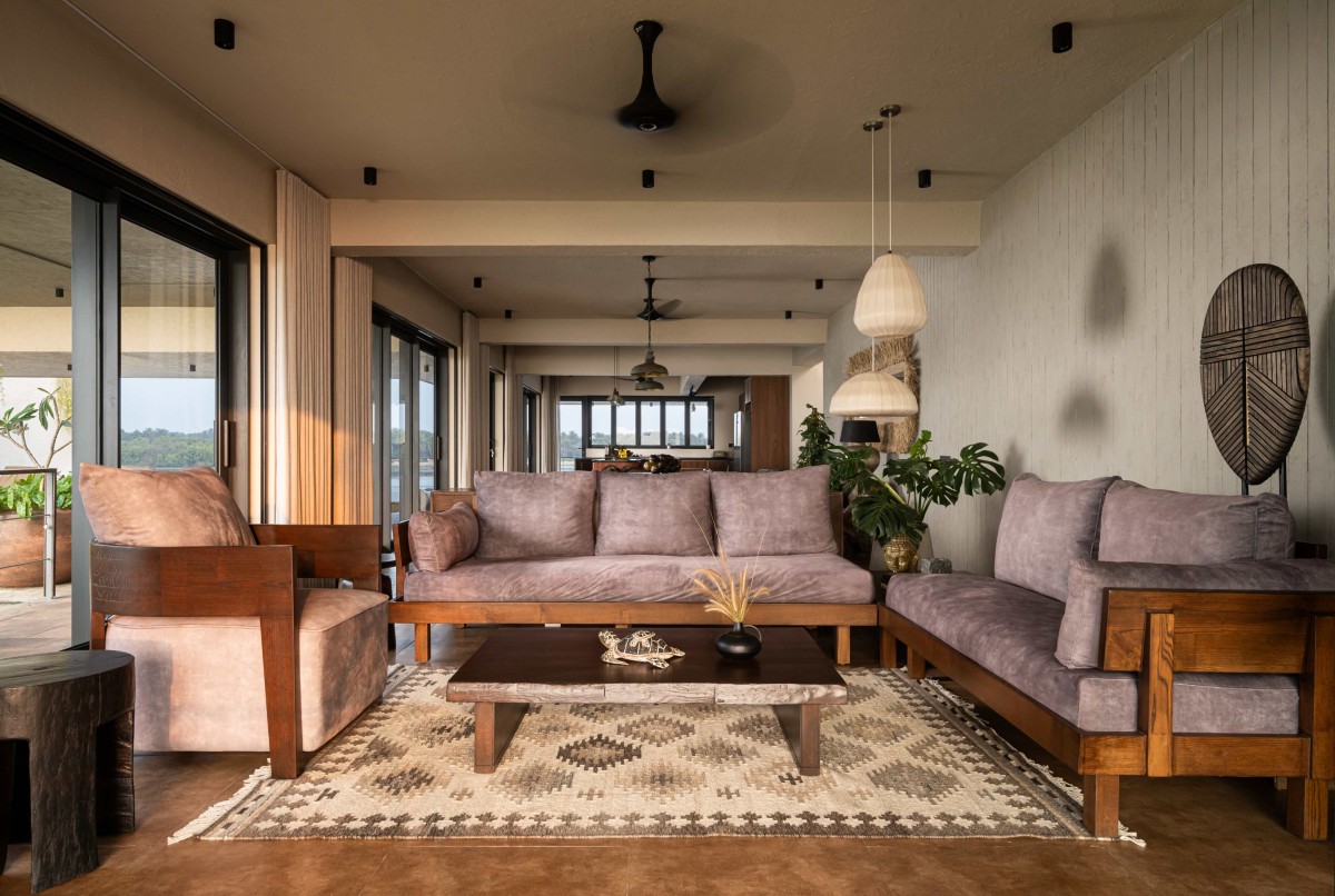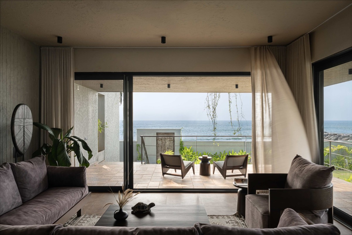 Living room to entrance deck view of Rooh by Thomas Parambil Architects