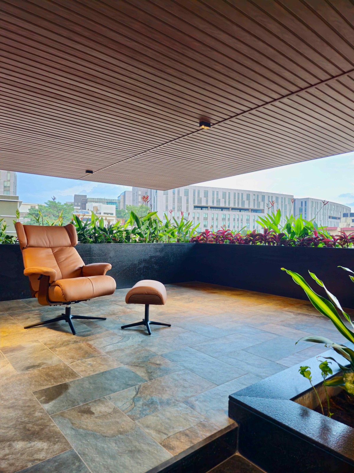 On the second floor, a striking cantilevered roof, adorned with PVC panels that mimic wood grain, introduces a dynamic contrast to the beige textured facade that provides cohesion throughout the design. The facade itself is characterized by L-shaped elements that enhance the horizontal geometry of the structure, while thoughtfully placed planters and balconies further enrich the environmental experience.