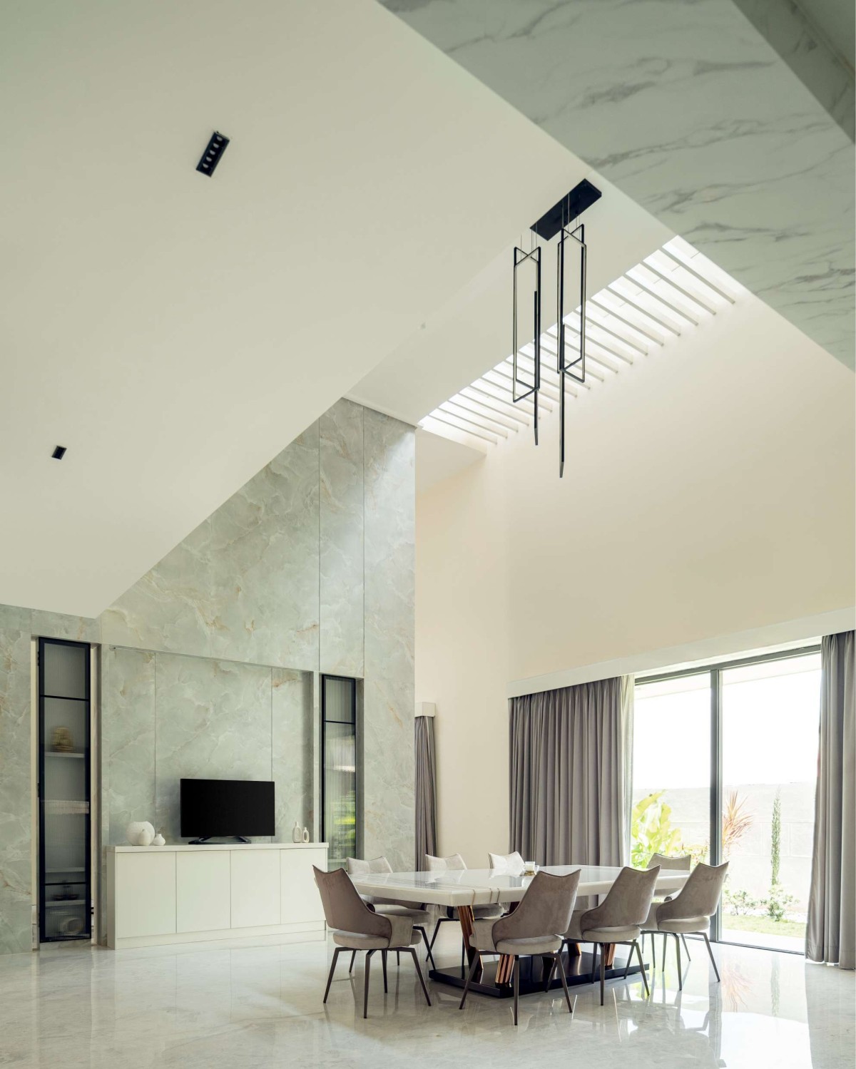 A hallmark of this residence is the double-height living and dining rooms, which create a visual narrative that links the diverse spaces within the home. Expansive windows and strategically placed skylights flood these areas with natural light, fostering a fluid transition between the interior and the lush exterior landscape.