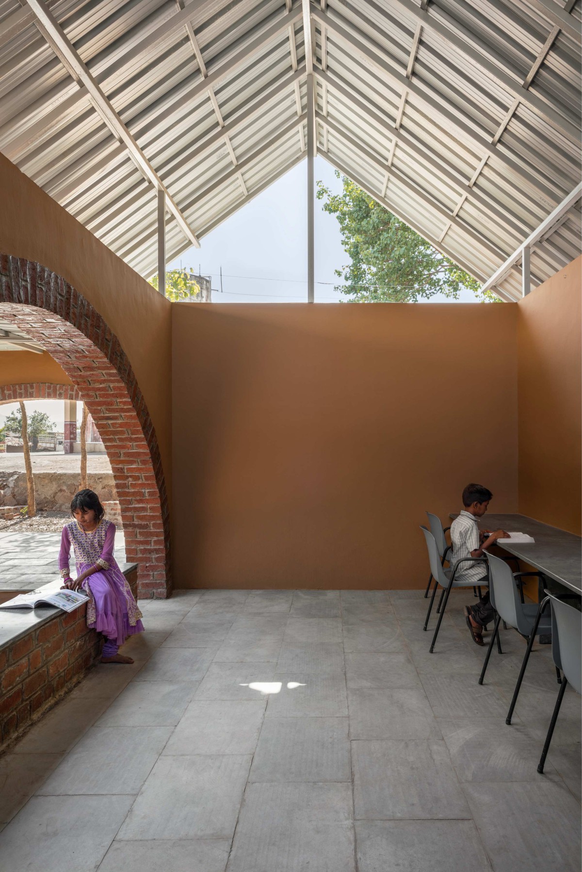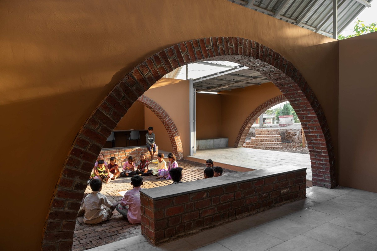 Being an NGO project, our design needed to be multifunctional, low-maintenance, and cost-effective. This presided over our choice of material and construction method. The entire structure is a load bearing with expansive arched openings. The pitched roof was made using corrugated metal sheets and the floor finish was done using locally available stone.