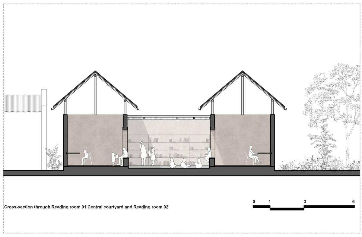 The core concept evolved into three covered spaces: two study areas and a book stacking space, concentric to a central court participatory to all other areas. All these placed on the existing plinth, a fourth pavilion was added at the front to create a semi-covered entrance and arrival space for the library. A series of steps guide visitors from the road to a lower level, transformed into an informal gathering space at the entrance. The first pavilion, featuring a generous opening with a load-bearing arch, extends a warm welcome. This covered verandah, intended for newspaper and magazine racks, invites the elderly to read and relax freely.