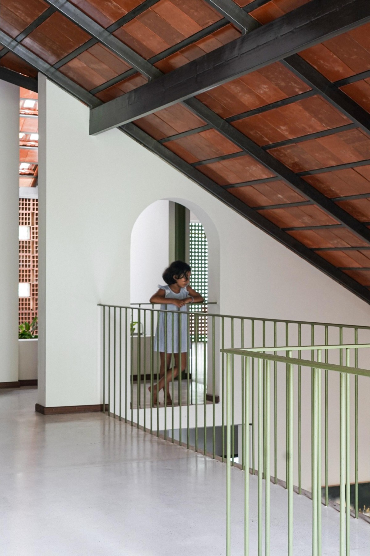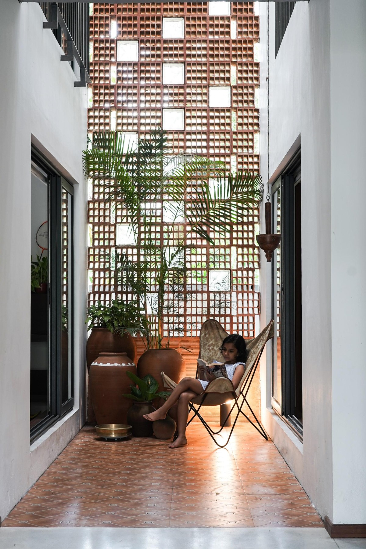 The courtyard is enclosed with a brick jali screen on the western side and topped with a skylight, allowing filtered daylight to penetrate deep into the house while reducing harsh solar heat gain. The perforated brick screen encourages cross ventilation and creates dynamic patterns of light and shadow that animate the interior spaces while improving thermal comfort.